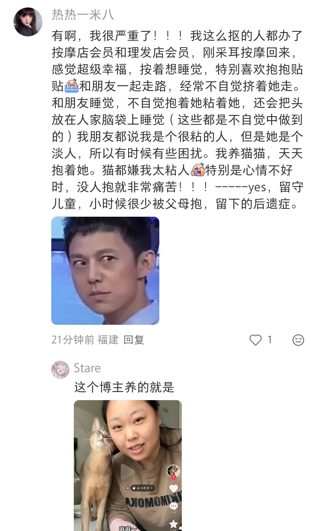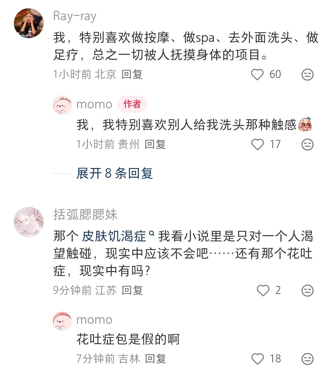 肌肤饥渴症,就是特别喜欢跟熟悉的人抱抱贴贴吗,还很喜欢按摩SPA
