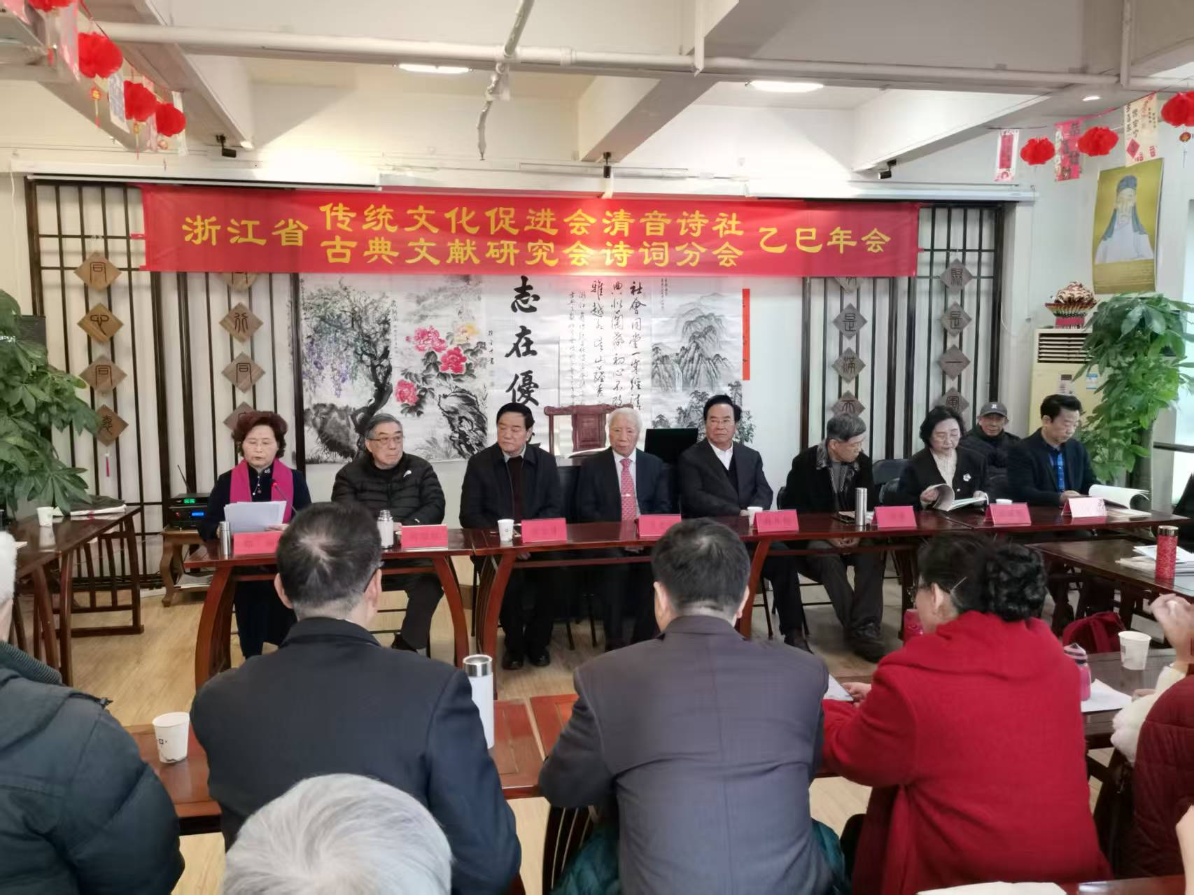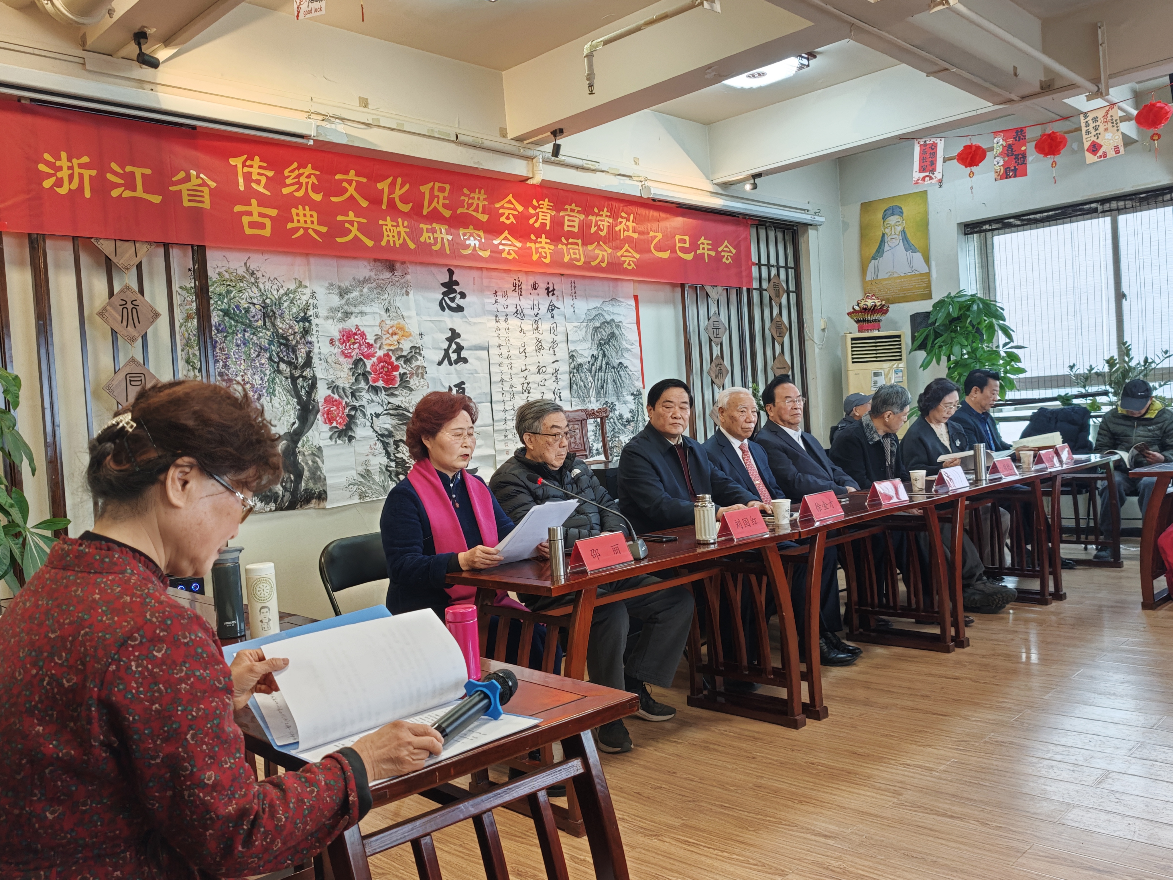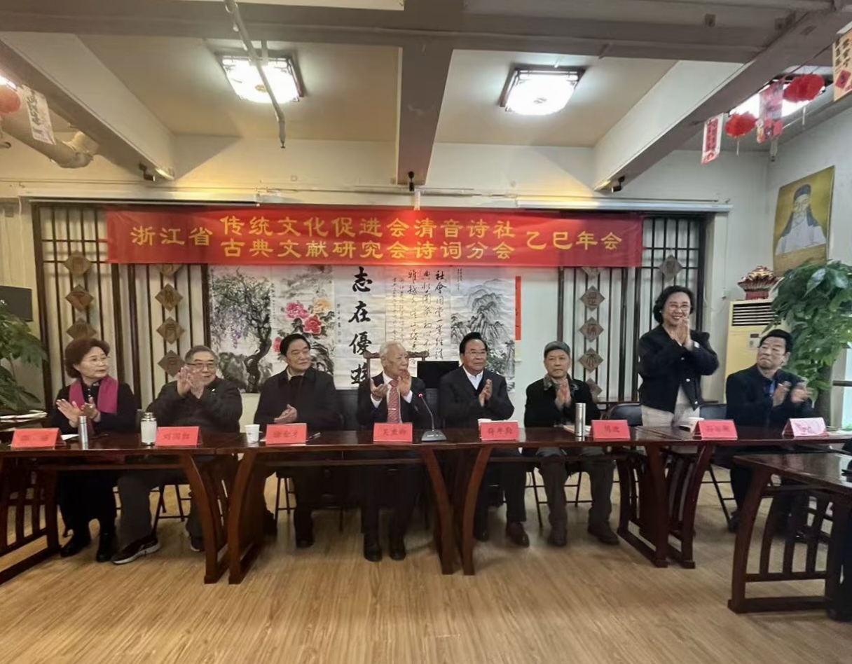 浙江省传统文化促进会清音诗社浙江省古典文献研究会诗词分会乙巳年会专辑 吴亚卿 浙江省传统文化促进会清音诗社浙江省古典文献研究会诗词分会乙巳年会 社会同堂一岁经,清音古典似兰馨。 初心不改弘风雅,越水吴山蕴秀灵。 吴虚谷 贺浙江省清音诗社与古典文献研究会诗词分会年会 冬月钱塘多胜事,同堂喜聚会贤良。 文承宋韵追珠月,心醉唐音寄锦章。 击节声中高格见,传薪席上逸兴长。 嘤鸣次第情犹笃,迎岁报春清气扬。 徐金才 清音诗社暨浙江省古典文献研究会诗词分会乙巳年会寄语 骚坛挚友谊相稠,聚首钱塘嘉汇楼。 辞岁同承千载韵,迎春共醉一江秋。 毫端自有风云气,笔底常涵今古愁。 志在优游寻雅趣,从容淡定乐悠悠。 刘国红 贺浙江省传统文化促进会清音诗社浙江省古典文献研究会诗词分会乙已年会 岁末年终喜报频,新雏老凤共争春。 寻幽怀古雅音奏,国事讴歌最动人。 邵丽 唐多令·省传统文化促进会清音诗社省古典文献研究会诗词分会乙巳年会赋此 诗兴接星津,幽怀荡月轮。指顾间、吟苑寻珍。只为传承扶大雅,吟玉唾,写霜筠。 笔底古香存,杯前时景真。共登楼、休负熙辰。待到苏堤花正好,莺语软,柳眉新。 李南 贺清音古典两诗社年会 清音古典聚贤俦,送巳迎騏雅韵流。 回首华章皆胜事,明朝更上一层楼。 胡芳霞 次吴师亚卿先生《浙江省传统文化促进会清音诗社浙江省古典文献研究会诗词分会乙巳年会》元玉 漫步吟坛几度经,相逢犹是觉温馨。 且将冰雪研文墨,更冀诗心发性灵。 陶益萍 满庭芳·浙江省传统文化促进会清音诗社浙江省古典文献研究会诗词分会乙巳年会 喜气穿空,祥光映日,雅音回荡华庭。书文陈绩,夙素任人评。更有丹青义拍,墨香里、高格留名。诵吟处,诗琴共舞,相与骋胜情。 叹良辰悄逝,欢娱留影,宾客飞觥。宛自得,醉红漫启心程。待把豪兴共付,风雨里、笃学躬耕。期来岁,追奔佳境,再古韵新迎。 高玲 参加清音诗社暨省古典文献研究会诗词分会 乙巳年会漫成 恰迎腊月晴空暖,骨朵梅枝浮暗香。 相聚书楼心喜悦,吟哦诗友韵悠扬。 展望骏马奋蹄健,回顾升卿馈岁长。 翰墨丹青歌盛世,擎樽共贺续华章。 赵玲玲 浣溪沙·浙江省传统文化促进会清音诗社浙江省古典文献研究会诗词分会乙巳年会满座高朋带笑听 。清音金石绕嘉屏 。吟旌岁杪汇群英 。 击节长歌风物美,擎杯漫话契兰情 。来年再续漱琼声。 胡仄媛 青玉案•清音诗社古典文献研究会诗词分会乙已年会有怀 一年屈指流光浅。墨香里、吟朋伴。拈字分题星斗转。唐风宋韵,心中缱绻。倾诉诗情满。 虽惊鬓白斜阳晚。午夜灯前总相暖。每向芸窗搜句遍。清音逸兴,但存痴愿。笺底开春苑。 孔祝君 贺清音诗社乙己年会圆满成功 华堂乐聚众骚友,雅会书楼韵碧芳。 唐宋古诗佳语意,马年策驾向前昂。 吴宝珍 贺淸音诗社岁华 旧岁墨痕犹未干,迎春雅集满诗坛。 清音守正承文脉,妙笔生花著锦翰。 载酒浙山寻古迹,横琴湘水伴新欢。 同心共振骚谈志,更向云峰万丈宽。 卢江良 参加浙江省古典文献研究会诗词分会乙巳年会有感 乙巳将阑丙午连,骚朋同咏共邀贤。 吟诗作赋迎新岁,舞墨挥毫续锦篇。 屠耕夫 贺清音诗社古典文献诗词分会年会 诗社高朋聚一堂,遗风古典墨中藏。 清音漫诵歌嘉会,文脉传承续锦章。 宋伦章 参加清音诗社古典文献研究会诗词分会乙已年会有感 浙水潮生集雅贤,清音振叶破尘烟。 笔皴墨韵追唐月,弦拨诗心叩宋天。 拍盏争襄千卷业,吟歌竞掷五游篇。 薪传不辍青云路,再擘吟坛续慧缘。 注:“五游篇”特指以三国魏·曹植《五游咏》为代表的古典游仙诗典范,后泛指意境瑰奇、才情卓绝的文人佳作。 刘道渺 贺清音诗社古典文献研究会诗词分会乙巳年会 岁杪依依正吉辰,欢声雅意一堂春。 且期节后卌年庆,步武前贤理趣真。 陈学诚 渔歌子·清音诗社年会 清社轩堂聚俊良,雅朋相与韵流芳。谈创获,论新章 ,马年奋辔韵途长。 叶永度 清音诗社乙巳年会 华堂乐聚众师生, 吟赏诗词高雅情。 妙语清音饶古趣 ,艺无止境永前行。 孙文萍 祝贺清音诗社乙巳年会圆满成功 冷枝梅艳入眸新,太易书楼聚众宾。 唐韵宋词怀寄远,清音雅会百花春。 周玲 蝶恋花·遥祝太易书院诗会圆满 忆昔书堂歌评弹 ,韵绕梁间 ,诗友相酬劝。蝶恋花香情未散, 暗霜侵鬓流年换。 耄耋居家心暗叹 ,太易厅遥 ,神逐书斋院。遥祝群贤吟兴满 ,新词迭出春光灿。 注: 评弹《蝶恋花》程桂兰原唱 ,本人翻唱。 刘效能 浪淘沙·清音诗社乙已年会有寄 何处觅晴岚 ,诗意江南 。枝头梅朵寄书函,扶雅清音歌盛世 ,诵语盈帘。 嘉会共君酣 ,华岁骖骖 。吟心似旧笔中添,明日东风杨柳岸, 剪得春衫。 王立海 乙巳年会聚 乙巳隆冬年会聚,纵横雅韵忆春秋。 佳朋滿座胸怀远,古典清音更上楼。 郭秋莲 采桑子·遥祝清音诗社乙巳年会圆满成功 诗朋骚客华堂聚,词韵流芳 。梅绽馨香 。总结蛇年赞雅章。 春秋四季歌盛世,骑马争光 。气贯三江 。遥祝清音再骋翔。 梁华 共奋骧 并蒂诗莲辞乙巳,清音荟萃暖情肠。 小梅流韵钱塘阔,种玉新程共奋骧。 黄如春 清音诗社乙巳年会 红梅初放满堂春,书院盈盈风雅人。 古韵悠长呈瑞气,丹青赋志贺新辰。 何小英 鹧鸪天·清音诗社乙巳年会 绛笔钱塘聚晓堂,清音激荡裂寒霜。座分雅士垂髫至,袖染松烟今古香。 擎星