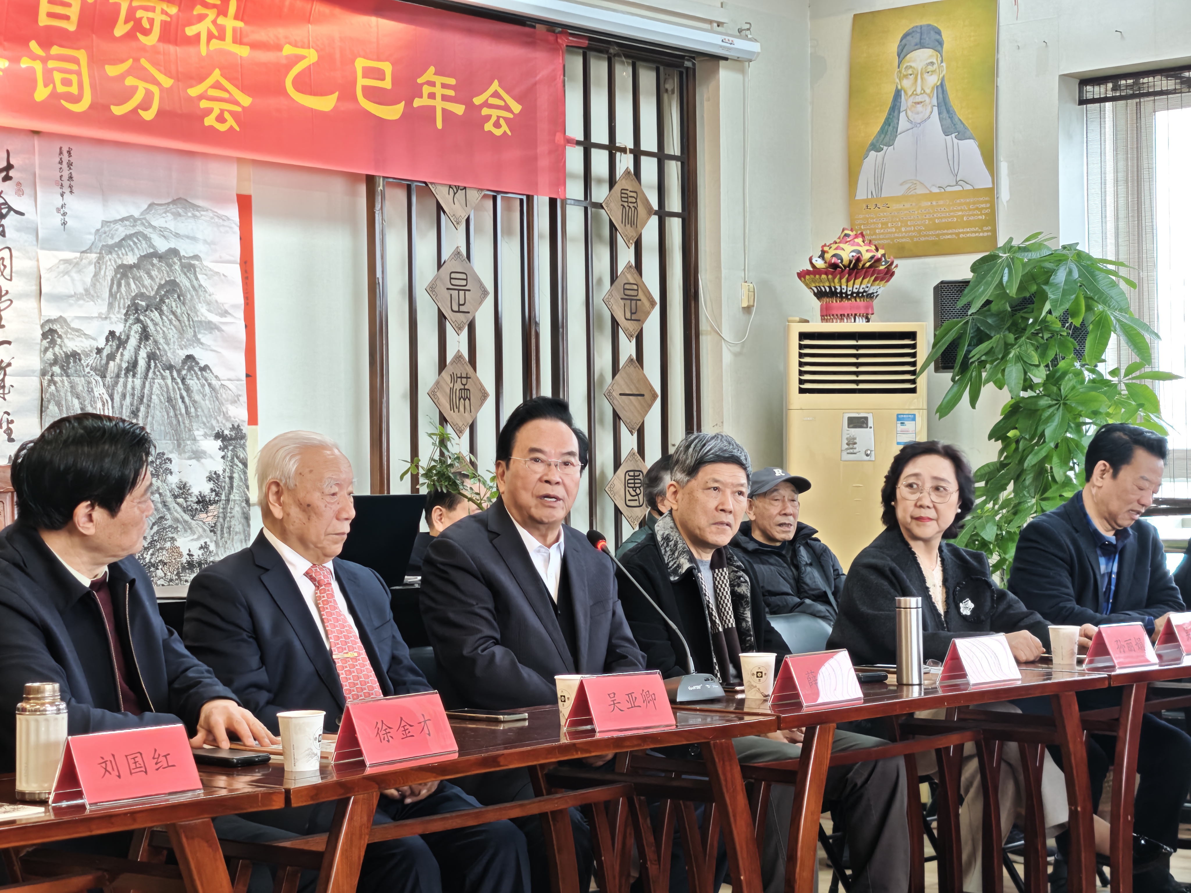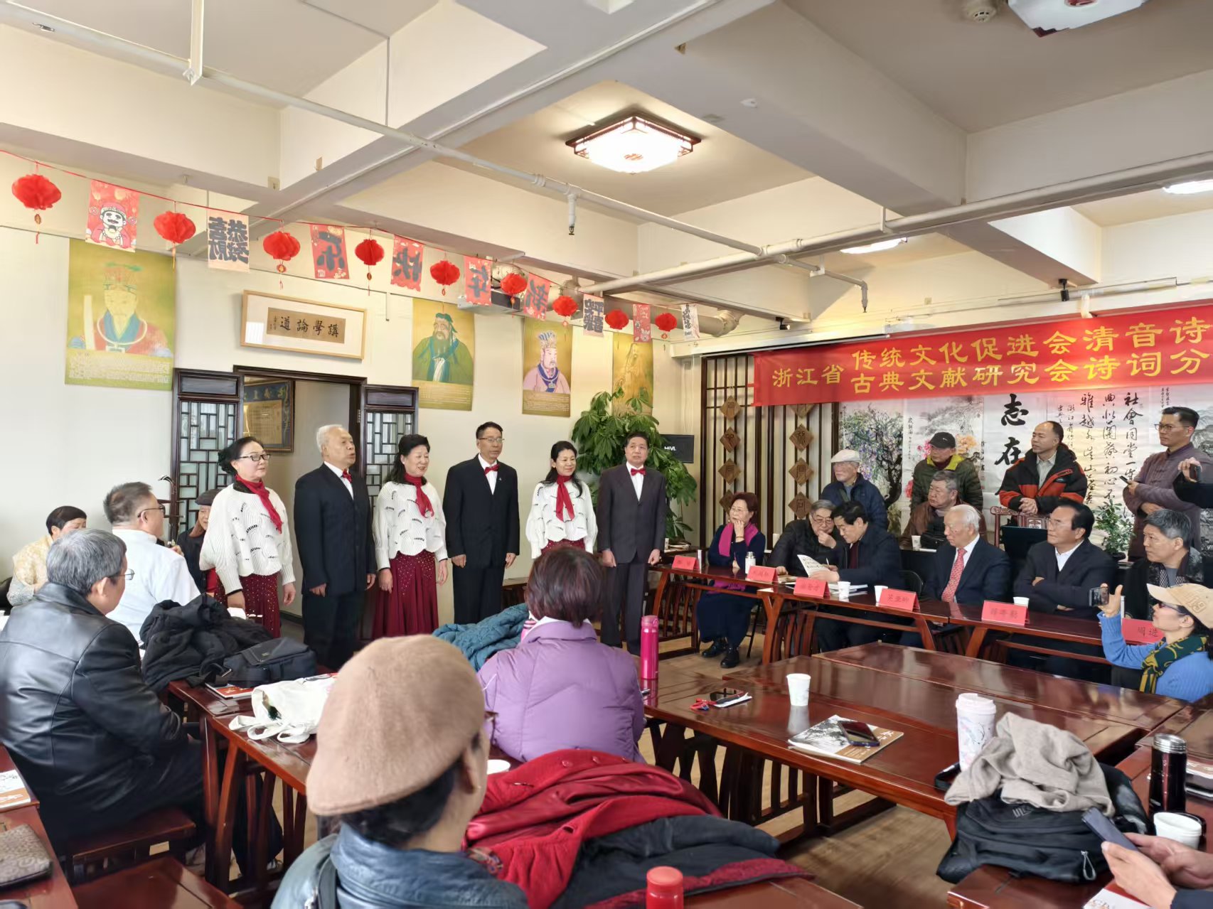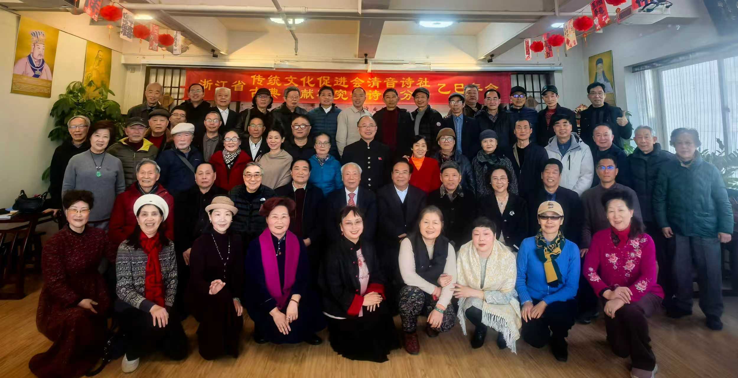 浙江省传统文化促进会清音诗社浙江省古典文献研究会诗词分会乙巳年会专辑 吴亚卿 浙江省传统文化促进会清音诗社浙江省古典文献研究会诗词分会乙巳年会 社会同堂一岁经,清音古典似兰馨。 初心不改弘风雅,越水吴山蕴秀灵。 吴虚谷 贺浙江省清音诗社与古典文献研究会诗词分会年会 冬月钱塘多胜事,同堂喜聚会贤良。 文承宋韵追珠月,心醉唐音寄锦章。 击节声中高格见,传薪席上逸兴长。 嘤鸣次第情犹笃,迎岁报春清气扬。 徐金才 清音诗社暨浙江省古典文献研究会诗词分会乙巳年会寄语 骚坛挚友谊相稠,聚首钱塘嘉汇楼。 辞岁同承千载韵,迎春共醉一江秋。 毫端自有风云气,笔底常涵今古愁。 志在优游寻雅趣,从容淡定乐悠悠。 刘国红 贺浙江省传统文化促进会清音诗社浙江省古典文献研究会诗词分会乙已年会 岁末年终喜报频,新雏老凤共争春。 寻幽怀古雅音奏,国事讴歌最动人。 邵丽 唐多令·省传统文化促进会清音诗社省古典文献研究会诗词分会乙巳年会赋此 诗兴接星津,幽怀荡月轮。指顾间、吟苑寻珍。只为传承扶大雅,吟玉唾,写霜筠。 笔底古香存,杯前时景真。共登楼、休负熙辰。待到苏堤花正好,莺语软,柳眉新。 李南 贺清音古典两诗社年会 清音古典聚贤俦,送巳迎騏雅韵流。 回首华章皆胜事,明朝更上一层楼。 胡芳霞 次吴师亚卿先生《浙江省传统文化促进会清音诗社浙江省古典文献研究会诗词分会乙巳年会》元玉 漫步吟坛几度经,相逢犹是觉温馨。 且将冰雪研文墨,更冀诗心发性灵。 陶益萍 满庭芳·浙江省传统文化促进会清音诗社浙江省古典文献研究会诗词分会乙巳年会 喜气穿空,祥光映日,雅音回荡华庭。书文陈绩,夙素任人评。更有丹青义拍,墨香里、高格留名。诵吟处,诗琴共舞,相与骋胜情。 叹良辰悄逝,欢娱留影,宾客飞觥。宛自得,醉红漫启心程。待把豪兴共付,风雨里、笃学躬耕。期来岁,追奔佳境,再古韵新迎。 高玲 参加清音诗社暨省古典文献研究会诗词分会 乙巳年会漫成 恰迎腊月晴空暖,骨朵梅枝浮暗香。 相聚书楼心喜悦,吟哦诗友韵悠扬。 展望骏马奋蹄健,回顾升卿馈岁长。 翰墨丹青歌盛世,擎樽共贺续华章。 赵玲玲 浣溪沙·浙江省传统文化促进会清音诗社浙江省古典文献研究会诗词分会乙巳年会满座高朋带笑听 。清音金石绕嘉屏 。吟旌岁杪汇群英 。 击节长歌风物美,擎杯漫话契兰情 。来年再续漱琼声。 胡仄媛 青玉案•清音诗社古典文献研究会诗词分会乙已年会有怀 一年屈指流光浅。墨香里、吟朋伴。拈字分题星斗转。唐风宋韵,心中缱绻。倾诉诗情满。 虽惊鬓白斜阳晚。午夜灯前总相暖。每向芸窗搜句遍。清音逸兴,但存痴愿。笺底开春苑。 孔祝君 贺清音诗社乙己年会圆满成功 华堂乐聚众骚友,雅会书楼韵碧芳。 唐宋古诗佳语意,马年策驾向前昂。 吴宝珍 贺淸音诗社岁华 旧岁墨痕犹未干,迎春雅集满诗坛。 清音守正承文脉,妙笔生花著锦翰。 载酒浙山寻古迹,横琴湘水伴新欢。 同心共振骚谈志,更向云峰万丈宽。 卢江良 参加浙江省古典文献研究会诗词分会乙巳年会有感 乙巳将阑丙午连,骚朋同咏共邀贤。 吟诗作赋迎新岁,舞墨挥毫续锦篇。 屠耕夫 贺清音诗社古典文献诗词分会年会 诗社高朋聚一堂,遗风古典墨中藏。 清音漫诵歌嘉会,文脉传承续锦章。 宋伦章 参加清音诗社古典文献研究会诗词分会乙已年会有感 浙水潮生集雅贤,清音振叶破尘烟。 笔皴墨韵追唐月,弦拨诗心叩宋天。 拍盏争襄千卷业,吟歌竞掷五游篇。 薪传不辍青云路,再擘吟坛续慧缘。 注:“五游篇”特指以三国魏·曹植《五游咏》为代表的古典游仙诗典范,后泛指意境瑰奇、才情卓绝的文人佳作。 刘道渺 贺清音诗社古典文献研究会诗词分会乙巳年会 岁杪依依正吉辰,欢声雅意一堂春。 且期节后卌年庆,步武前贤理趣真。 陈学诚 渔歌子·清音诗社年会 清社轩堂聚俊良,雅朋相与韵流芳。谈创获,论新章 ,马年奋辔韵途长。 叶永度 清音诗社乙巳年会 华堂乐聚众师生, 吟赏诗词高雅情。 妙语清音饶古趣 ,艺无止境永前行。 孙文萍 祝贺清音诗社乙巳年会圆满成功 冷枝梅艳入眸新,太易书楼聚众宾。 唐韵宋词怀寄远,清音雅会百花春。 周玲 蝶恋花·遥祝太易书院诗会圆满 忆昔书堂歌评弹 ,韵绕梁间 ,诗友相酬劝。蝶恋花香情未散, 暗霜侵鬓流年换。 耄耋居家心暗叹 ,太易厅遥 ,神逐书斋院。遥祝群贤吟兴满 ,新词迭出春光灿。 注: 评弹《蝶恋花》程桂兰原唱 ,本人翻唱。 刘效能 浪淘沙·清音诗社乙已年会有寄 何处觅晴岚 ,诗意江南 。枝头梅朵寄书函,扶雅清音歌盛世 ,诵语盈帘。 嘉会共君酣 ,华岁骖骖 。吟心似旧笔中添,明日东风杨柳岸, 剪得春衫。 王立海 乙巳年会聚 乙巳隆冬年会聚,纵横雅韵忆春秋。 佳朋滿座胸怀远,古典清音更上楼。 郭秋莲 采桑子·遥祝清音诗社乙巳年会圆满成功 诗朋骚客华堂聚,词韵流芳 。梅绽馨香 。总结蛇年赞雅章。 春秋四季歌盛世,骑马争光 。气贯三江 。遥祝清音再骋翔。 梁华 共奋骧 并蒂诗莲辞乙巳,清音荟萃暖情肠。 小梅流韵钱塘阔,种玉新程共奋骧。 黄如春 清音诗社乙巳年会 红梅初放满堂春,书院盈盈风雅人。 古韵悠长呈瑞气,丹青赋志贺新辰。 何小英 鹧鸪天·清音诗社乙巳年会 绛笔钱塘聚晓堂,清音激荡裂寒霜。座分雅士垂髫至,袖染松烟今古香。 擎星