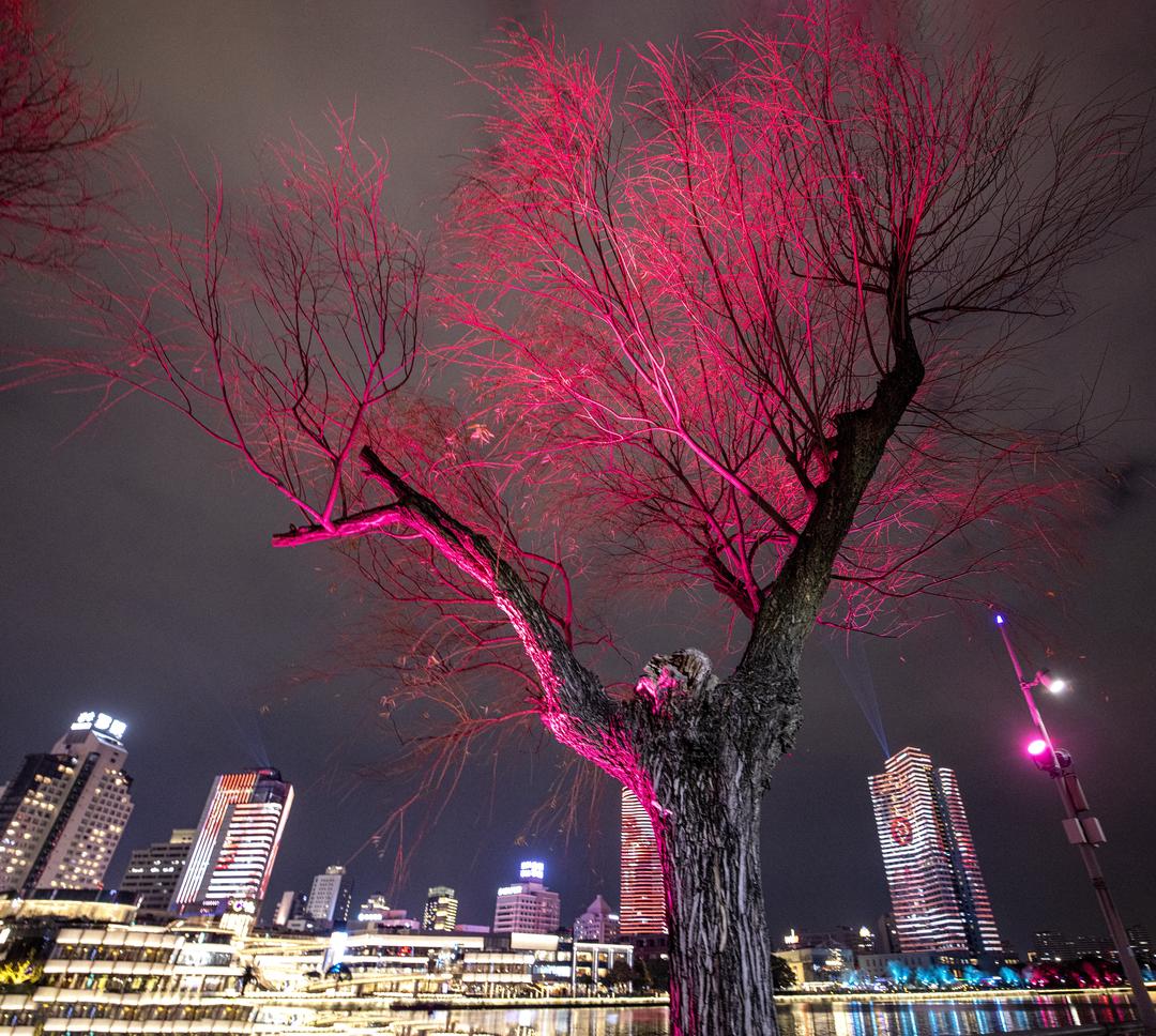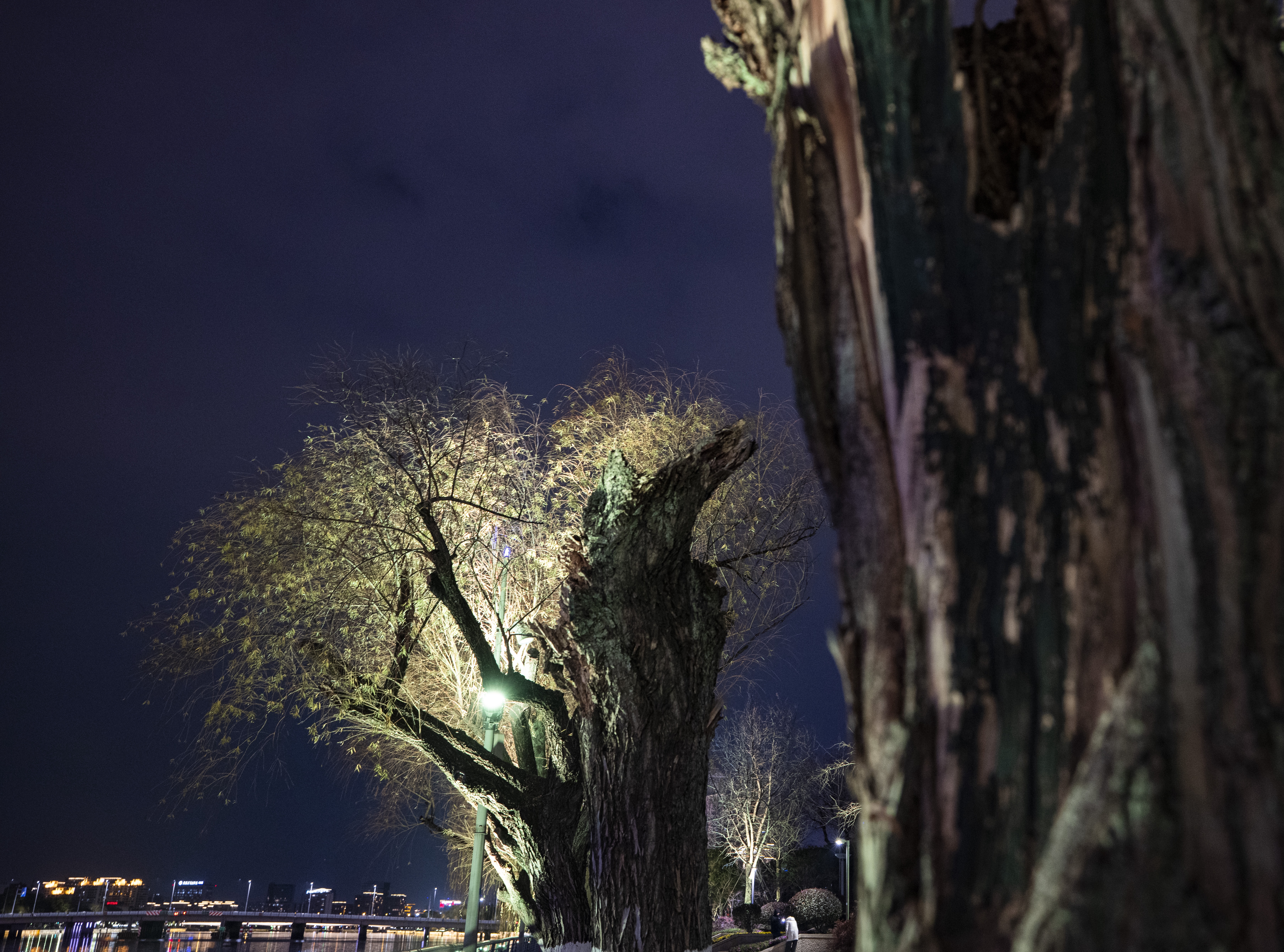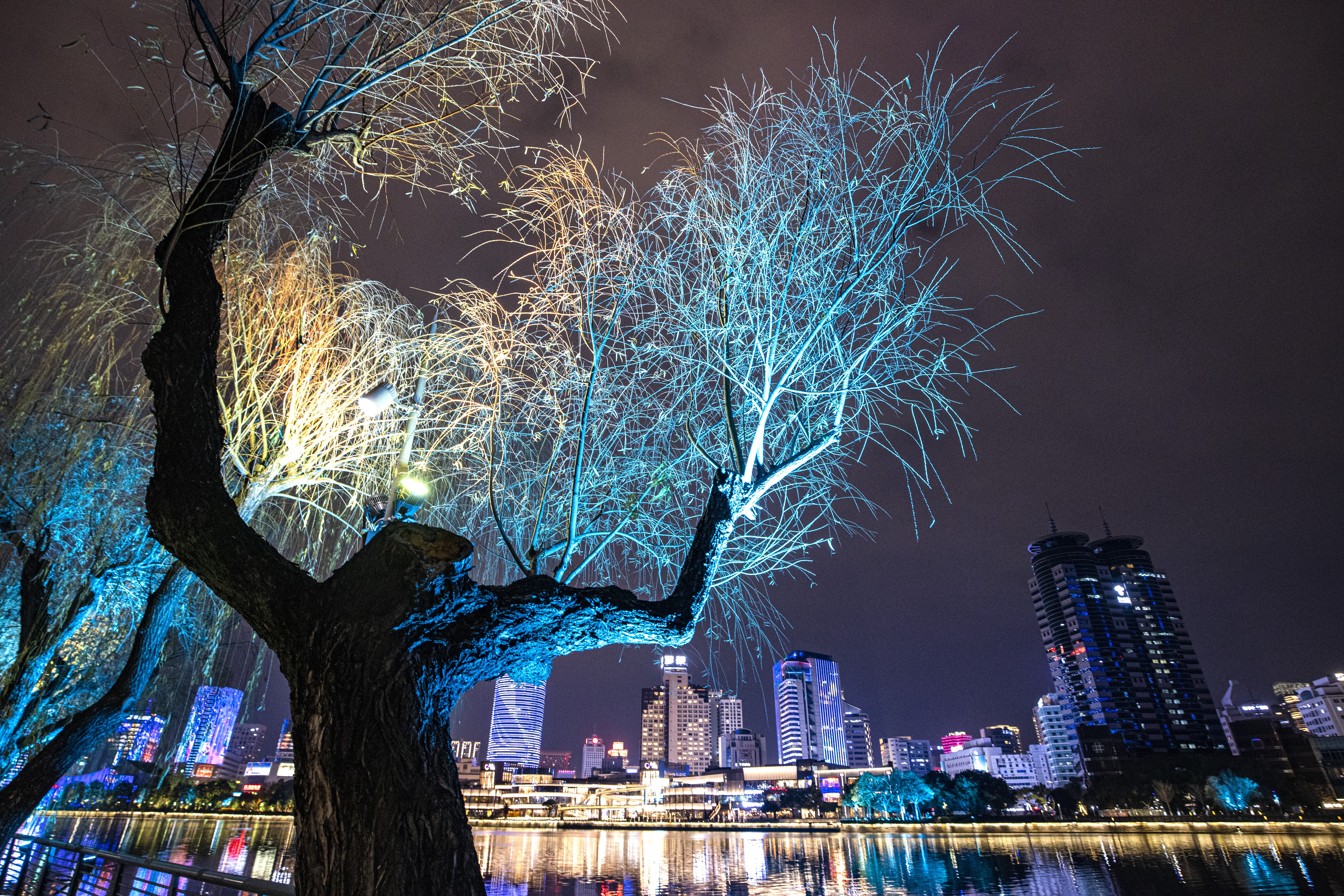 冬夜里的岸畔老树,被灯光染成了一首诗。 一半是蓝金交织的温柔夜曲,一半是绯红燃烧的热烈心跳,还有暖黄光斑里沉默的守望。 城市灯火在水面铺成星河,树影与光影缠绵,原来冬天的萧瑟,也能被晕染得如此浪漫。