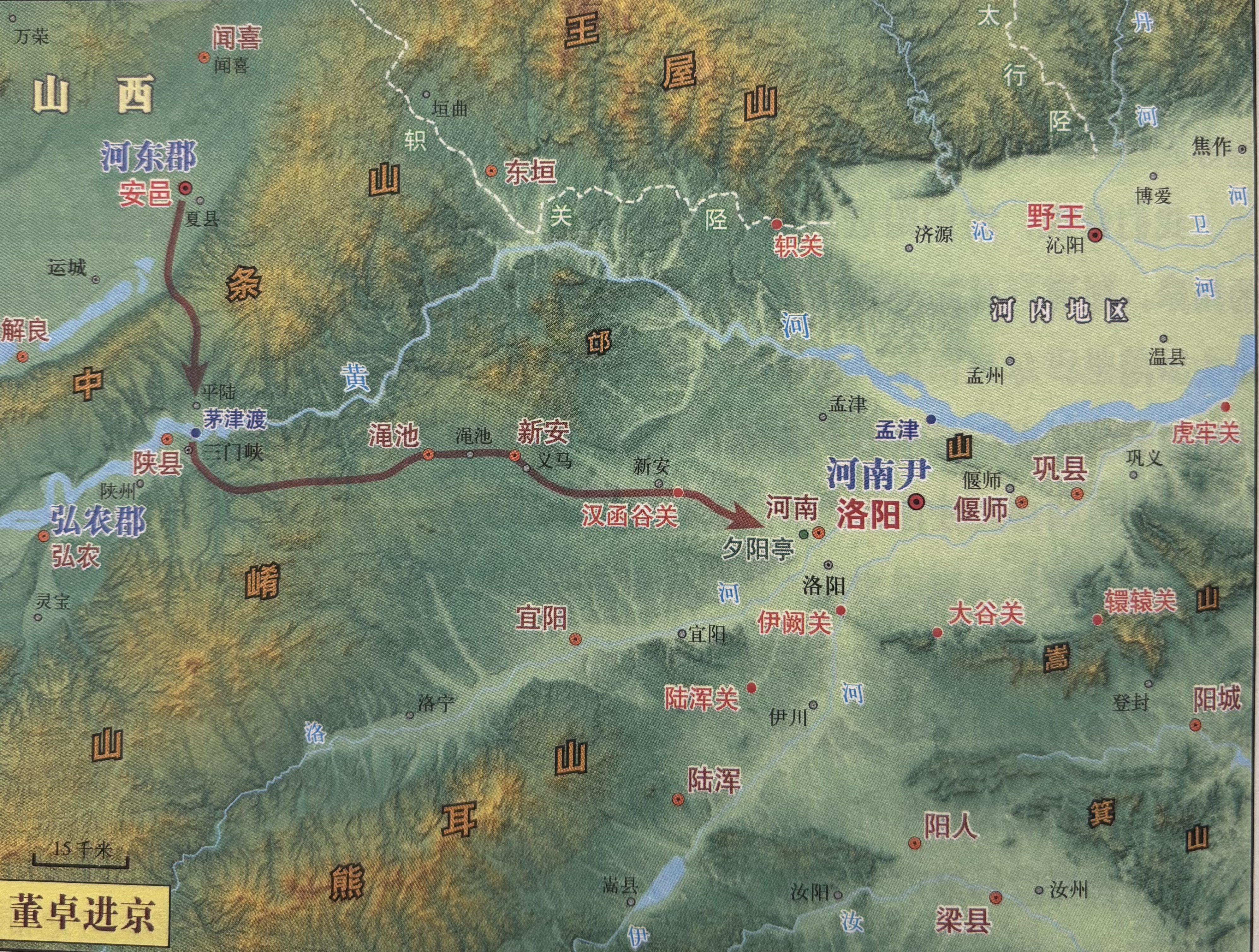 董卓进京,从安邑南下,翻过中条山,由茅津渡过黄河,沿崤函古道往东而来。这条路也是春秋时期晋国假途灭虢的路,也是秦国东出函谷的路。 董卓在北邙山救下少帝和陈留王,废少帝为弘农王,立陈留王刘协为帝,即汉献帝。至此,董卓权倾朝野。