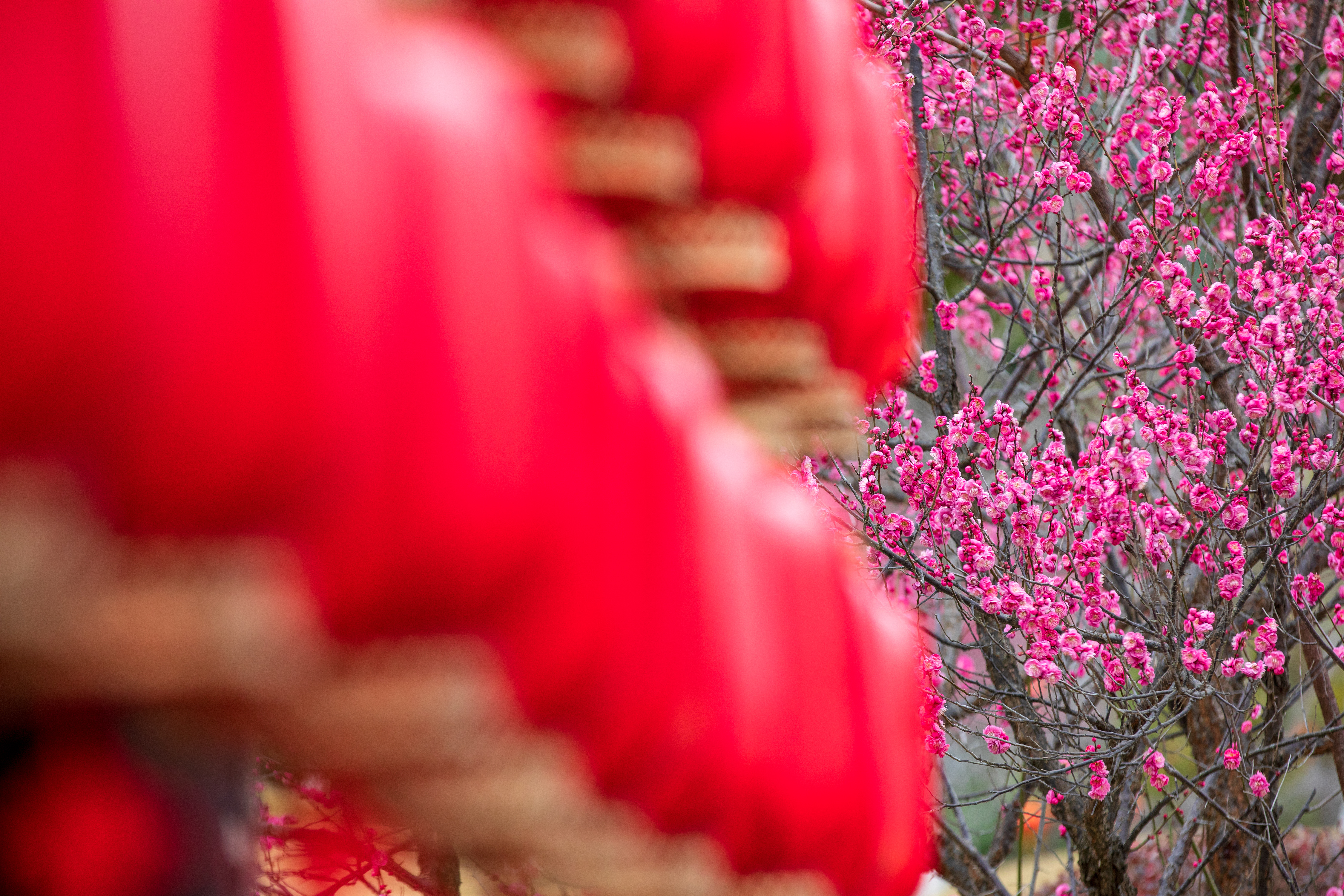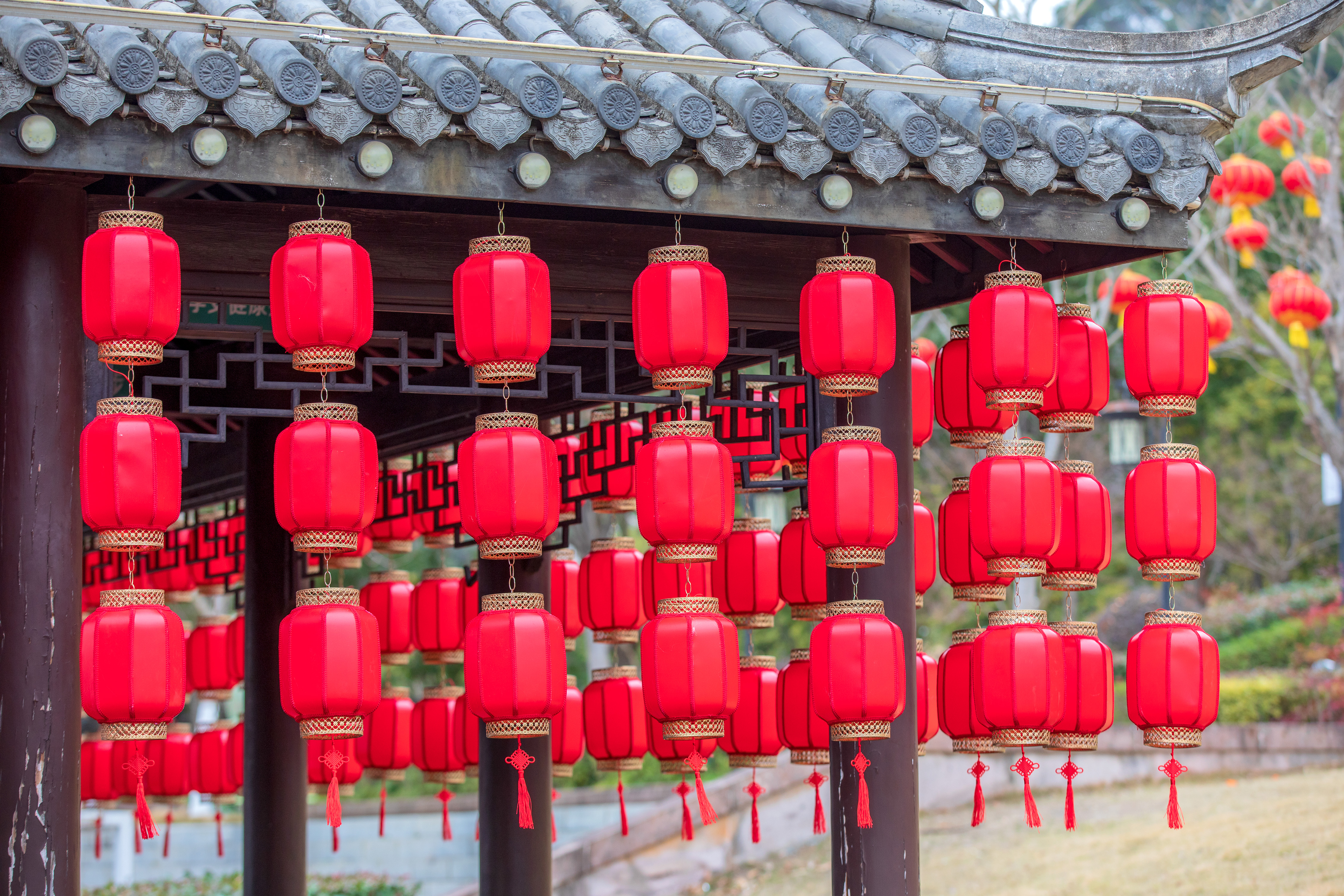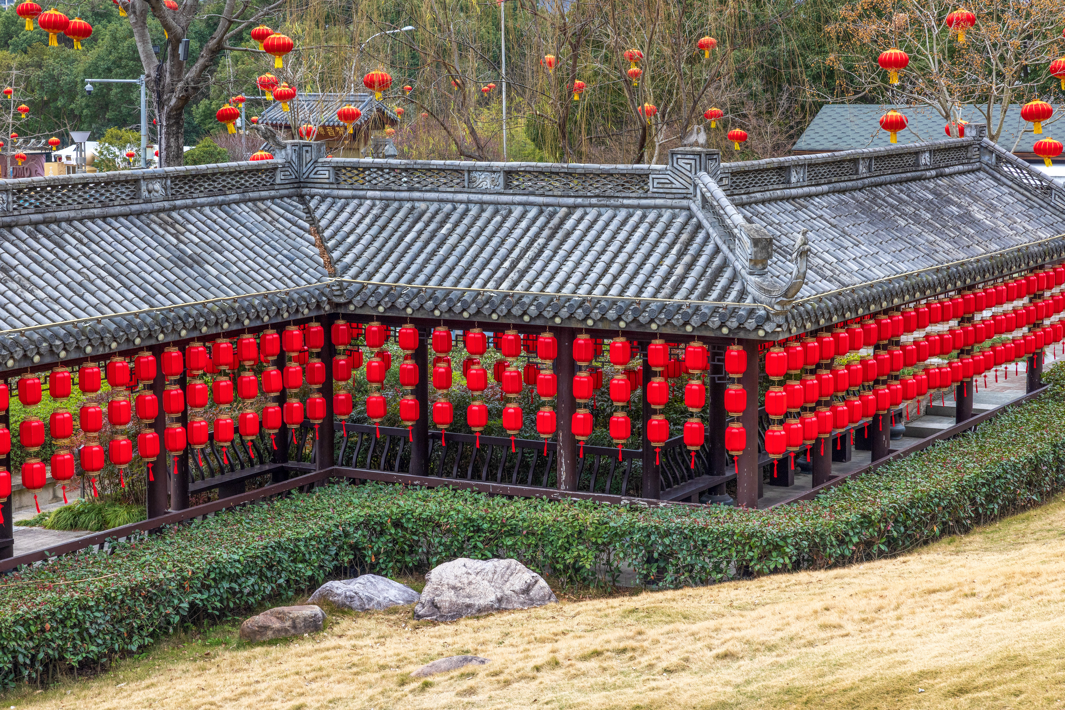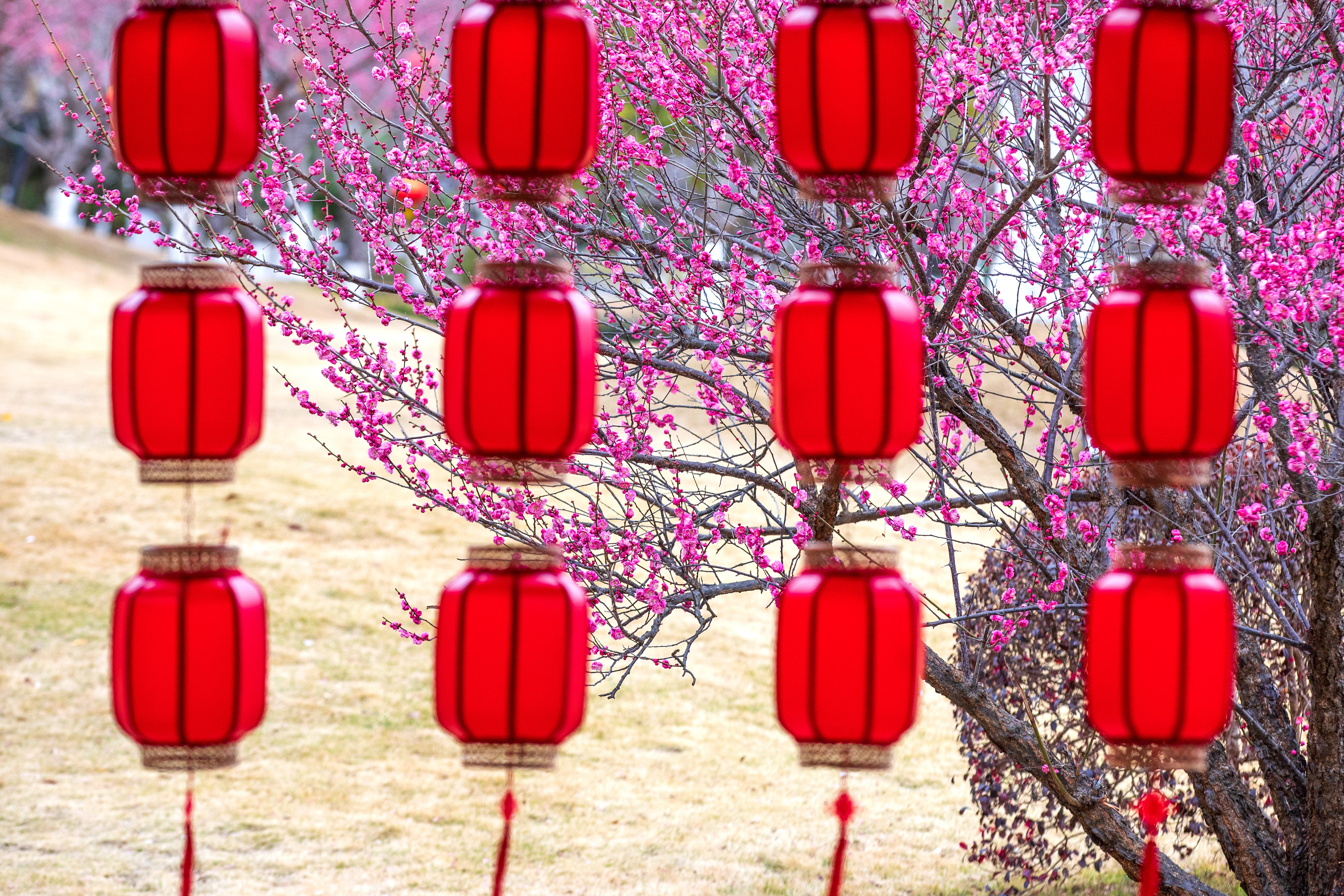温岭:张灯结彩迎新春 2026年1月29日,浙江省台州市温岭市五龙山公园内悬挂起各式红灯笼,迎接农历新年的到来。火红的灯笼点缀在枝头与传统回廊之间,与凌寒绽放的梅花相映成趣,营造出红火喜庆、生机盎然的节日景观。