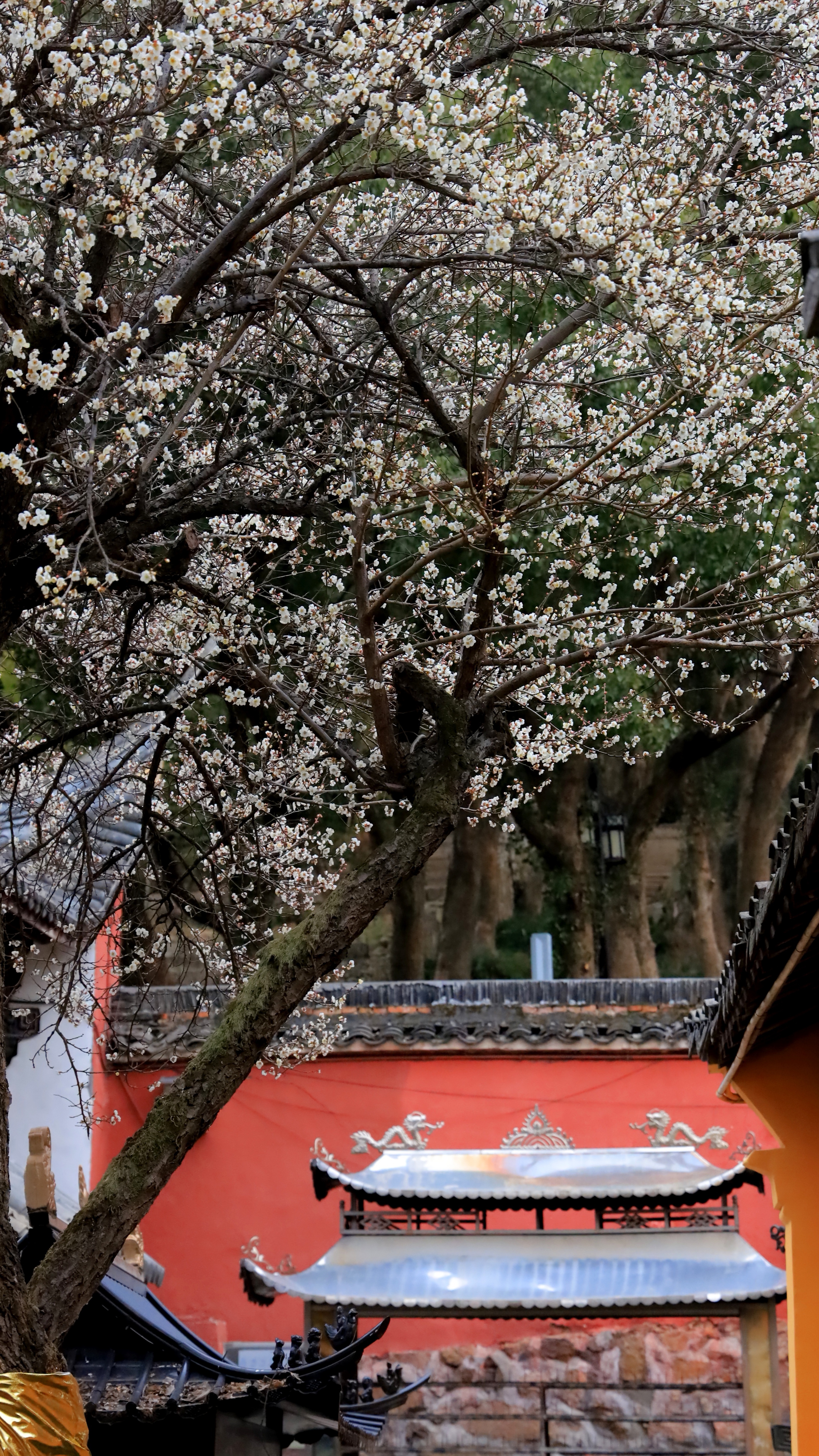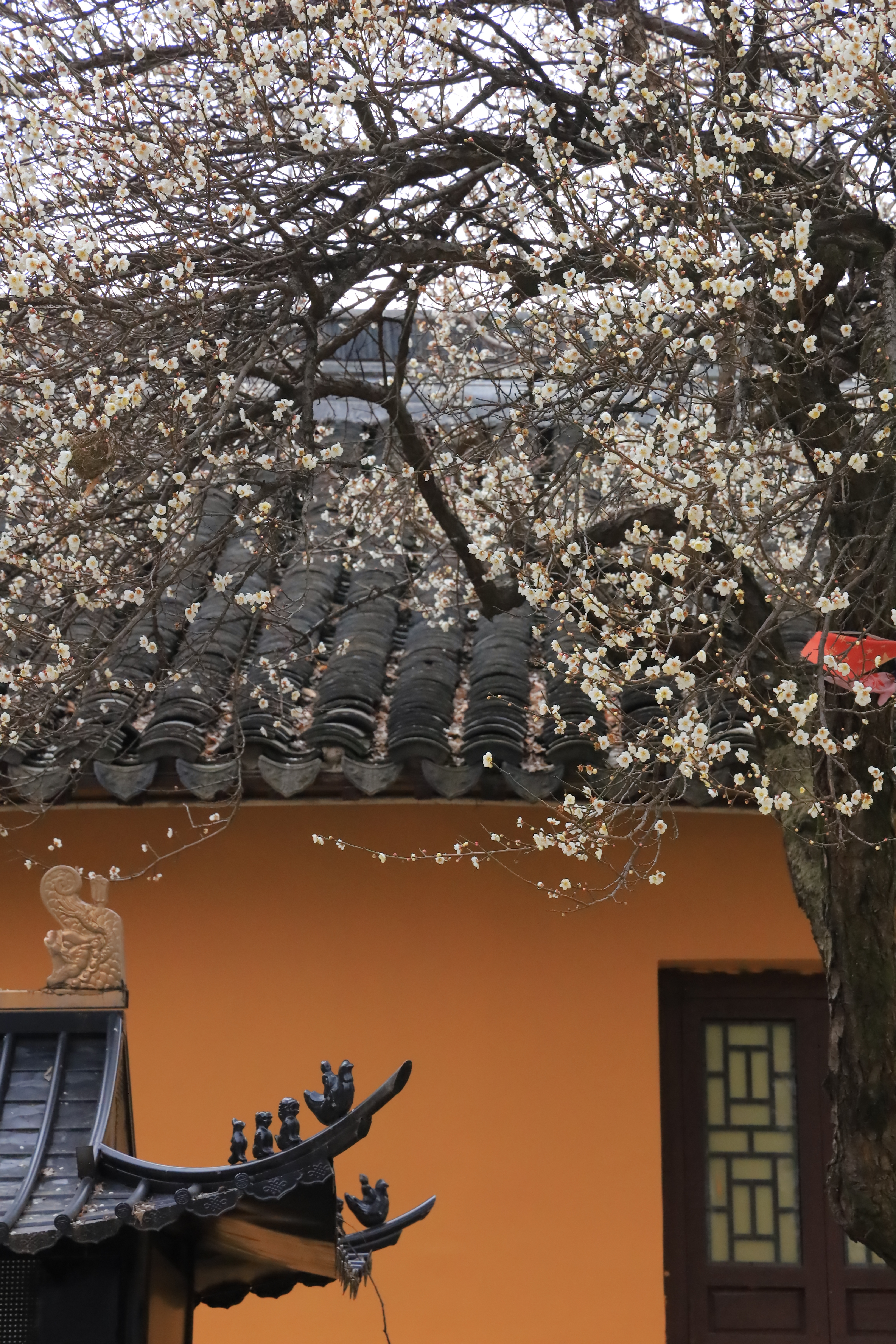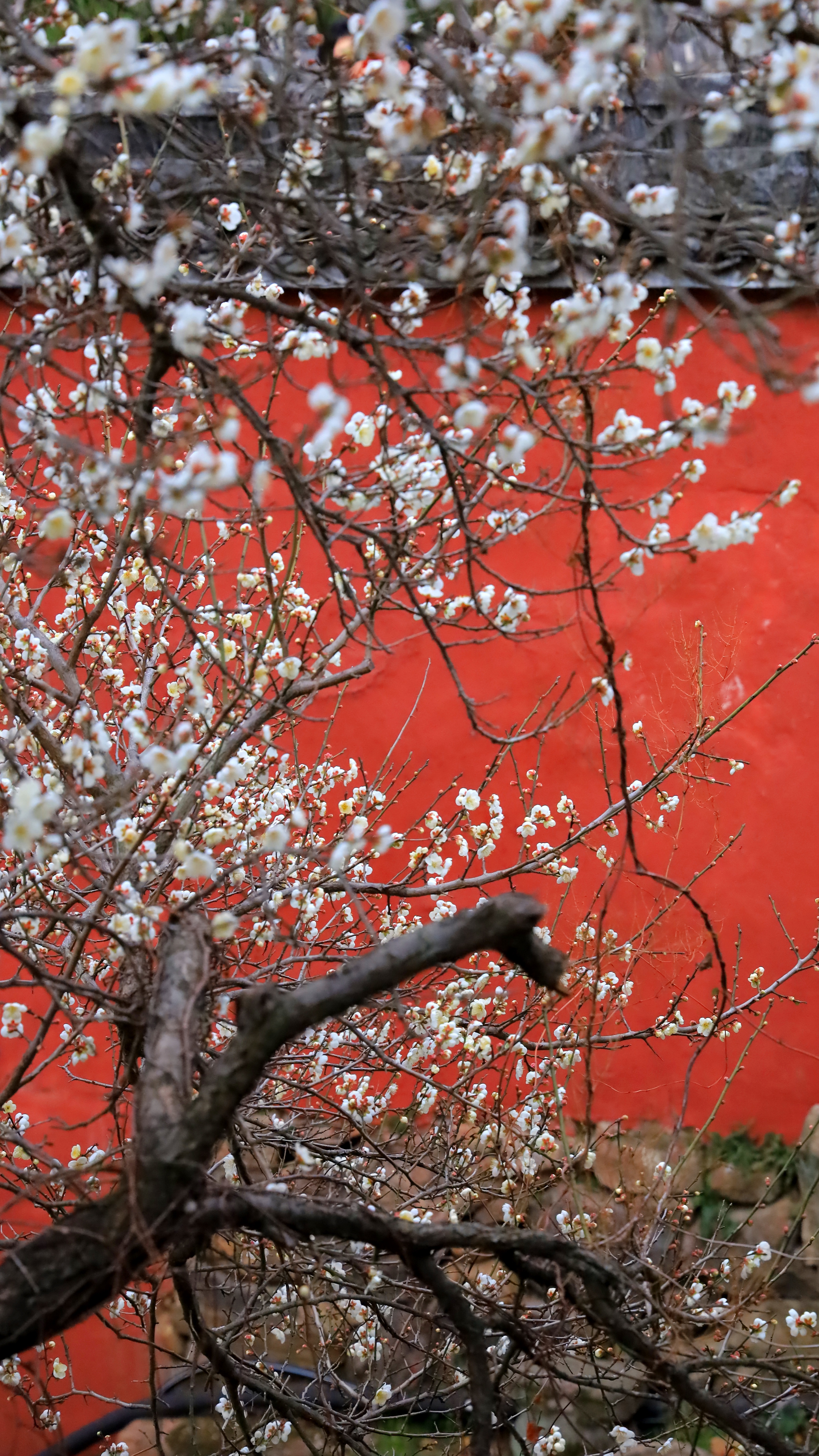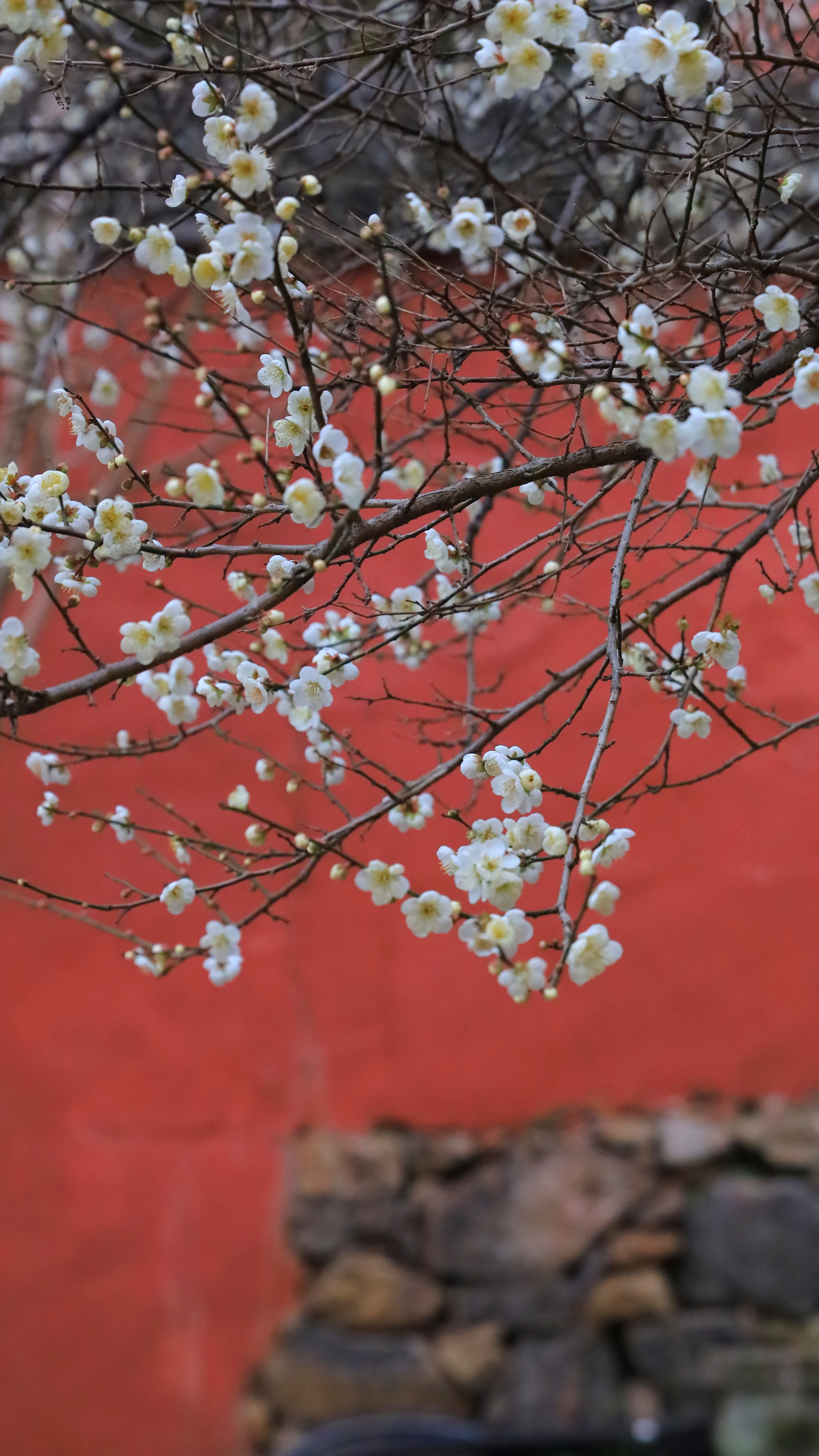 云岫庵出自陶渊明 “云无心以出岫, 鸟倦飞而知还” 庵内二树白梅 枝桠疏影花如雪 更有红黄青墙相衬 如画生香,甚是美妙
