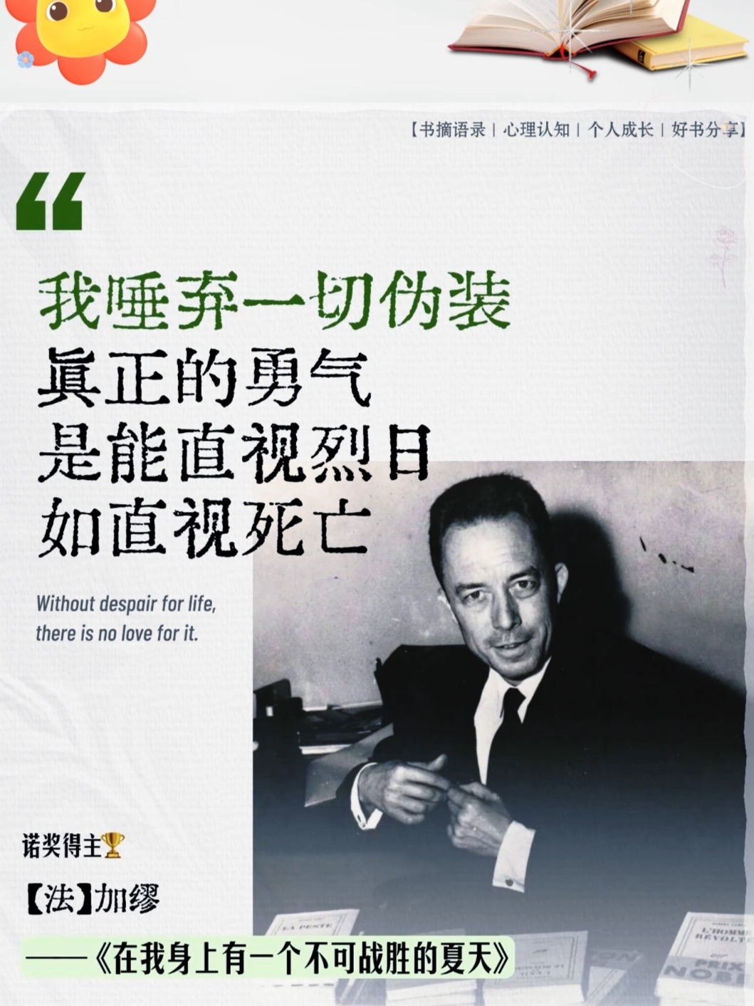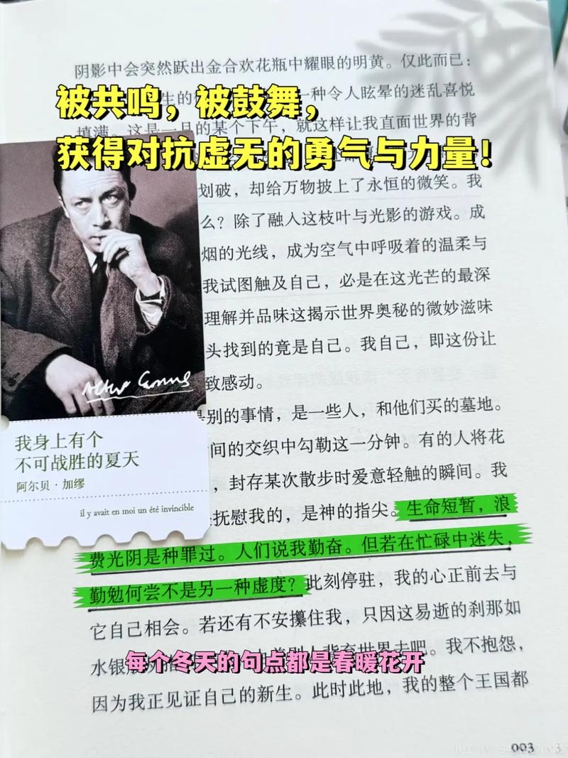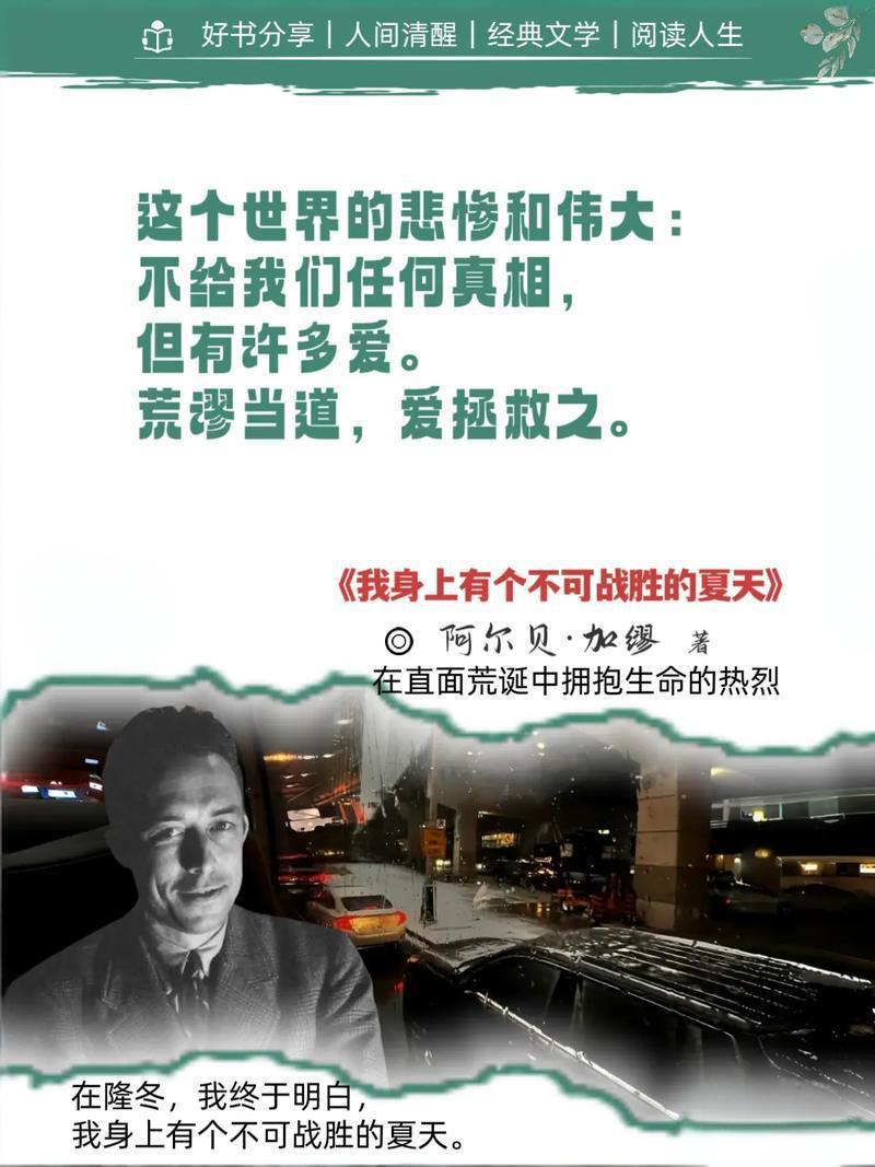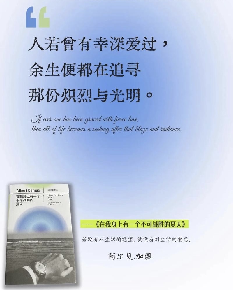 《我身上有个不可战胜的夏天》是潮新闻第十一期阅读活动可免费兑换的书籍之一,其是法国作家阿尔贝·加缪的一部重要散文集,收录了他从1935年至1953年间创作的14篇散文。这本书不仅是加缪从青年走向思想成熟的文学“实验场”,更是他毕生写作母题与哲学思想的源头。 🔍 核心内容与思想脉络 这本书的核心,在于加缪通过描绘阿尔及尔贫民窟的生存图景、北非炽热的阳光与废墟,确立了其独特的存在主义视角。 核心哲学命题:荒诞与美的并置 加缪的哲学思考扎根于具体的感官世界,而非抽象的书斋。在散文中,他始终将死亡、贫困与阳光、海洋这些截然相反的意象并置。例如,在《反与正》中,一位老妇人为自己购买、装修并迷恋上墓地的故事,与叙述者自己在房间内感受阳光、枝叶光影的鲜活生命体验形成强烈对照。这种并置揭示了加缪的核心洞察:生命的璀璨与腐朽永远相互寄生,世界的“荒诞”正源于这种不可理喻的矛盾与反差。 独特的“身体哲学”与“婚礼”精神 与其他哲学家不同,加缪的思想诞生于“烈日炙烤的废墟、咸涩的海风与无花果树的芬芳之中”。他强调用整个身体去感受世界——岩石的温度、浪花的节奏——在感官的狂喜中与宇宙达成短暂的和解。他将自己与提帕萨等地的关系形容为一场“婚礼”,这是灵魂与世界一场炽热而纯粹的“结合”。这种对“世界之不可理喻的美”的绝对忠诚,是其反抗荒诞的起点。 ✨ 核心意象:“不可战胜的夏天” 书名这句诗出自加缪的《重返提帕萨》,它并非指一个季节,而是一种隐喻,象征着人内心那股在认识到世界荒诞本质后,依然蓬勃、无法被摧毁的生命力与激情。 这个“夏天”代表着: · 清醒的勇气:在直面人生寒冬(荒诞、痛苦、虚无)时,保持的清醒与不妥协。 · 反抗的热量:拒绝沉沦与绝望,选择热爱、投入生活本身所产生的那股内在能量。 · 幸福的根源:后来在《西西弗神话》中升华为“应当想象西西弗是幸福的”这一著名论断,其情感与体验的根源,正是本书中那个“在贫民窟阳台上凝望大海的穷青年对生命既清醒又沉醉的双重凝视”。 📖 文学价值与当代意义 这本书展现了存在主义最本真的形态:它不是书斋里的概念游戏,而是“赤脚踏过滚烫沙砾时的痛感与快感”。通过散文这种自由的体裁,加缪记录下了思想生成的原始瞬间,让读者能触摸到他哲学中那份灼热的生命质感。 对于当代读者而言,这本书的意义在于: · 提供了一种面对荒诞的积极姿态:当认识到社会固有的虚伪、虚无与荒诞后,加缪指引的不是颓废,而是在清醒中更热烈地投入生活,在行动与感受中创造意义,做一个“乐观的虚无主义者”。 · 强调感受与体验:在一个被理性与抽象过度包裹的时代,加缪提醒我们回归身体、感官和具体的生活体验,从中汲取力量。 总的来说,《我身上有个不可战胜的夏天》是进入加缪精神世界的一把关键钥匙。它不那么系统,却更鲜活、更动人。它告诉我们,真正的勇气,是能在直视烈日(生命的光辉)如直视死亡(生命的荒诞)之后,依然选择在内心深处培育并守护那个“不可战胜的夏天”。 如果大家想更深入地理解加缪,我可以为你们梳理他的“荒诞三部曲”(《局外人》《西西弗神话》《卡利古拉》)如何从不同维度发展本书的思想哦~
