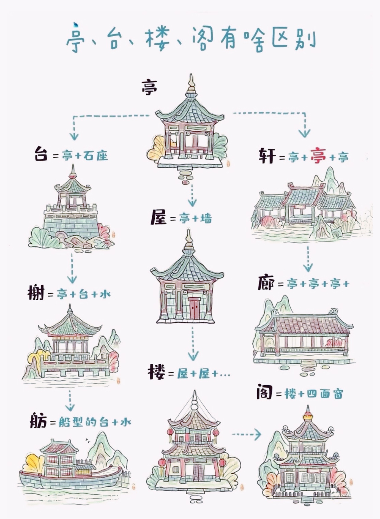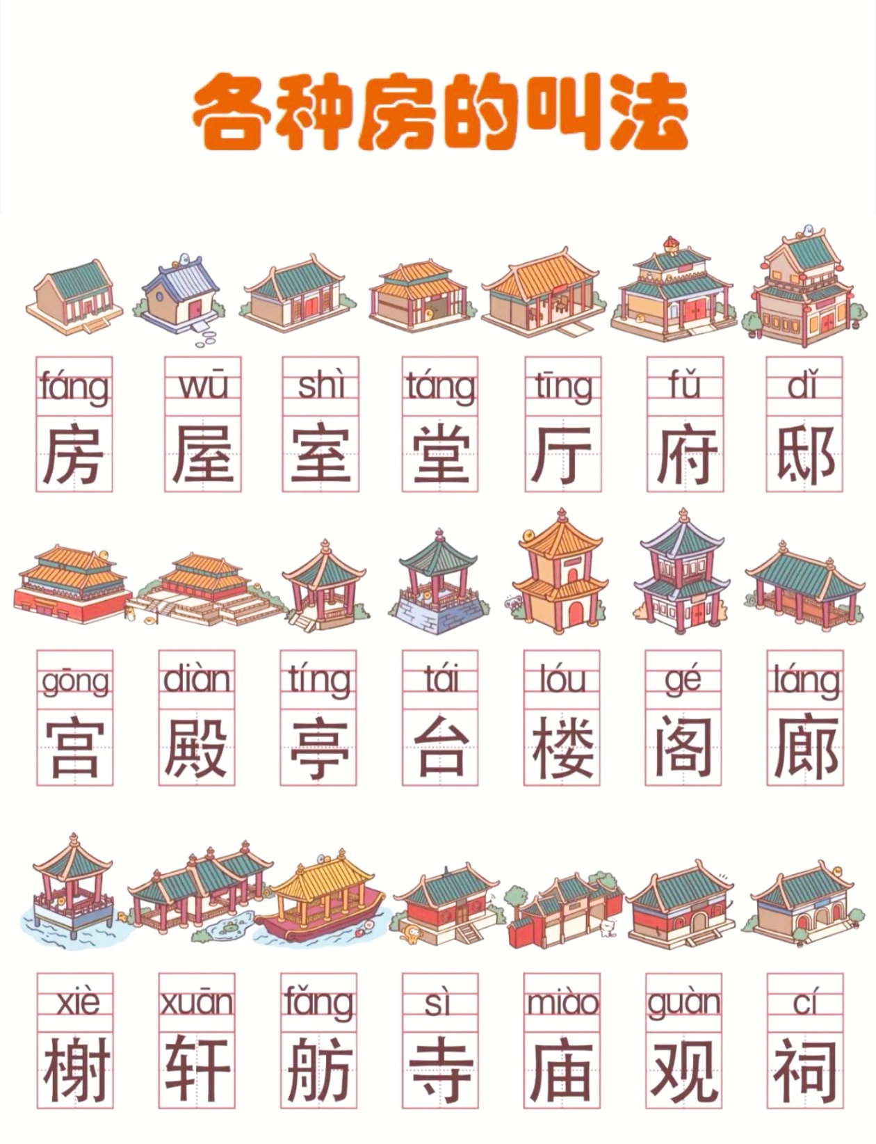 你知道什么亭台楼阁,轩榭廊坊坛吗? 一张图带你了解各种房 1、正室两旁的叫房 2、有墙有门有窗叫屋 3、供人居住寝卧的房叫室 4、高大的正房叫堂 5、会客用的房叫厅 6、达官贵人的房叫府 7、高官住的房叫邸 8、帝王皇帝住的房叫宫 9、皇帝办公或供奉神佛的房叫殿 10、有顶无墙的房叫亭 11、有底座露天的亭叫台 12、两层以上的屋叫楼 13、四周开窗的楼叫阁 14、房屋之间有顶的通道叫廊 15、建在水旁台子上的亭叫榭 16、临水有窗的长廊叫轩 17、三面临水像船的亭叫舫 18、佛教僧众住的叫寺 19、祭祀天地鬼神的叫庙 20、道士修道的叫观 21、纪念伟人名士的叫祠 大家知道几种房呢? #历史建筑之美 #古建筑爱好者必看 #房屋室堂厅府邸 #各种房的叫法