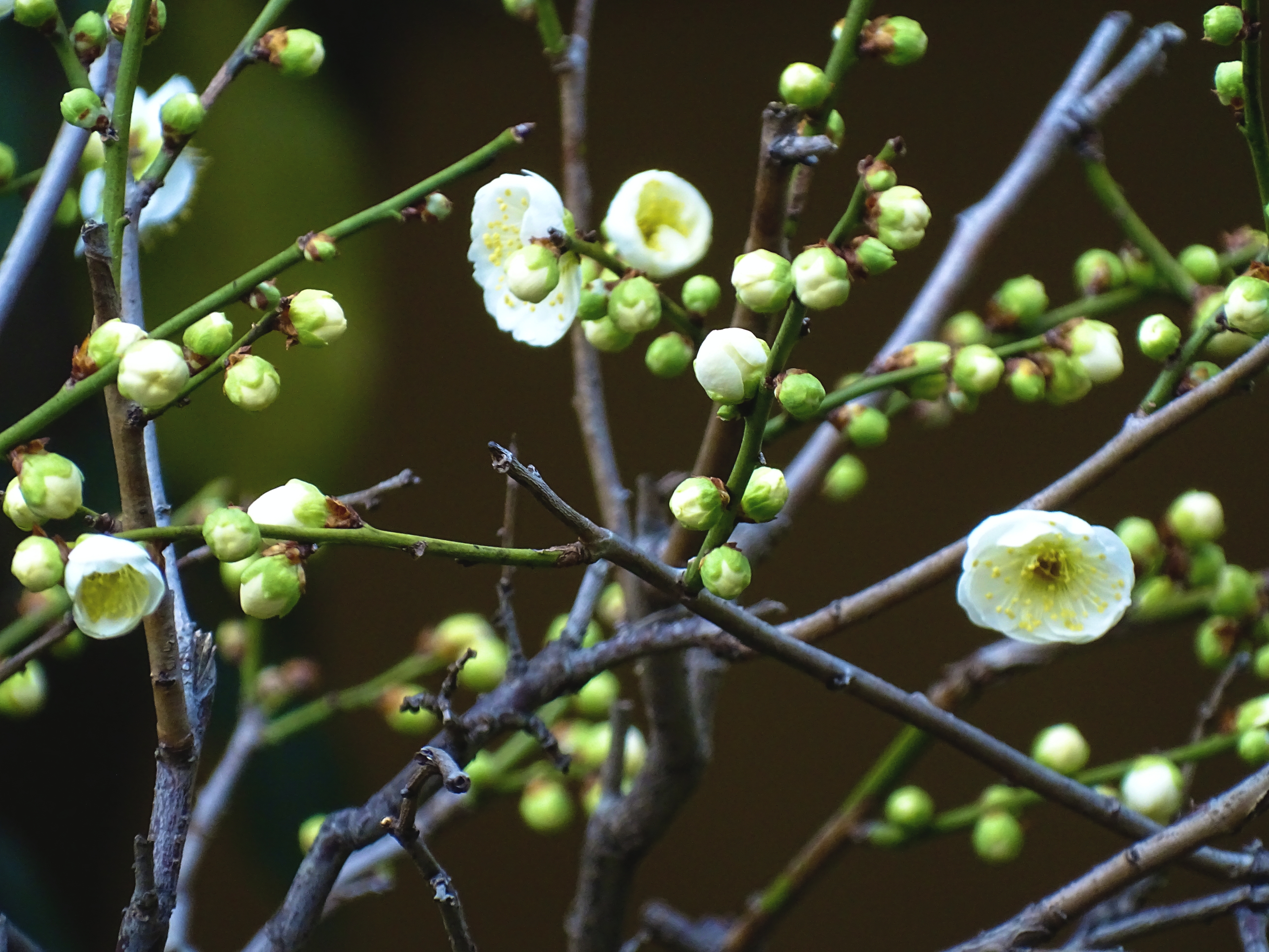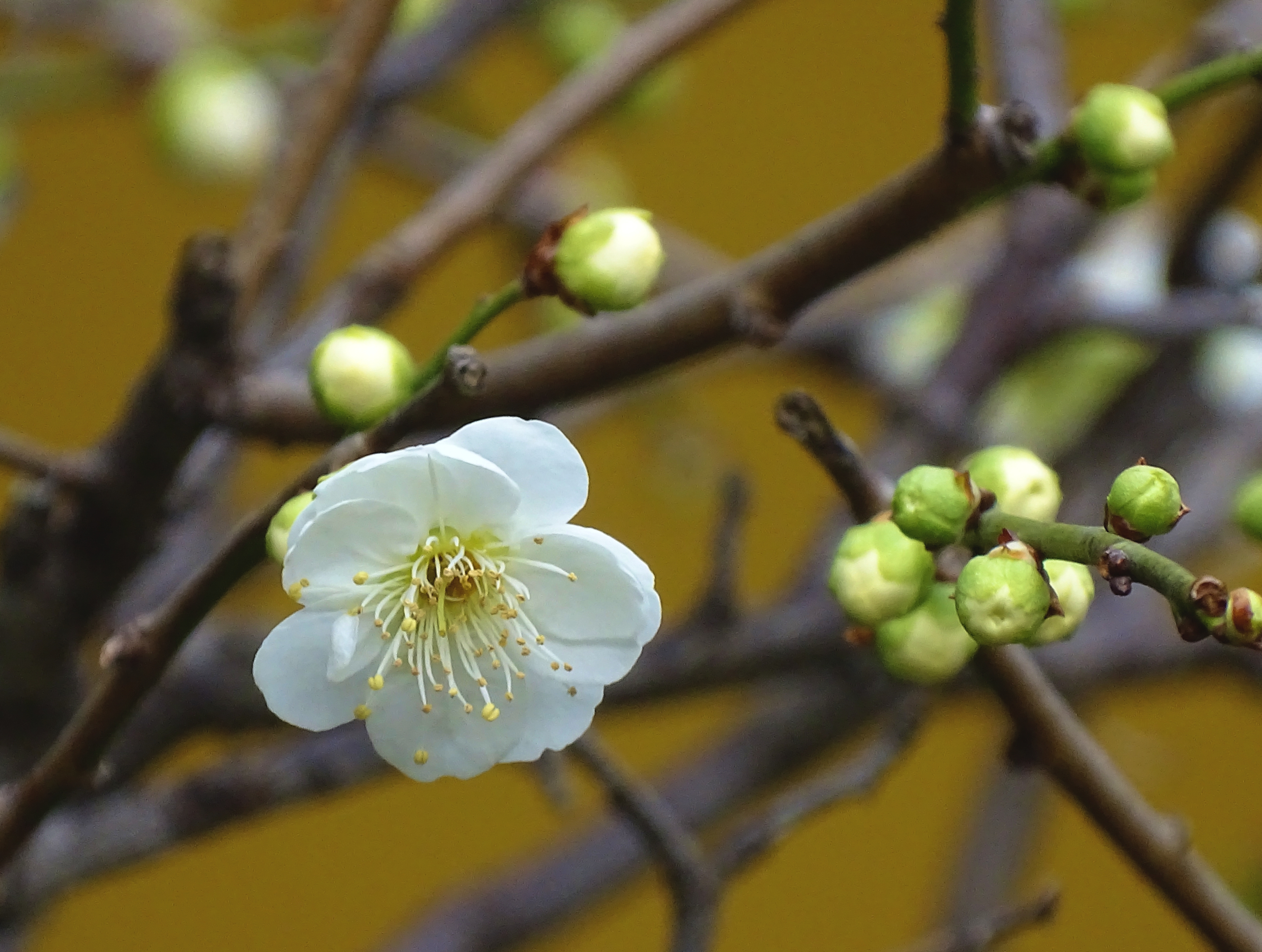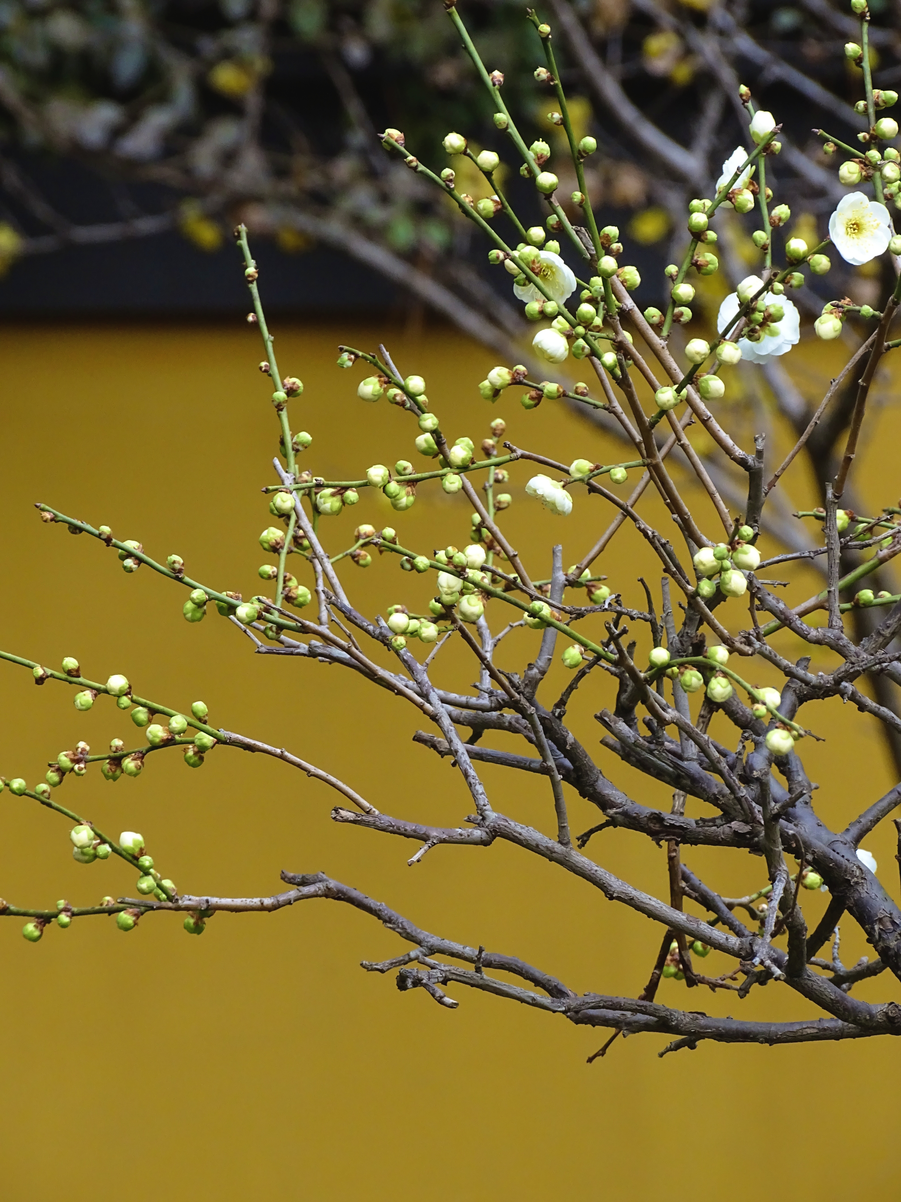 慧因高丽寺的绿梅,素白花瓣配着鹅黄花蕊,清新得像春天的呼吸。枝桠间藏着不少花苞,静静等着绽放的时刻。