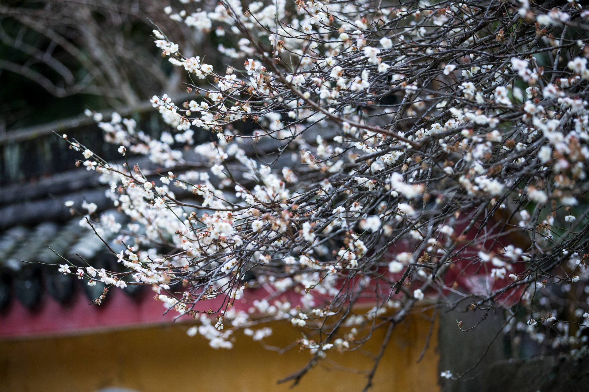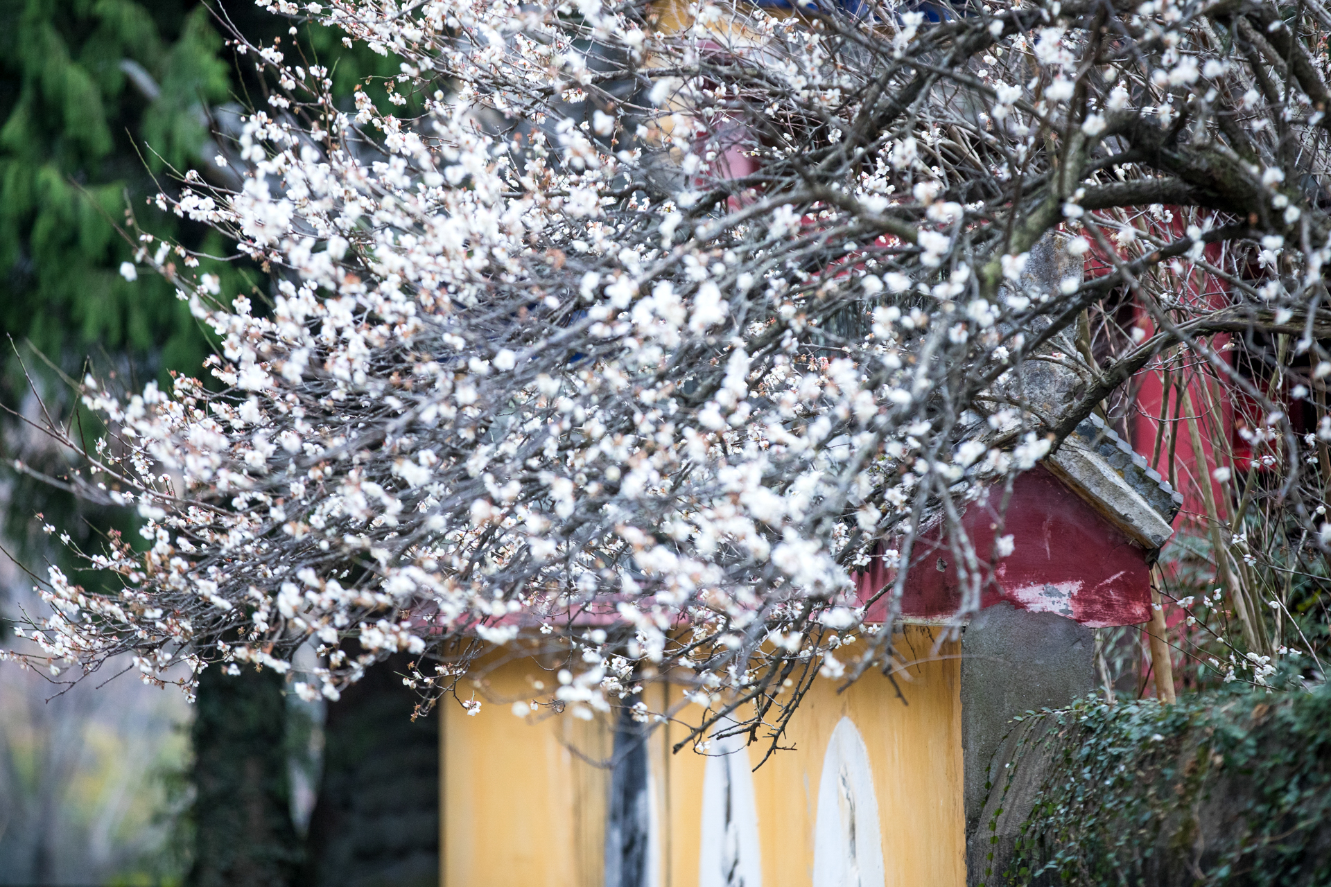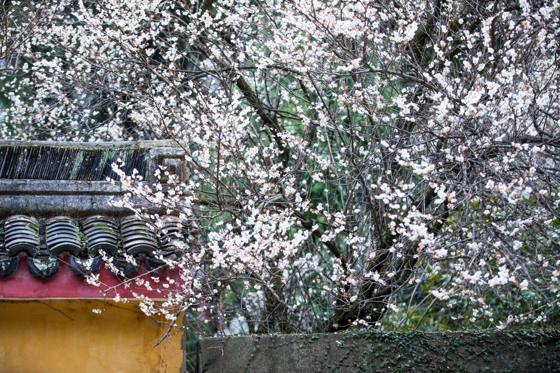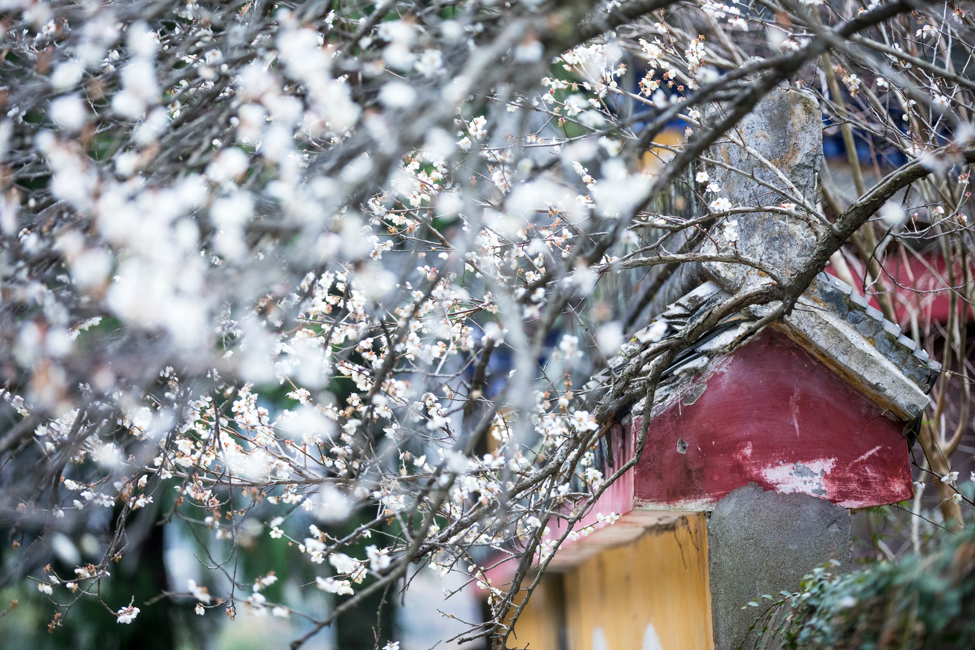 温岭妙严禅寺的白梅探出黄墙,殷勤欲递春信。花开得倦了,倚着门楼,将残未残的瓣,像被雨水浸透又风干的旧信笺,字迹模糊,余韵犹存。