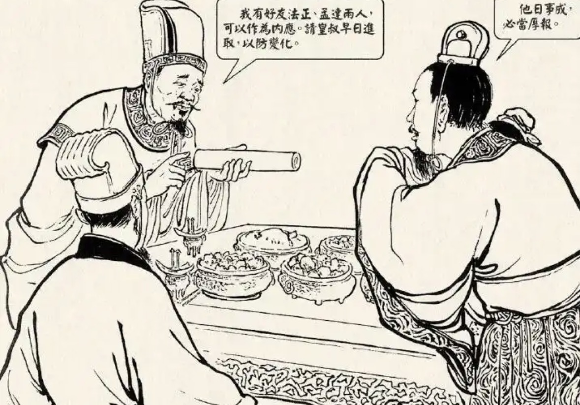 益州牧刘璋探知东川张鲁有进图西川之意,派张松到许都谒见曹操援救。张松因曹操傲慢无礼,便到荆州会见刘备,献出西川地图。刘备借共御张鲁之名,提兵进川。