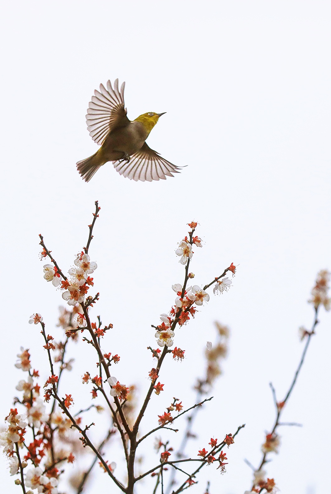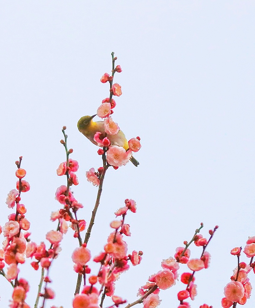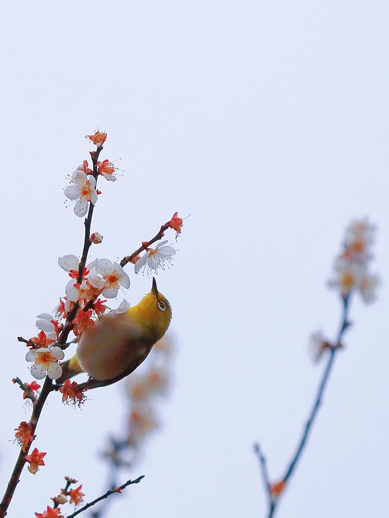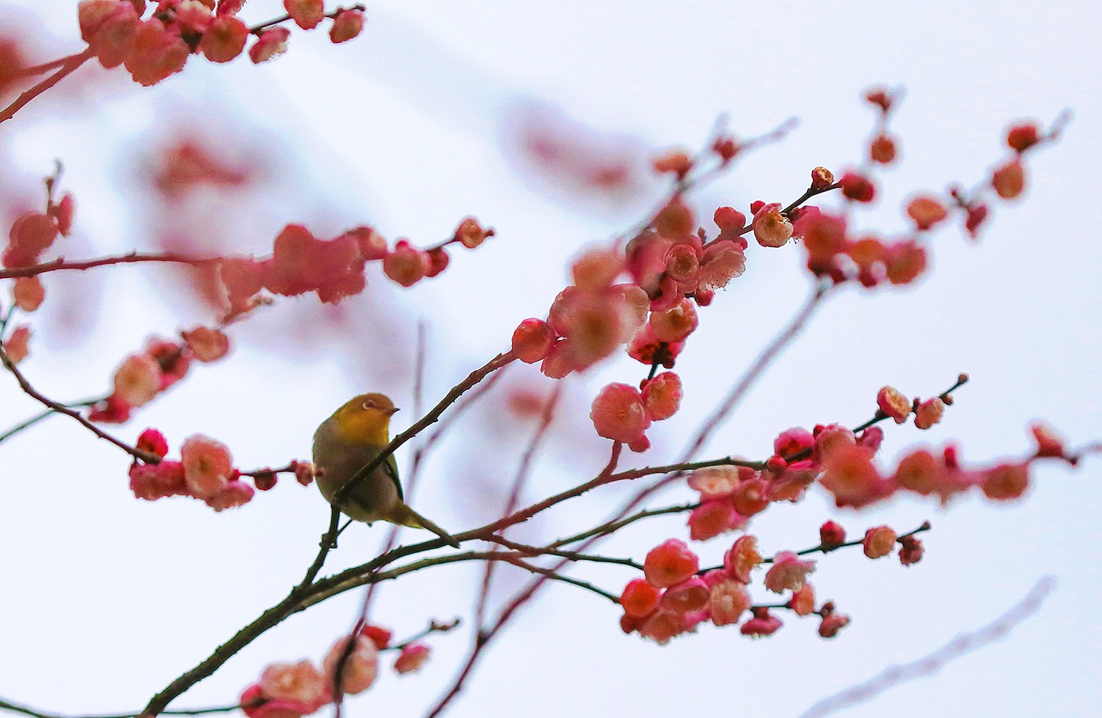 梅花枝头,一只小鸟轻栖,啁啾声里春意初萌。蓝天为幕,花#梅花盛开的季节 影摇曳,风过处暗香浮动。镜头凝住这刹那的生机与静美——原来春天,是鸟翅掠过花梢时,抖落的一缕光。#我的家乡出圈记#