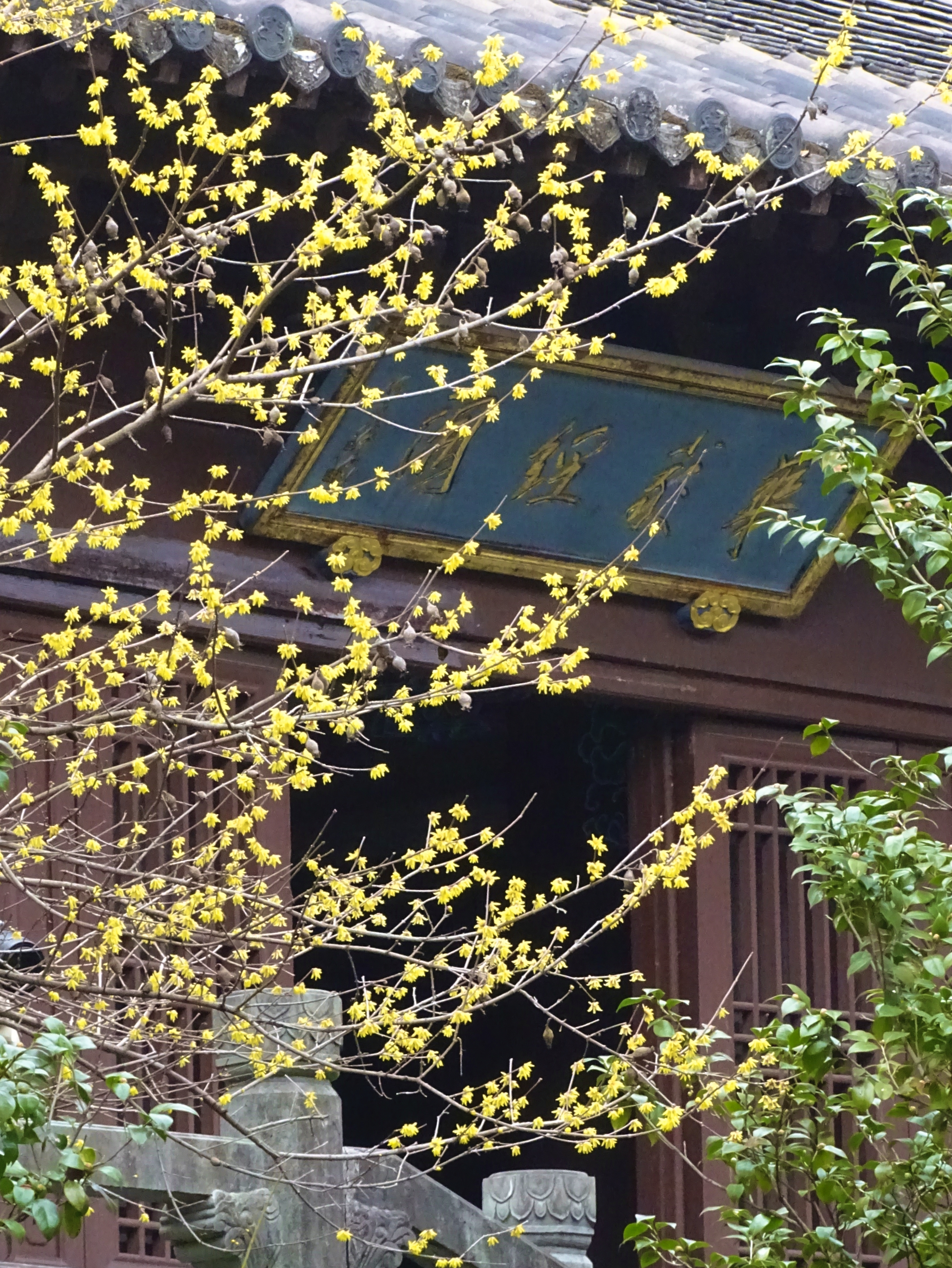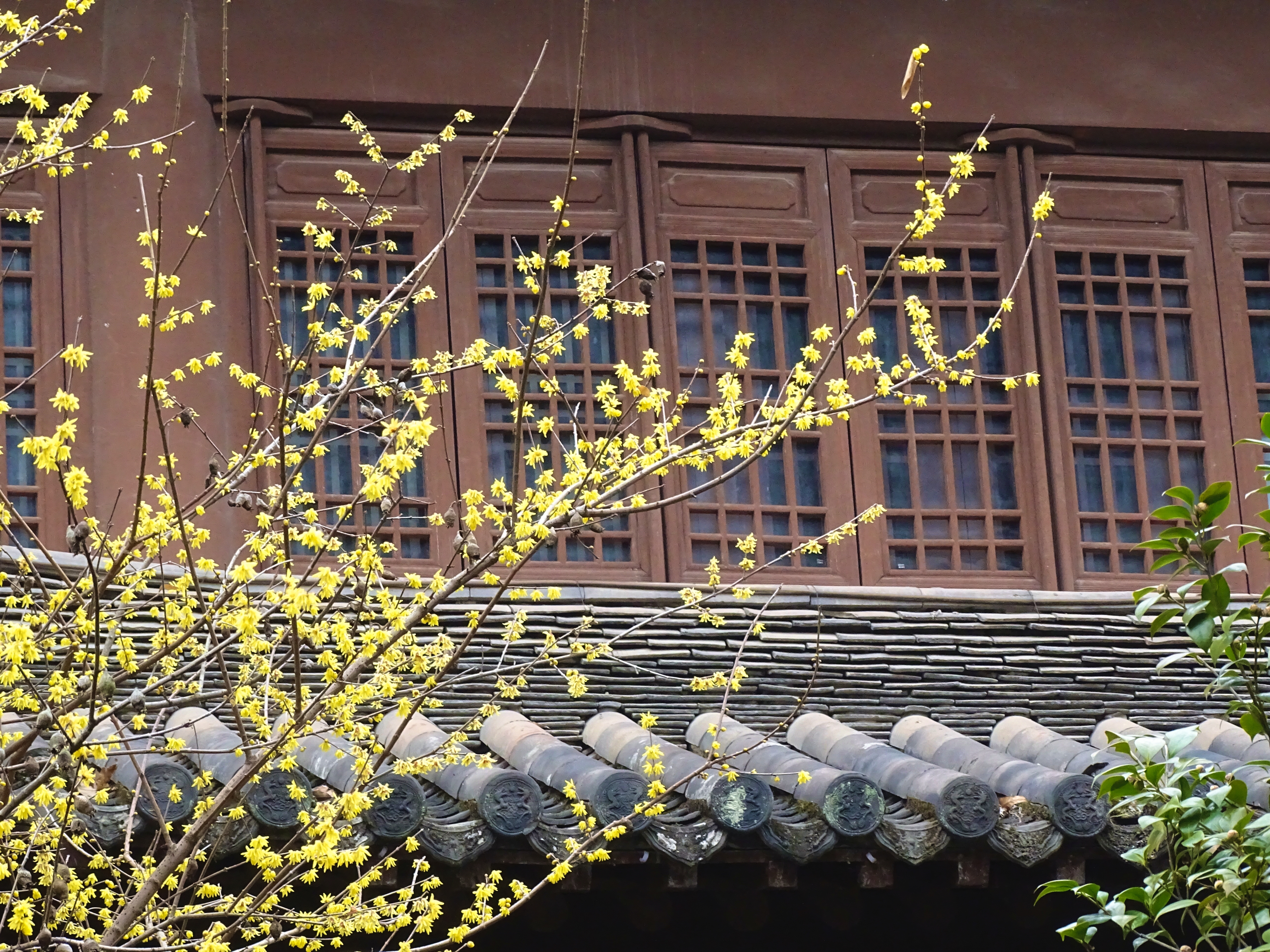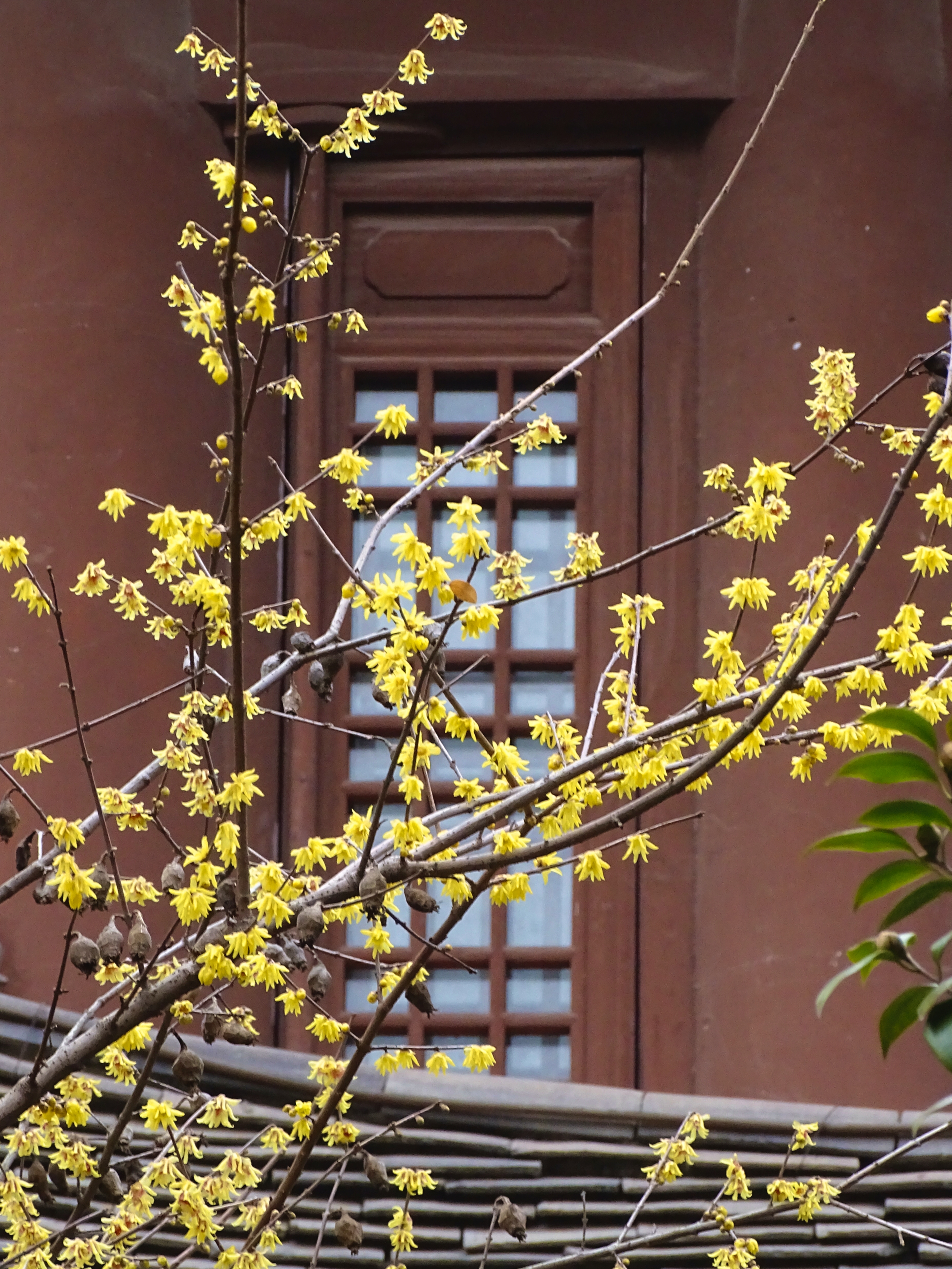 慧因高丽寺的蜡梅,嫩黄的小花缀满枝头,和红窗黛瓦相映成趣。