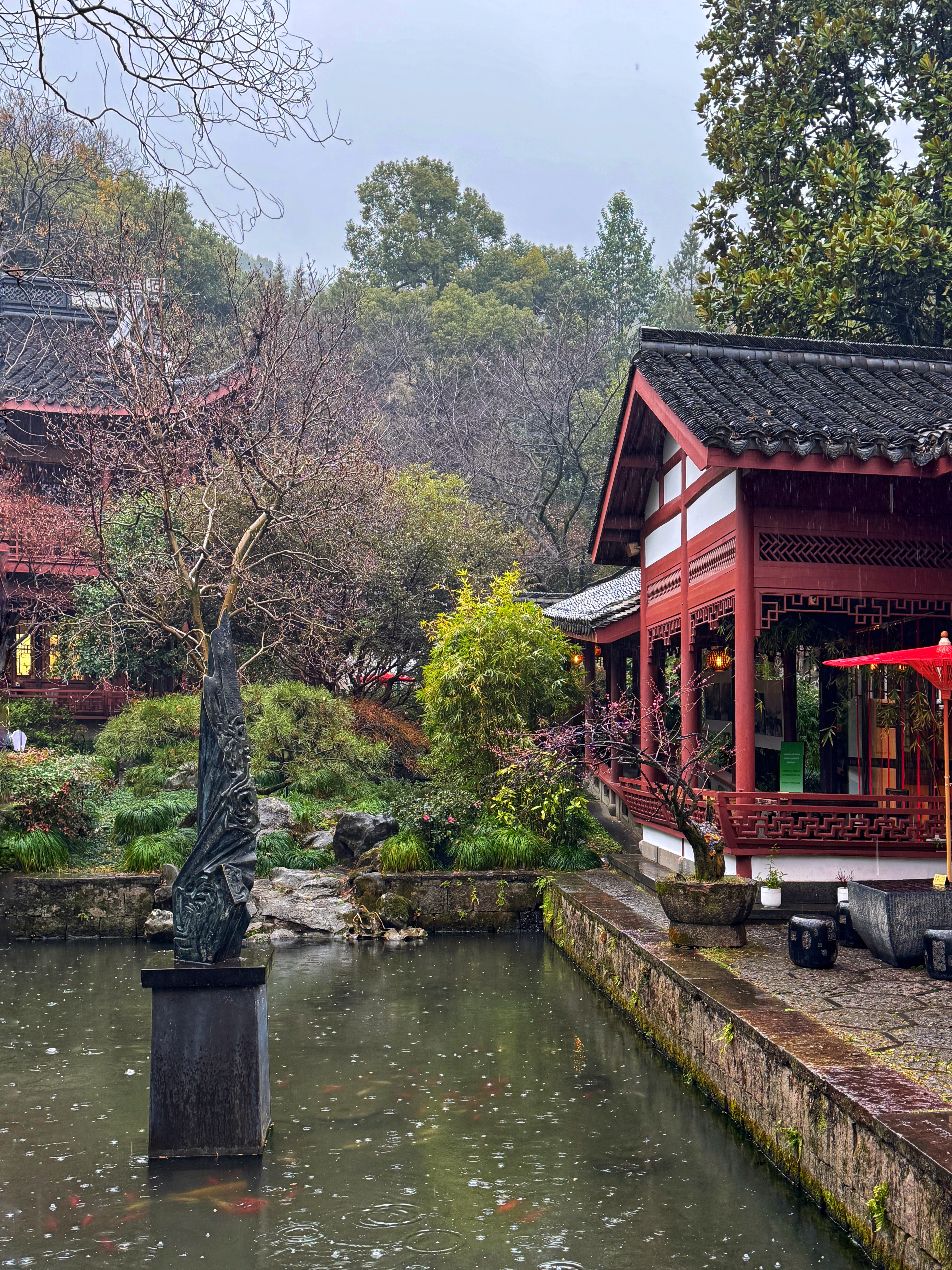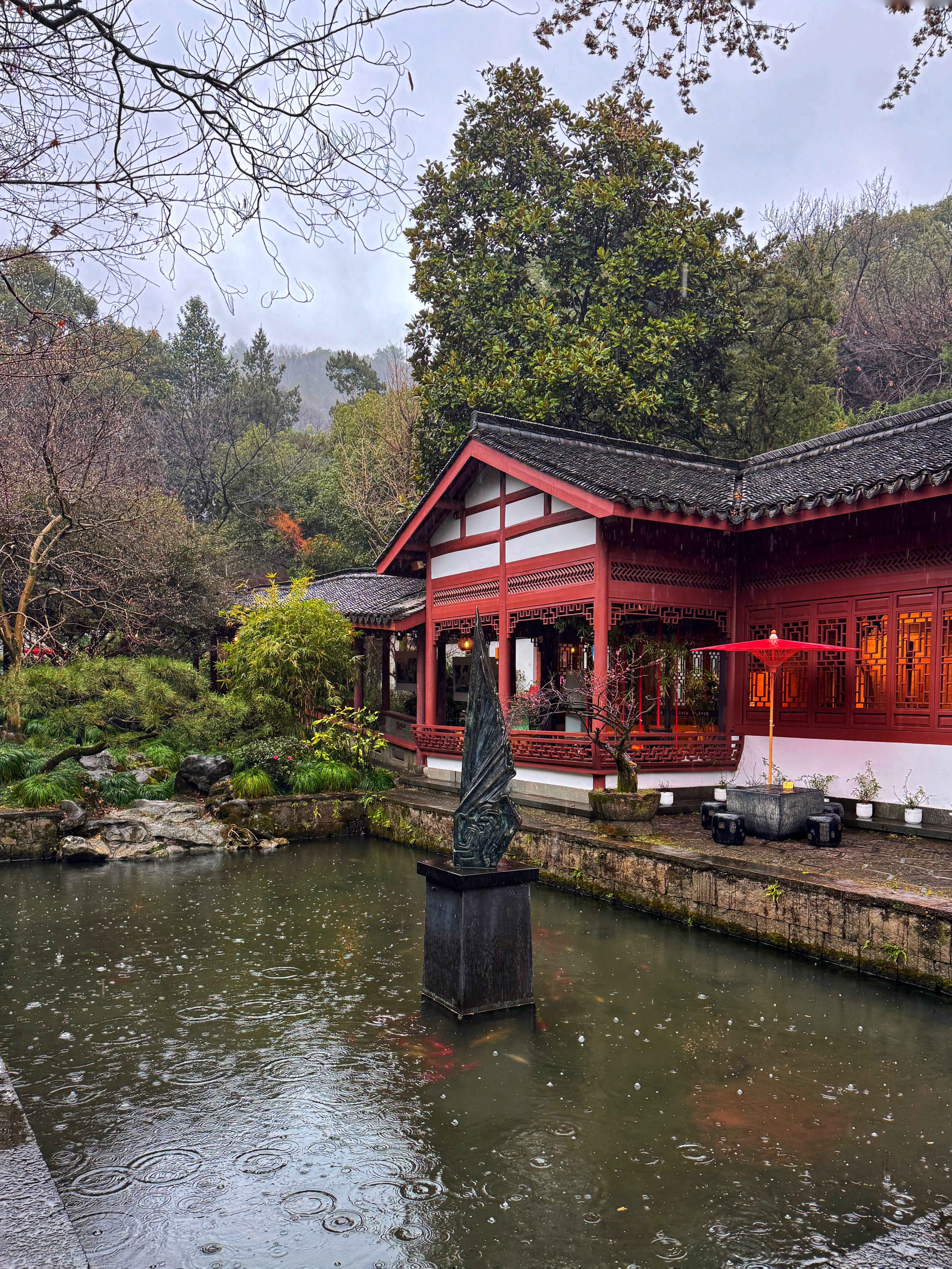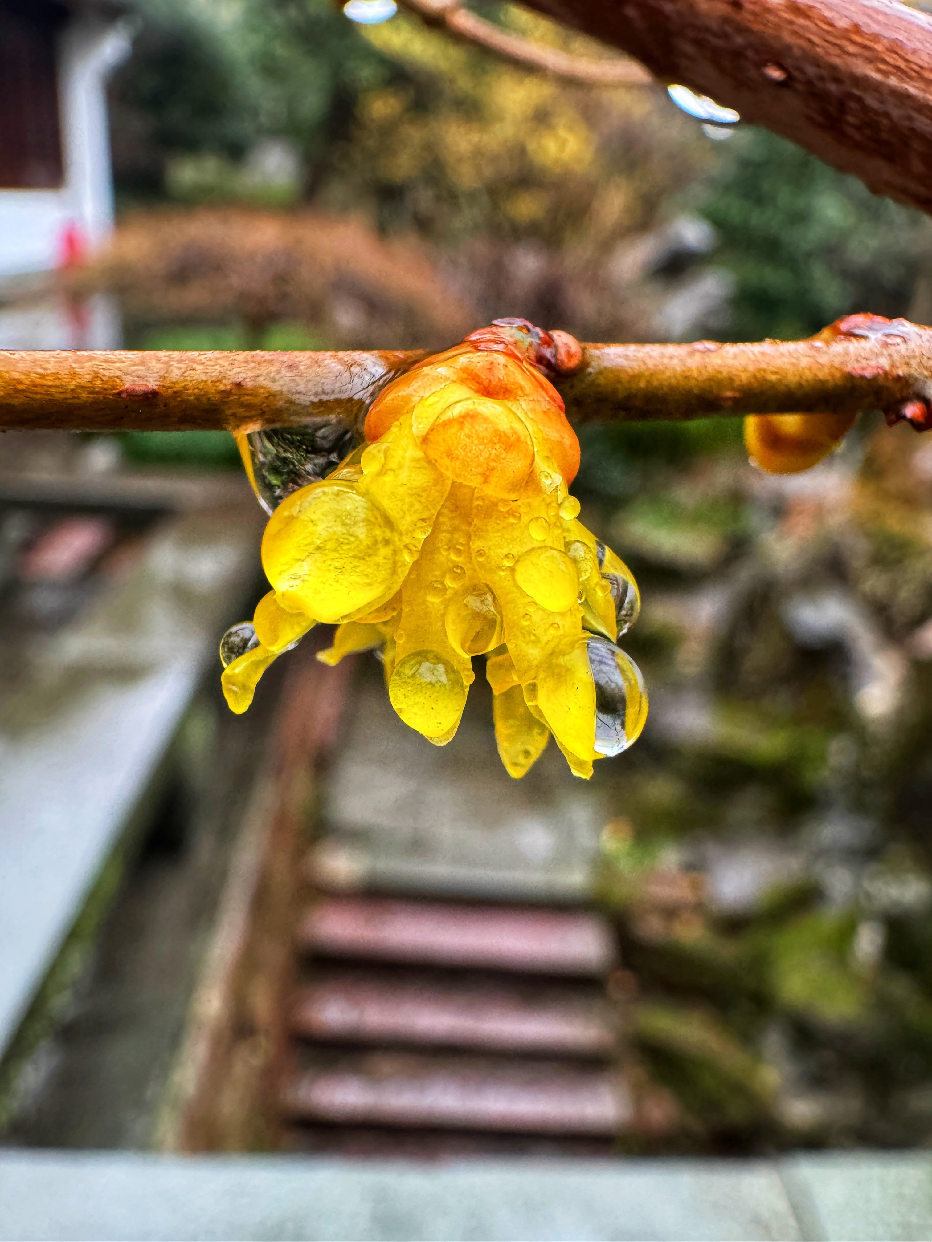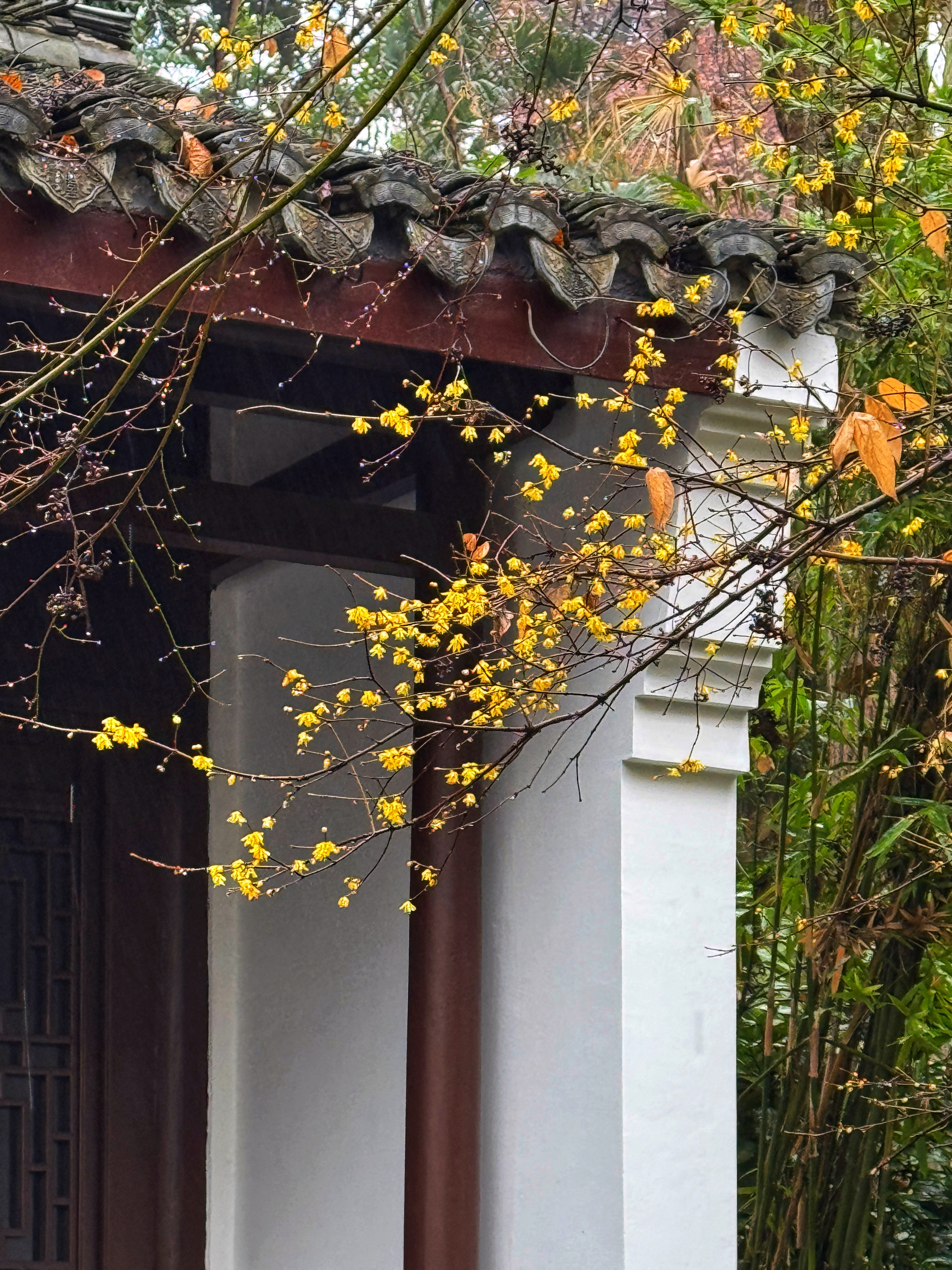 雨中漫步玛瑙寺 雨落葛岭,漫行玛瑙寺。黛瓦粉墙的清式院落间,雨珠轻敲廊柱窗棂,后仆夫泉旁、连横事迹厅前的腊梅凝着雨珠,暗香随雨丝漫开,池面碎玉点点,与檐滴、叶响揉成自然的轻曲。