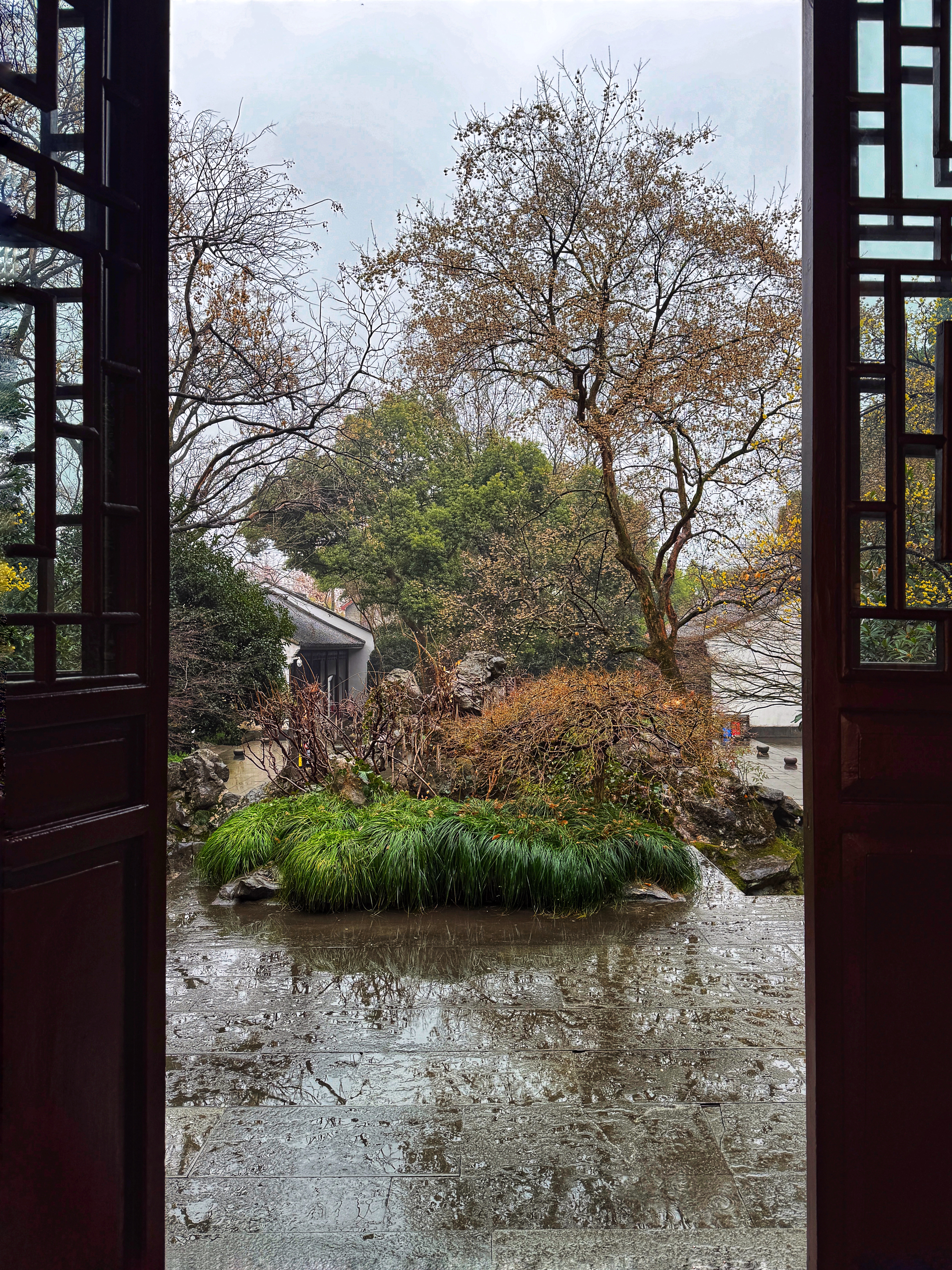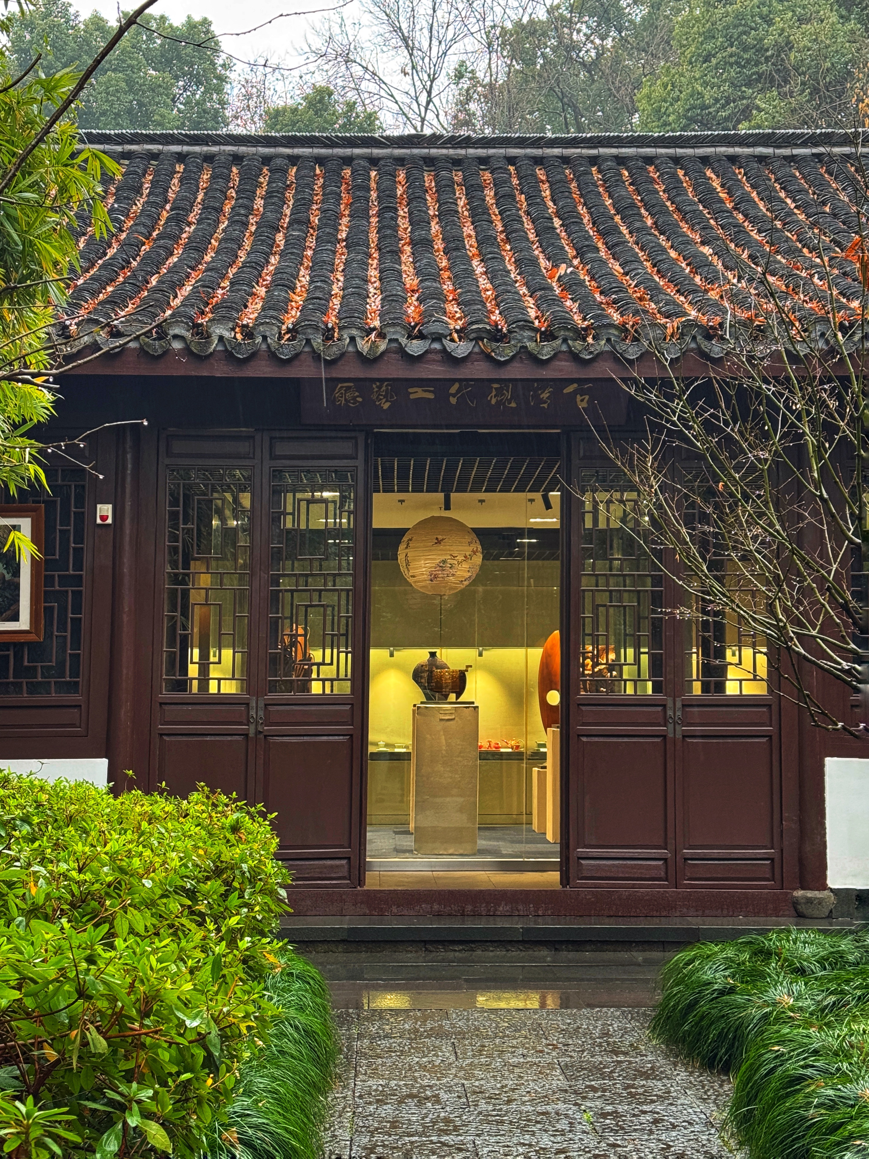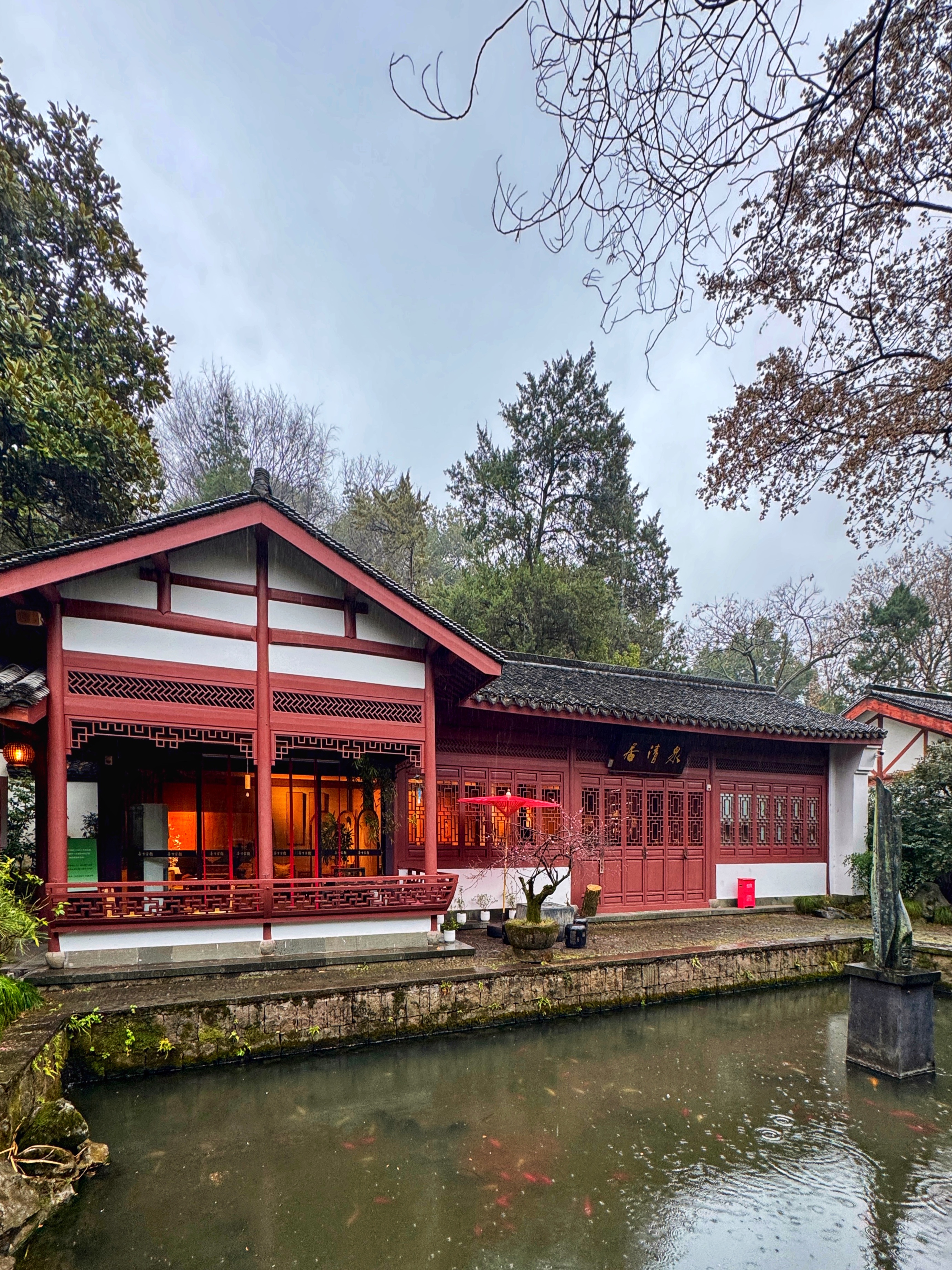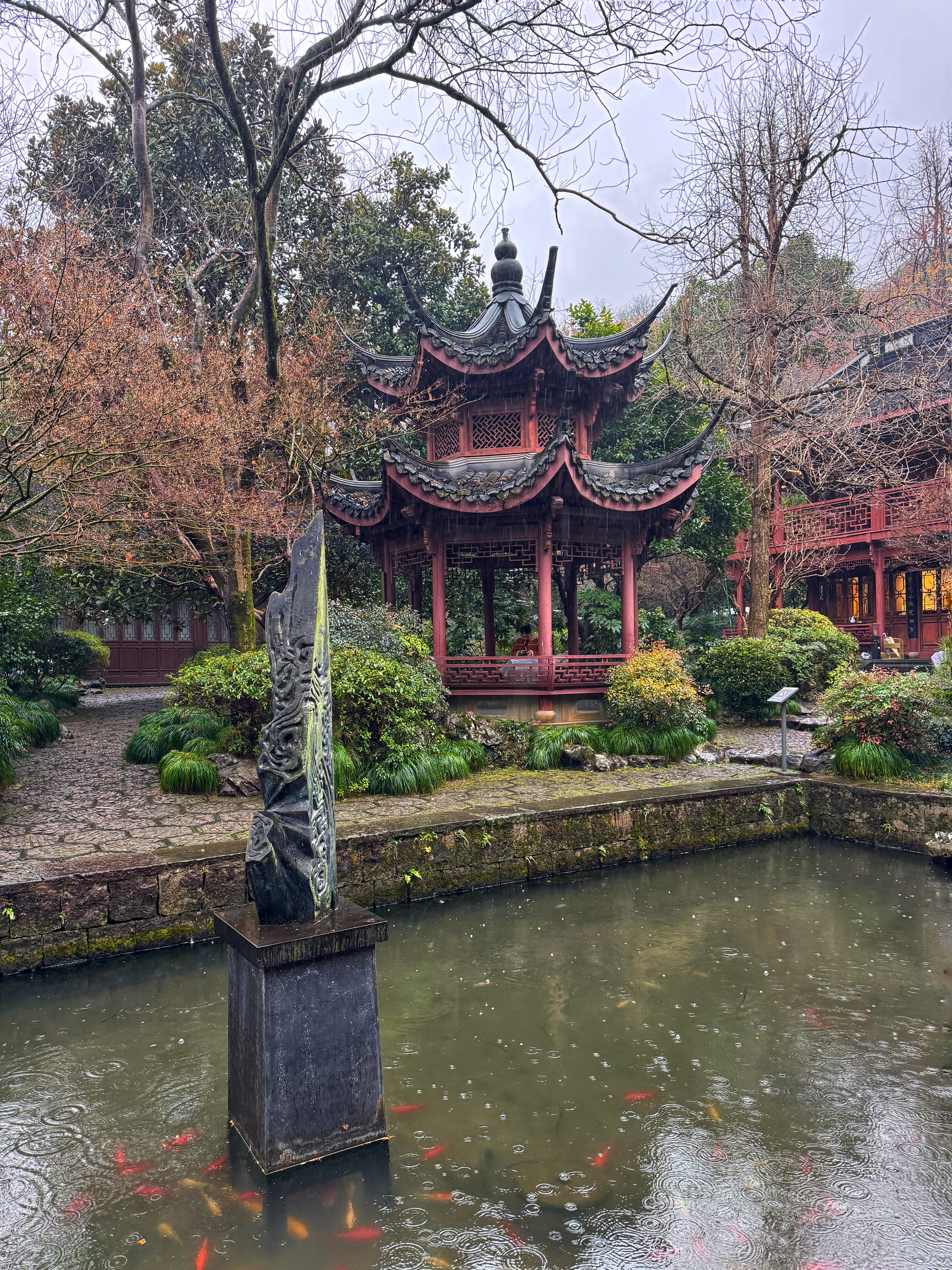 雨中漫步玛瑙寺 雨落葛岭,漫行玛瑙寺。黛瓦粉墙的清式院落间,雨珠轻敲廊柱窗棂,后仆夫泉旁、连横事迹厅前的腊梅凝着雨珠,暗香随雨丝漫开,池面碎玉点点,与檐滴、叶响揉成自然的轻曲。