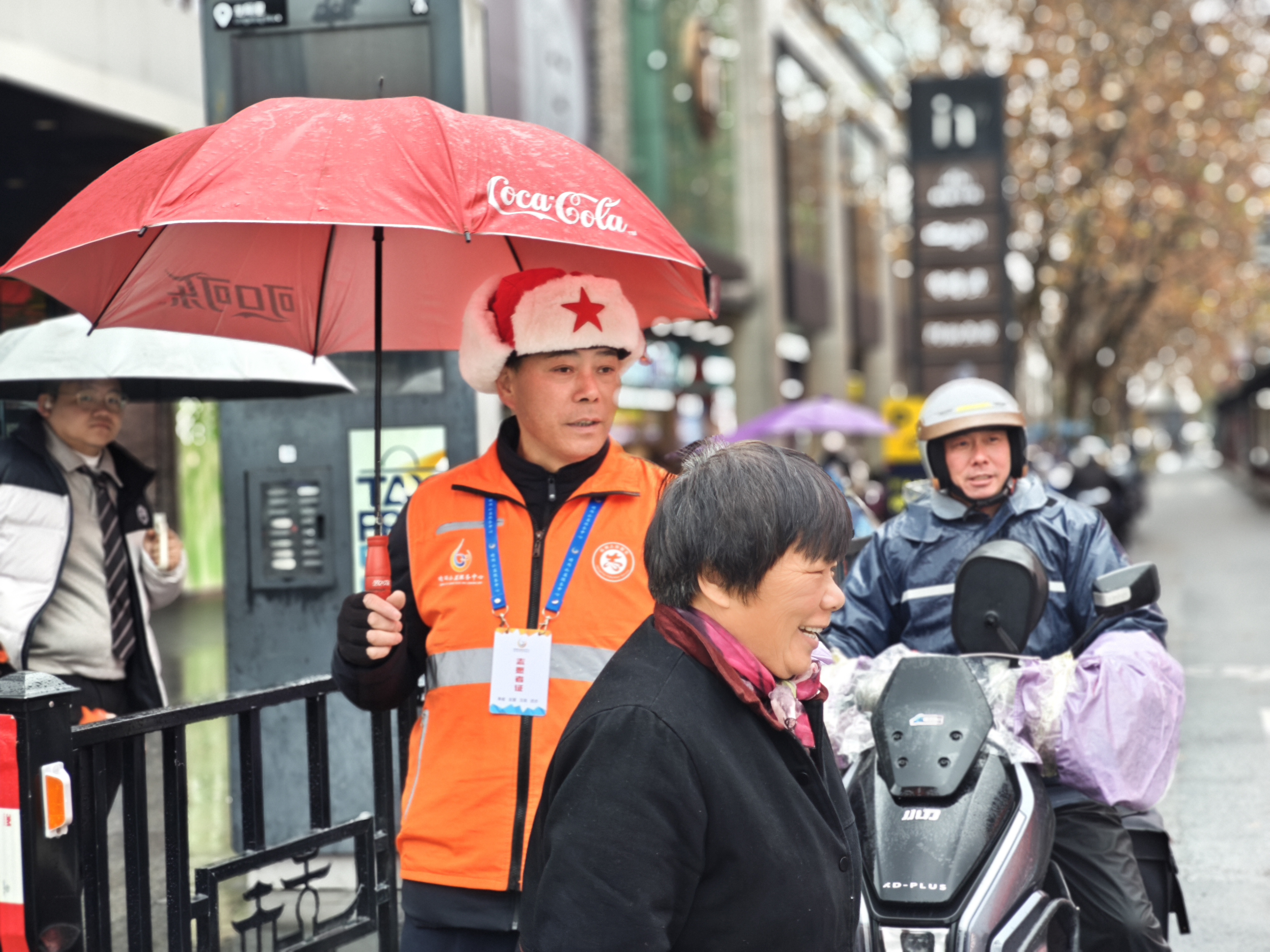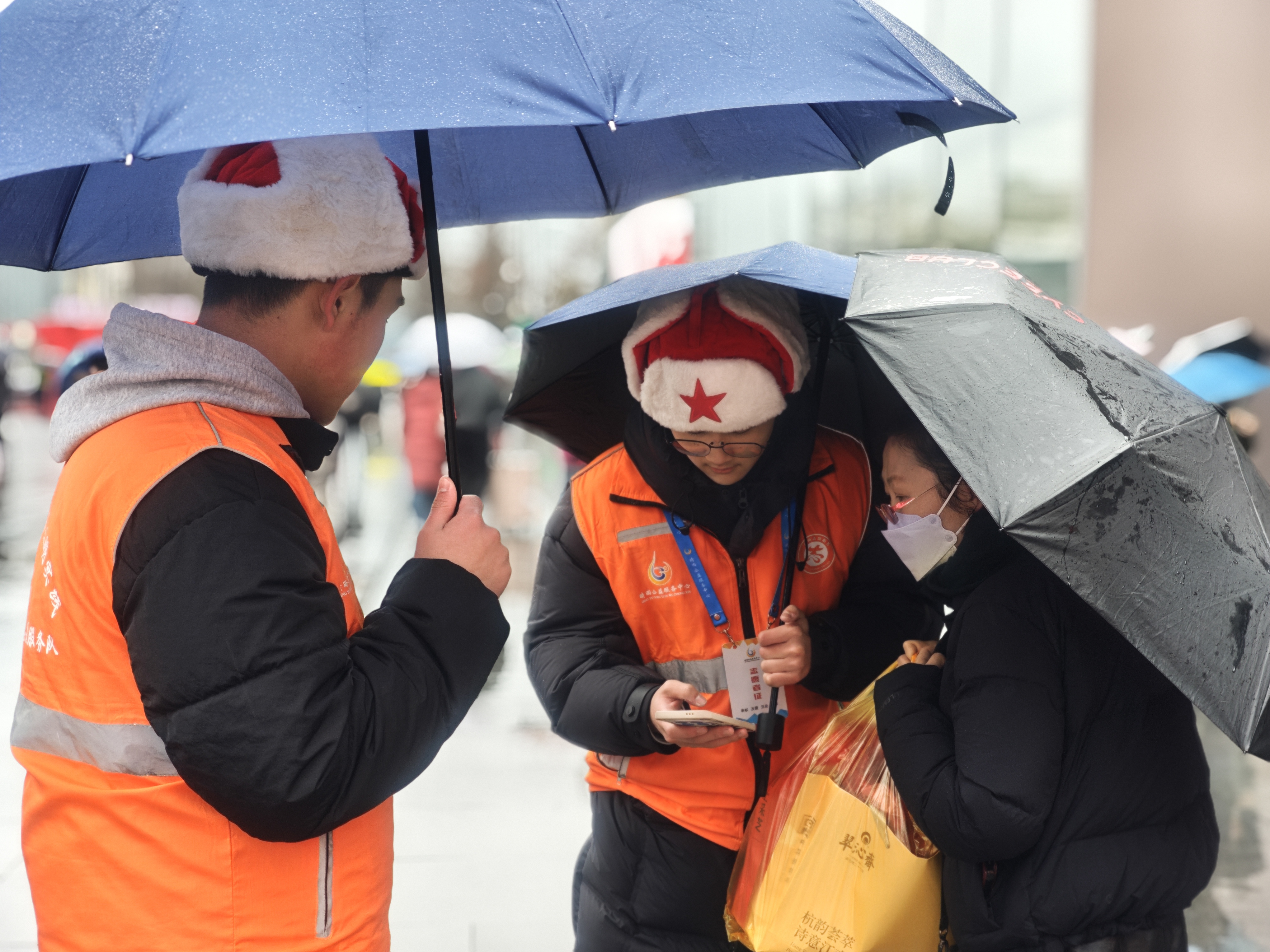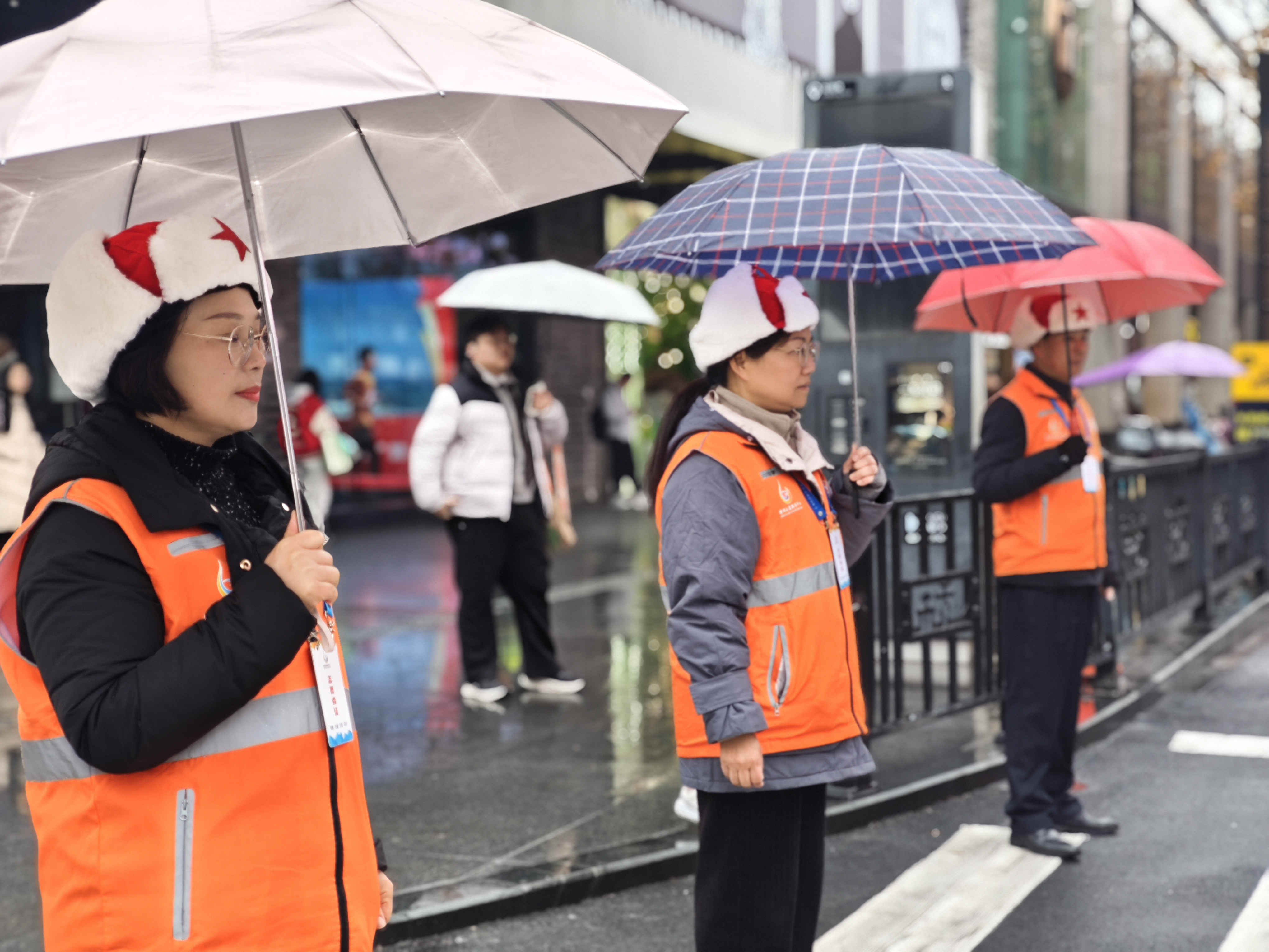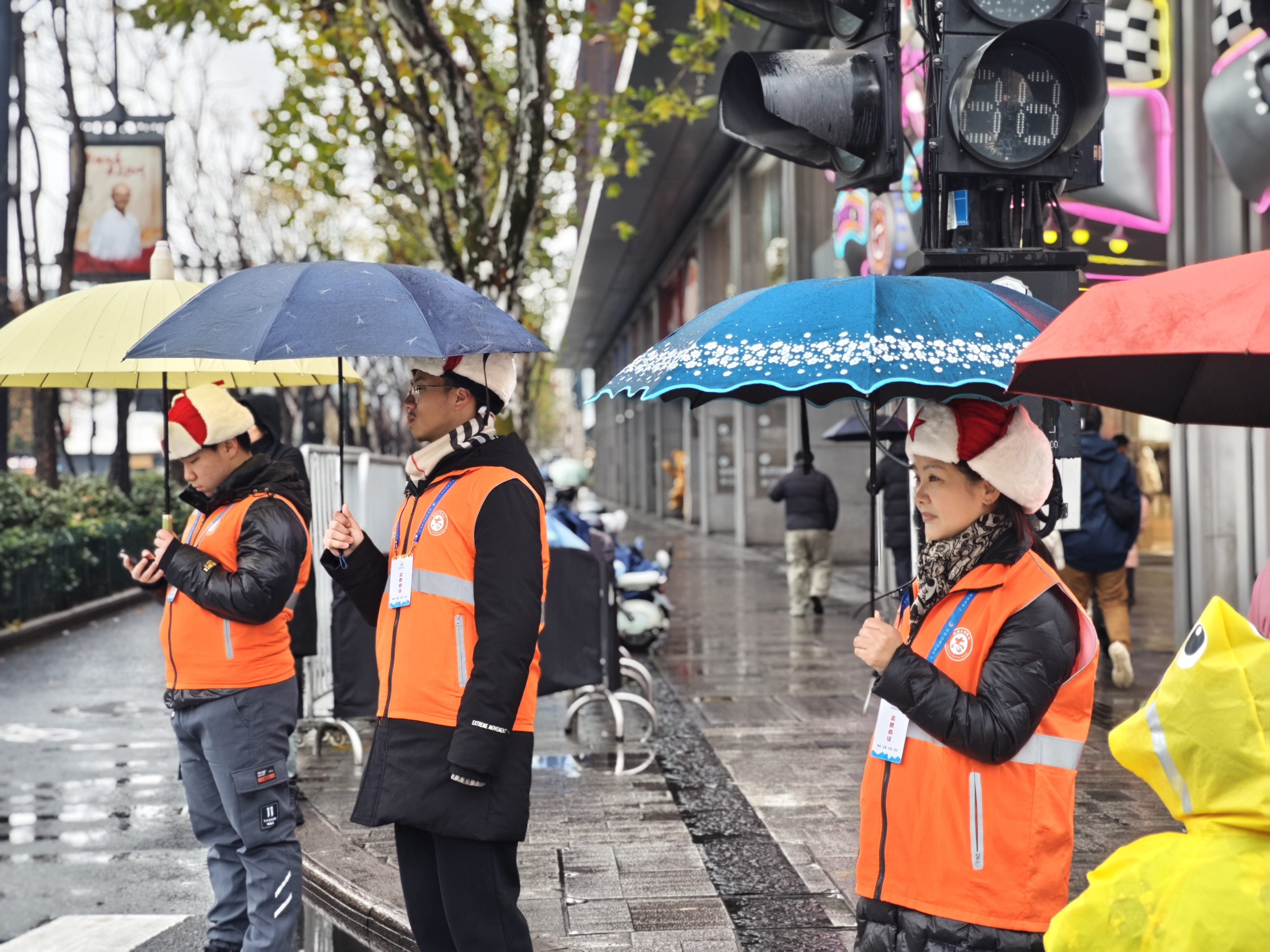 橙衣执伞,雨中筑起最美人墙;西湖畔,志愿红点亮文明出行画卷。