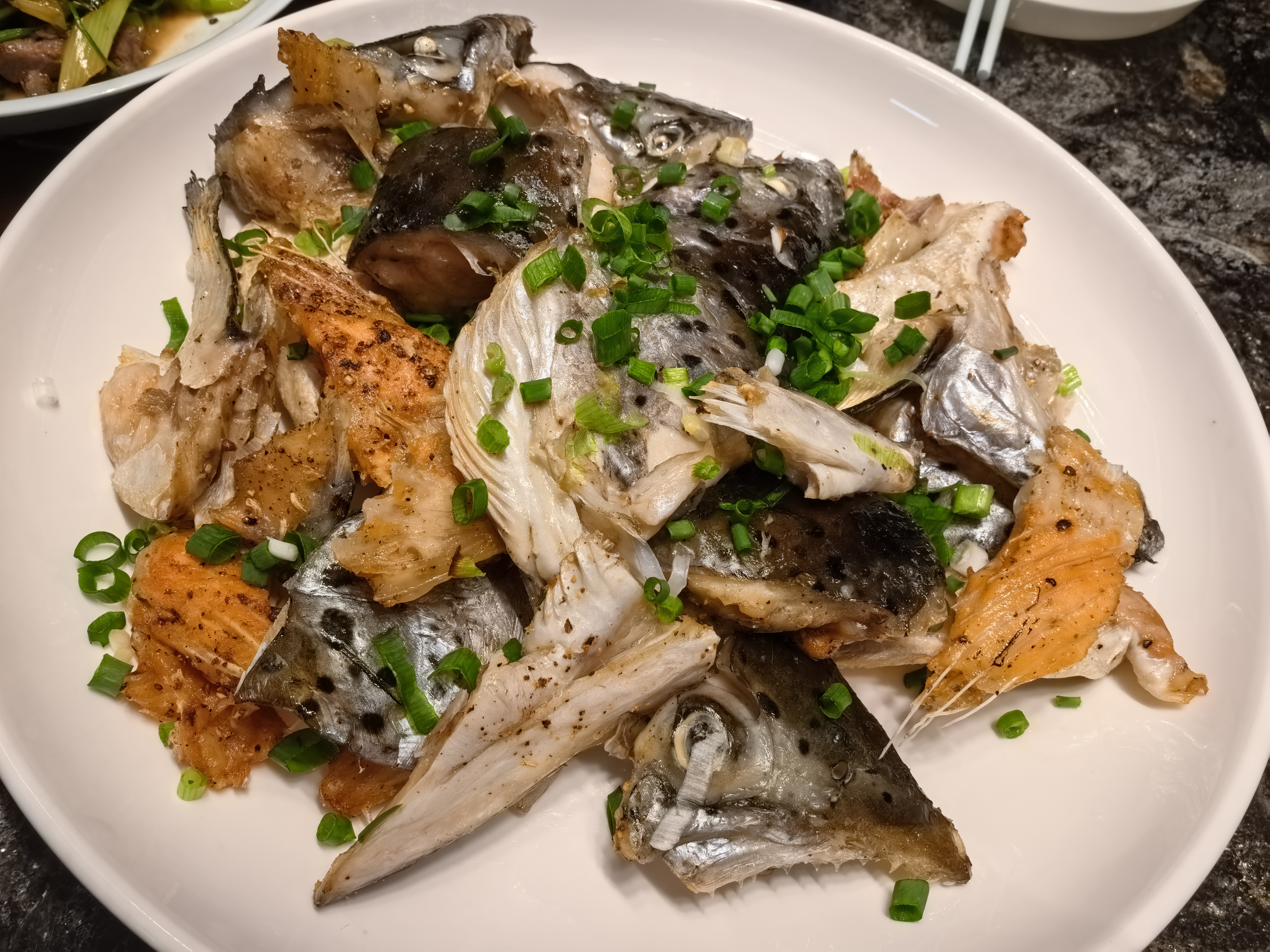 烤鱼上桌,三文鱼片闪着光,鱼头鱼尾摆得俏,葱花一撒,香到邻居来敲门~