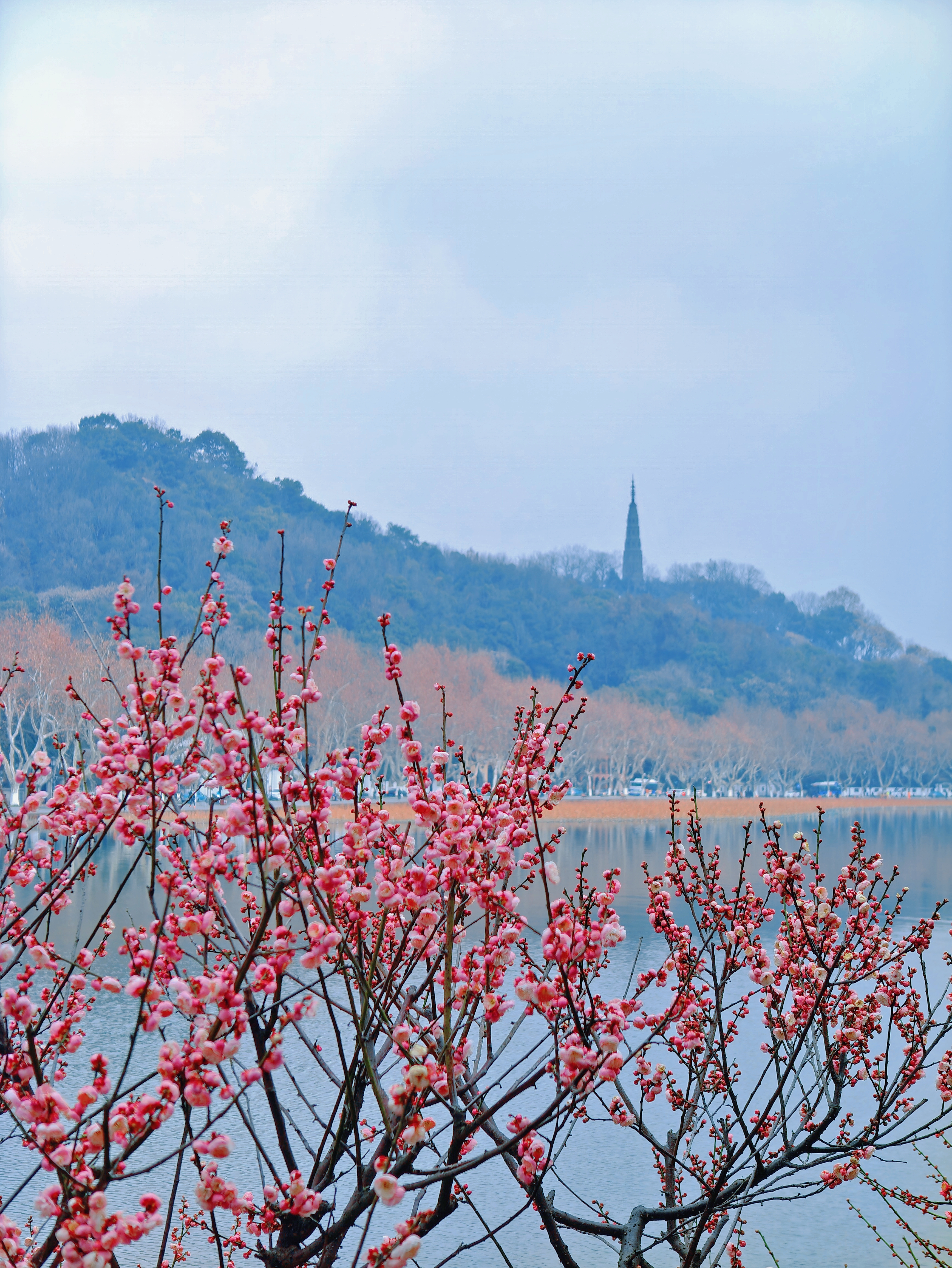 孤山红梅映宝塔,2月1日摄于孤山放鹤亭。
