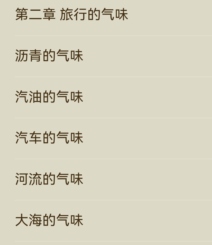 《气味博物馆》第二章《旅行的气味》主要内容: - 沥青的气味:以粗粝、暴晒的公路为意象,把沥青的灼热气息与“风中乡愁”相联结,将其视为旅行的代名词。作者认为沥青路的延伸象征着与熟悉生活的割裂,它带领人们进入未知的外在与内在世界,让旅程成为一场探索自我的成长之旅。 - 汽油的气味:在污染、工厂的现实底色之外,挖掘出“说走就走的旅行”的浪漫感。汽油的化学气息既代表工业文明的痕迹,也暗含着随时启程的自由冲动,呼应了旅行中逃离日常、奔赴远方的渴望。 - 汽车的气味:围绕车漆、皮革的混合香气,关联“权利与自由”的隐喻。汽车作为现代旅行的载体,其封闭空间里的气味象征着掌控旅途的自主感,也暗含着对移动性与个人边界的思考。 - 河流的气味:聚焦河泥、藻类与细菌交织出的黏稠潮湿感,展现自然水域的原始生命力。这种带着野性的气息,让旅行者直面未经修饰的自然肌理,唤醒对土地与生命本源的感知。 - 大海的气味:从沙滩、海洋生物的腥咸中,延伸出“塞壬的魔力”的文学意象。大海的气味既充满诱惑,又暗藏未知的风险,对应着旅途中既迷人又令人敬畏的未知体验。 整体而言,这一章并非单纯描述气味本身,而是借嗅觉打通了旅行的感官体验、文化符号与哲学思考,让每一种气味都成为理解旅途意义的独特入口。