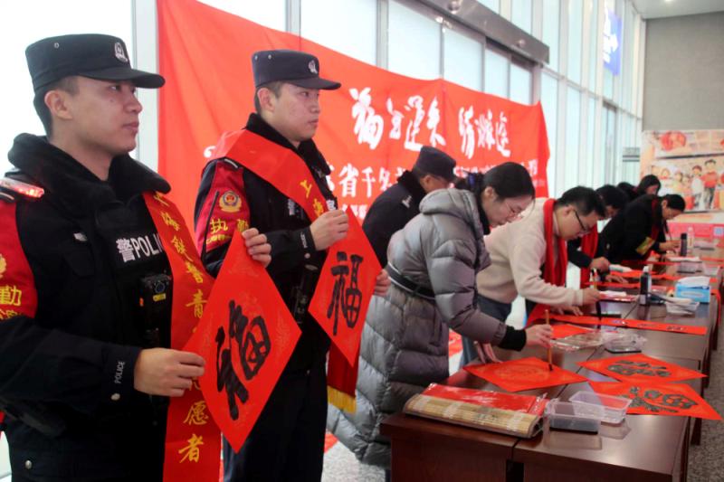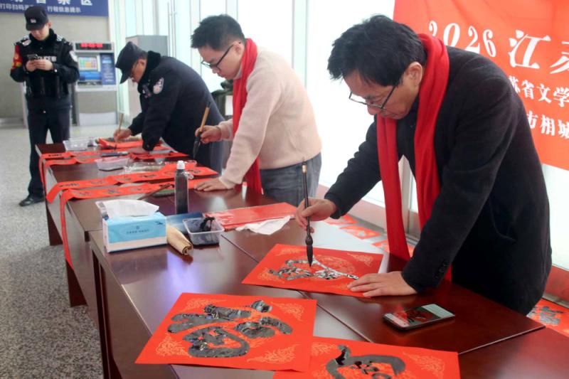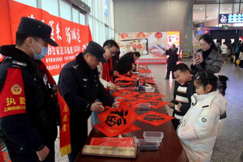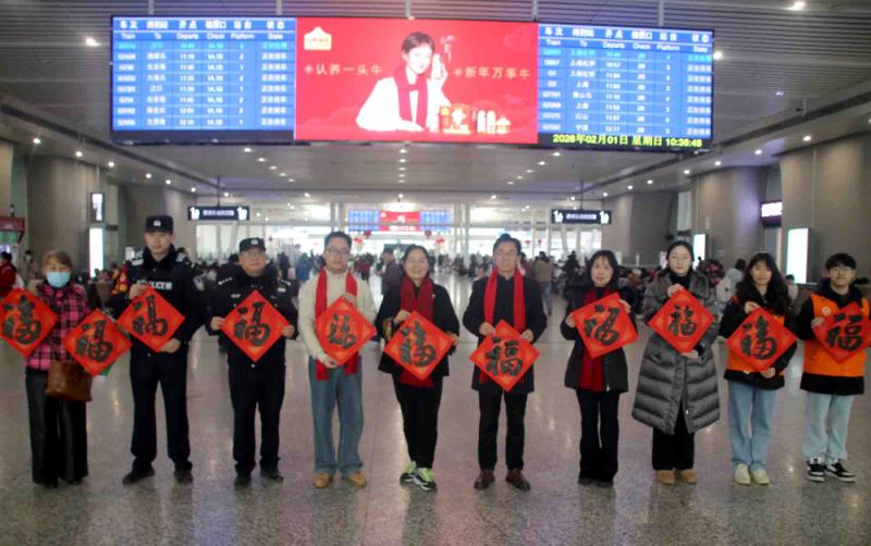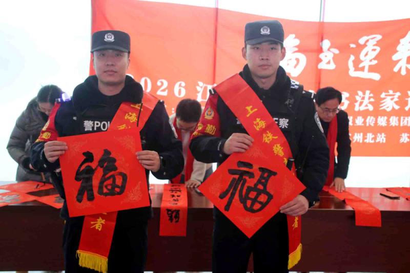 苏州:相城区书法家挥毫送“福” 情暖返乡旅途 (记者 王建康 摄影报道) 2026年2月1日,苏州火车北站人头攒动,却因一抹浓郁的“中国红”与墨香,多了层温暖的新春氛围——“福至运来 情满旅途”江苏省千名书法家送万福进万家活动(苏州北站)在此温情启幕,书法家们挥毫泼墨,为返乡旅客与市民递上满载祝福的“文化年货”。 上午10时许,车站候车大厅,“福至运来 情满旅途”的红色横幅格外醒目。苏州市相城区的书法家站立长桌旁,砚台蓄墨、红纸铺展,狼毫毛笔在指尖灵动游走,“福”字的饱满神韵、春联的对仗平仄,在墨色晕染中次第呈现。 “阿姨,这个‘福’字送给您,祝您新年福气满满!”书法家刚写好的“福”字递到旅客王女士手中,王女士捧着红纸笑得合不拢嘴:“带着‘福’回家,年味儿一下子就有了!”现场书法家正在书写春联,返乡学生小周驻足良久,接过春联时感慨:“坐高铁赶了几小时路,没想到还能收到手写的春联,特别暖。” 据了解,此次活动由江苏省文学艺术界联合会、新华报业传媒集团、江苏省广播电视总台、江苏省书法家协会、中国铁路上海局集团公司联合主办,苏州市相城区书法家协会、铁路苏州北站、苏州北站地区管理办公室、苏州北站派出所协办,是“江苏省千名书法家送万福进万家”活动的重要一站,旅客可将心仪的“福”字、春联带回家,让祝福在旅途中传递。 不少旅客捧着墨宝,与书法家合影留念,候车大厅里,墨香与欢笑声交织,成为春运路上一道别样的文化风景。