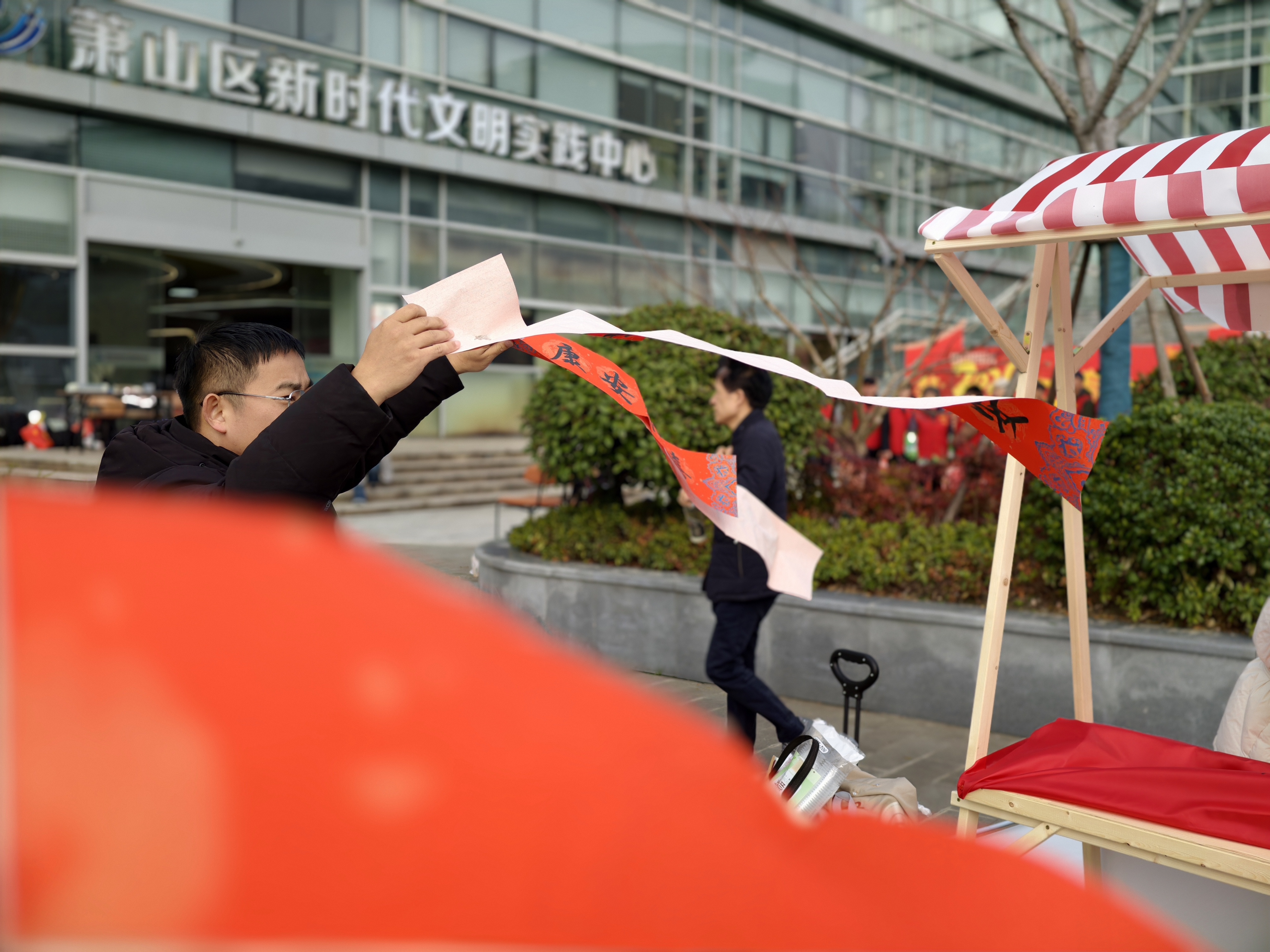 昨日萧山区新年送福活动现场,一阵春风让对联极速飘扬起来