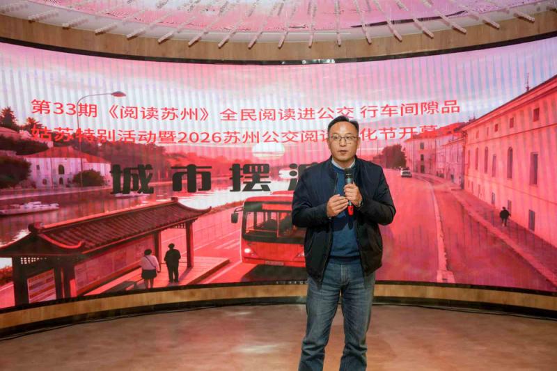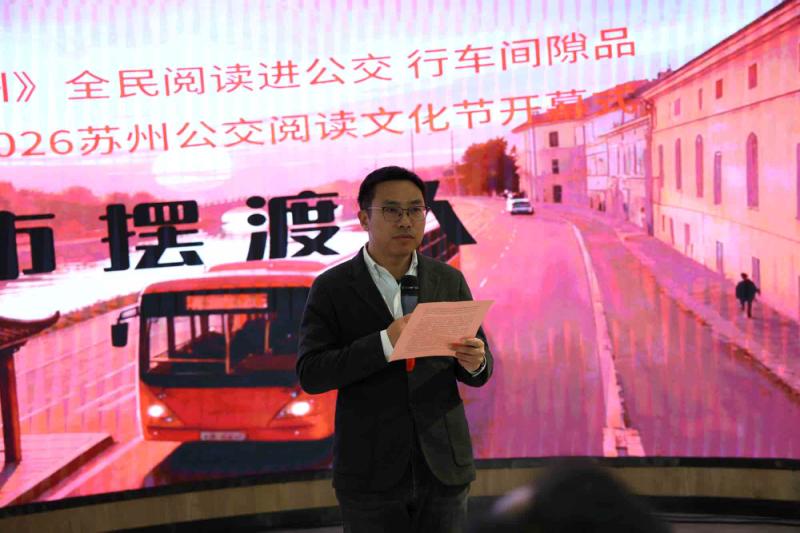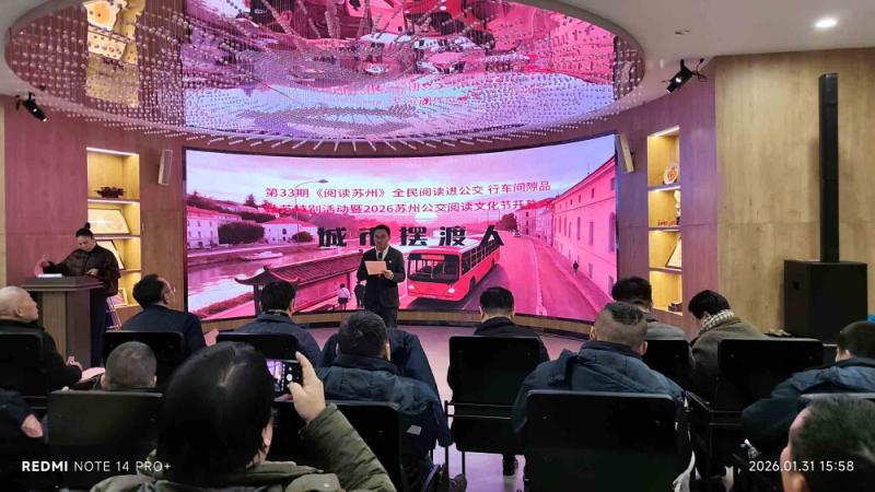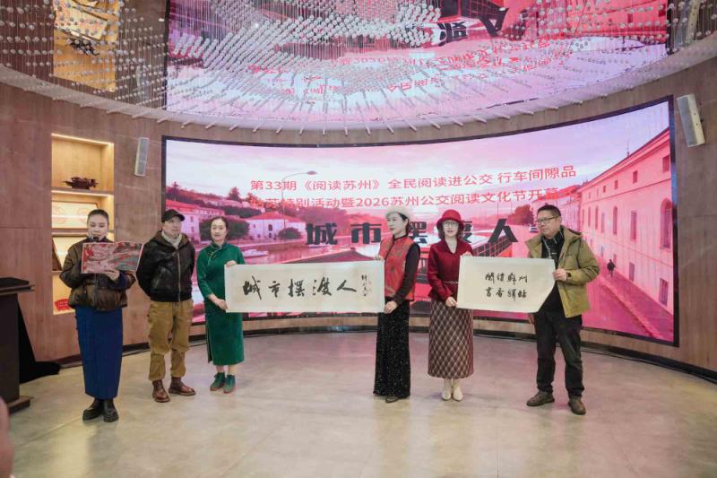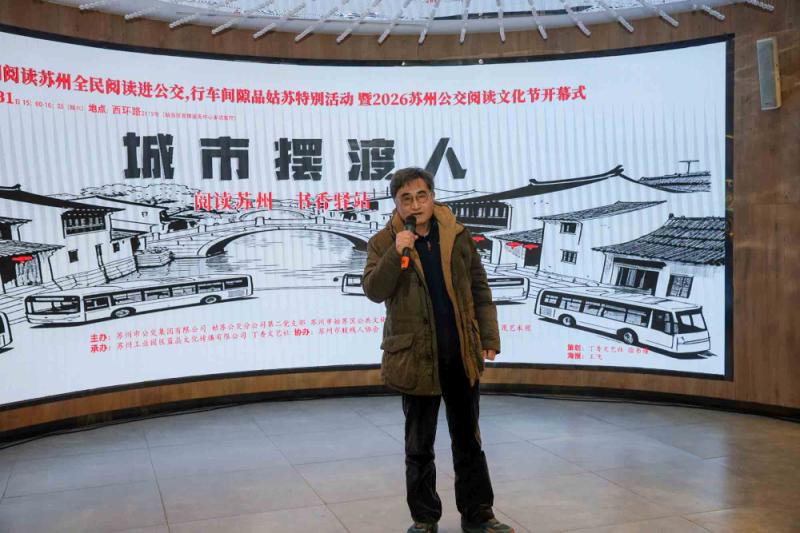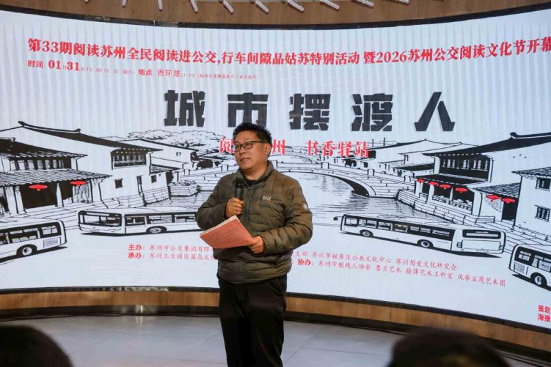 书香伴车轮 文脉润姑苏——第33期《阅读苏州》首个书香驿站落地暨公交阅读文化节盛大开幕 “君到姑苏见,人家尽枕河。”在冬日的清冷中,姑苏城散发着独特的韵味。2026年元月31日下午3点,一场文化盛宴在姑苏区党群服务中心一楼多功能厅精彩上演。此次活动由苏州市公交集团姑苏分公司第二党支部、苏州市姑苏区公共文化中心、苏州历史文化研究会联合主办,苏州工业园区蓝晶文化传播有限公司、丁香文艺社承办,苏州市肢残人协会、墨兰艺术、徐萍艺术工作室、风华正茂艺术团协办,是第33期《阅读苏州》“城市摆渡人·全民阅读进公交,行车间隙品姑苏”活动,同时也是2026苏州公交阅读文化节的开幕式。 活动以江南文脉为桥梁,以公交司机为核心主体,巧妙地将非遗传承、诗文诵读和书香捐赠等元素融合在一起。值得一提的是,活动宣告了“阅读苏州”百个书香驿站的首个驿站正式落地。活动现场捐赠的所有书法作品、书籍、地图以及画作,都将入驻这个标志性的驿站,让书香随着公交的车轮流转,为古老而又充满活力的姑苏城增添了一抹温润而厚重的文化色彩。 活动现场,精心营造出了枕河人家冬日的清雅氛围,悠扬的《姑苏行》旋律在空气中轻轻飘荡,二者相得益彰。主持人徐书僮以“烟雨姑苏,墨染檐角;书香漫巷,风递梅香”这富有诗意的话语开场,向到场的嘉宾们致以了诚挚的问候。随后,他说明了非遗传承人蒋余祥先生因身体原因未能亲临现场的情况,现场嘉宾们一同为蒋先生送上了美好的祝愿。紧接着,《姑苏吆喝》非遗视频缓缓播放,那地道的吴侬软语仿佛穿越了漫长的岁月,唤醒了人们对老苏州市井生活的珍贵记忆。丁香文艺社的演职人员华乃文、金丽萍、陈传奇登台亮相,他们的身影让浓郁的姑苏韵味在厅内久久不散。 诗文诵读环节无疑是活动的一大亮点。潘琼饱含深情地朗读《苏州最柔美的江南》,每一个字都韵味十足,如同温暖的茶水滋润着人们的心田;姑苏区肢残人协会的高春华带来《沧浪亭的春》,在冬日清冷的场景衬托下,仿佛让大家看到了沧浪亭满园的盎然生机;华乃文朗诵《在虎丘》,千年的虎丘塔影仿佛随着他的笔墨在人们眼前流转,尽显古城深厚的文化底蕴;陈传奇用地道的苏白演绎《桃花坞木刻年画》,那软糯悠扬的语调道尽了姑苏的独特风情。一段段优美的文字与苏州的街巷、亭台、塔影完美融合,让在场的每一个人都在诵读中邂逅了江南的柔情,深刻感受到了文化传承的强大力量。 作为活动的核心环节,书香捐赠充分表达了对“城市摆渡人”——公交司机们的深深敬意,也为首个书香驿站奠定了坚实的文化基础。韩苏亮先生虽未能亲临现场,但他委托友人带来了《城市摆渡人》与《阅读苏州·书香驿站》两幅书法作品。那刚劲有力的笔锋间,满是对公交司机的赞美和对阅读文化的美好期许。这两幅作品未来将作为驿站的精神标识,营造出浓厚的阅读氛围,让书香弥漫在车厢的每一个角落。 苏州市姑苏区公共文化中心副主任、姑苏区全民阅读促进会副会长陈佳晶代表单位,带来了丰富的书刊和中文版苏州地图。 在分享与演绎环节,张笑川教授深情讲述了《流动苏州》的创作故事,他的笔墨间印满了姑苏的桥与水,让大家深刻理解了这座城市在流动变化中对文化的坚守。朱光磊教授登台,详细解析了吟诵的特征与功用。 苏州著名文学史家祝兆平先生从专业的角度,阐释了读书对于公交人以及城市文化发展的多重深远意义。 苏州市公交集团姑苏分公司第二党支部副书记李福全在致辞中,表达了对城市摆渡人的殷切期望和对书香公交的美好祝愿。 参加活动的嘉宾沈建良先生压轴致辞,为活动增添了浓墨重彩的一笔。通讯员/徐书僮