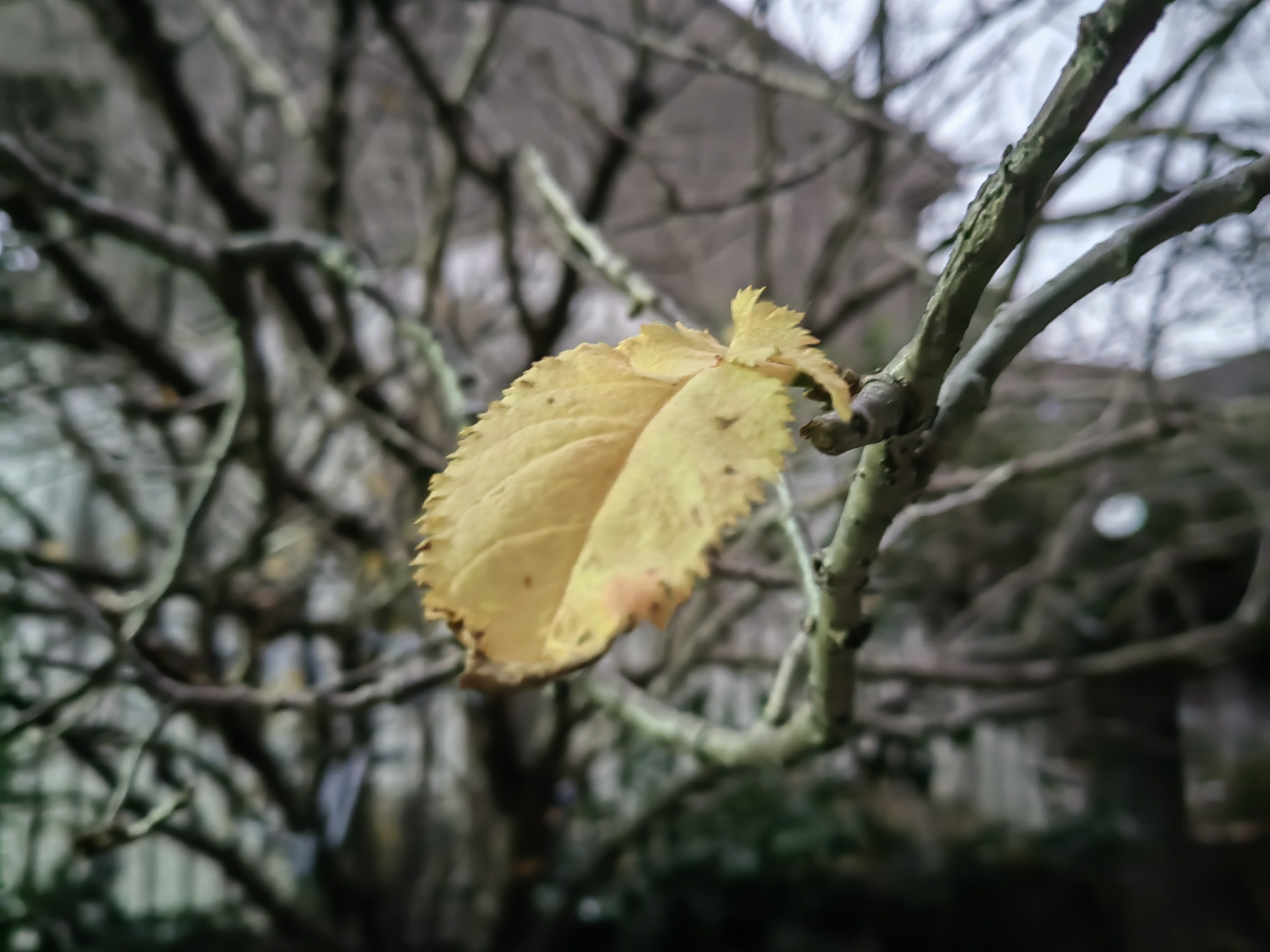 它还栖在枝头,仿佛是尊雕像 不是倔强,也不是不舍,那姿态近乎一种遗忘。仿佛季节更迭时,一个仓促的转身,就把它遗忘在了时间的夹缝里。于是,它便这样悬着,在万千落尽繁华、裸向天空的枝桠间,做一枚无人签收的、最后的信笺。 叶是枯透了,那种黄褐色,是泥土与火焰、暮色与记忆熬煮后残余的渣滓。边缘蜷缩着,像被火焰舔过,留下了焦灼而脆弱的弧度。那叶脉却还清晰,一道一道,从叶柄处辐射出去,像一张干涸河床上龟裂的纹路,又像一双伸向虚空、却已无力握拢的手掌。那是它生命的疆域图,曾经奔涌过春的汁液与夏的绿潮,如今,疆土已失,只余下这战败的版图,沉默地宣示着存在。 背景是模糊的,一片深深浅浅的灰褐,是无数细小、交错的枝条织成的、迷离的网。光在这里变得犹豫而稀薄,筛下一种介于黄昏与黎明之间的、无法命名的色调。那虚化的朦胧,将一切喧嚣都推远了,世界退为一片混沌的、低沉的叹息。唯有它,被一种近乎残忍的清晰凸显出来,钉在这寂寥的背景上,成为目光唯一无法逃脱的焦点。 它所在的枝桠,是深灰褐色的,带着细微的颗粒,像老人手背上静默的筋络与斑点。那弯曲的弧度,是一种承受了太多风霜雨雪、太多重量的弧度,如今,连最后这一点微不足道的、叶的重量,也成了一种甜蜜而酸楚的负担。 它就偏安在画面的一隅,不在中央。这位置是好的,带着一种不事声张的尊严。若在正中,便显得太像宣言,太像纪念碑。而在这里,它只是一种“尚在”,一种“偶然”,一种即将被下一阵风完成的、未完成的告别。 整个画面的调子是冷的,暗的。灰褐是大地冬眠的呼吸,深绿是远处常青树模糊的、遥远的回响。所有的色彩都仿佛在向一个中心坍缩,归于沉寂。唯独这片叶子上,那残存的一抹黄褐,竟成了这灰调宇宙里,最后一点尚未熄灭的、微温的余烬。 它不悲,不喜。它只是“在”。在枝头与泥土之间,在告别与未别之间,在消逝的途中,作一个短暂的、金色的停顿。风来的时候,它会走的。但在风来之前,在这片刻的、被镜头凝固的永恒里,它以全部的枯槁与静美,完成了对生命最温柔,也最决绝的诠释:我曾绿过,如今我这样黄。我见过最盛的阳光,如今,我便这样,独自面对一整片天空的苍茫。 这是秋冬的句读,一个最轻,也最重的标点。