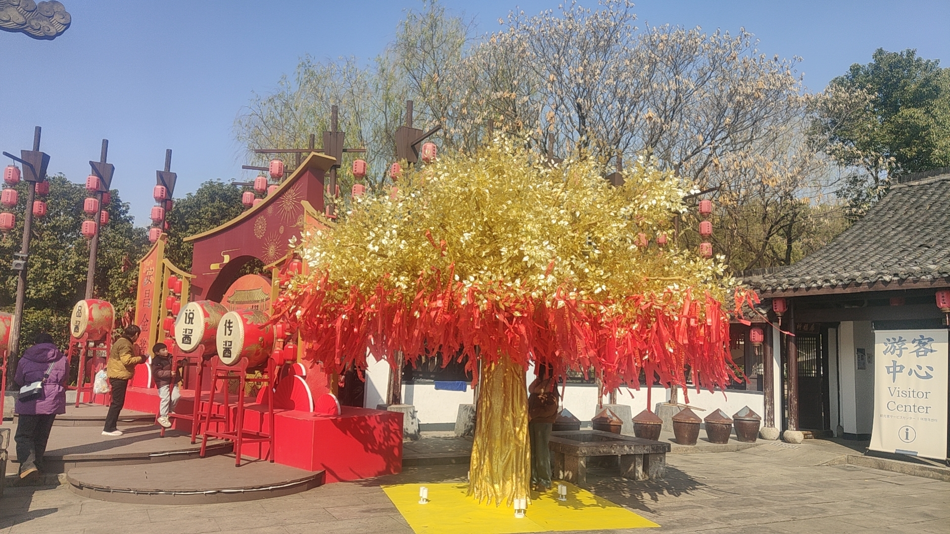 红灯笼映晴空,金树摇曳古坊间;鼓台香炉旁,游人驻足,春意与年味在青瓦白墙间静静流淌。