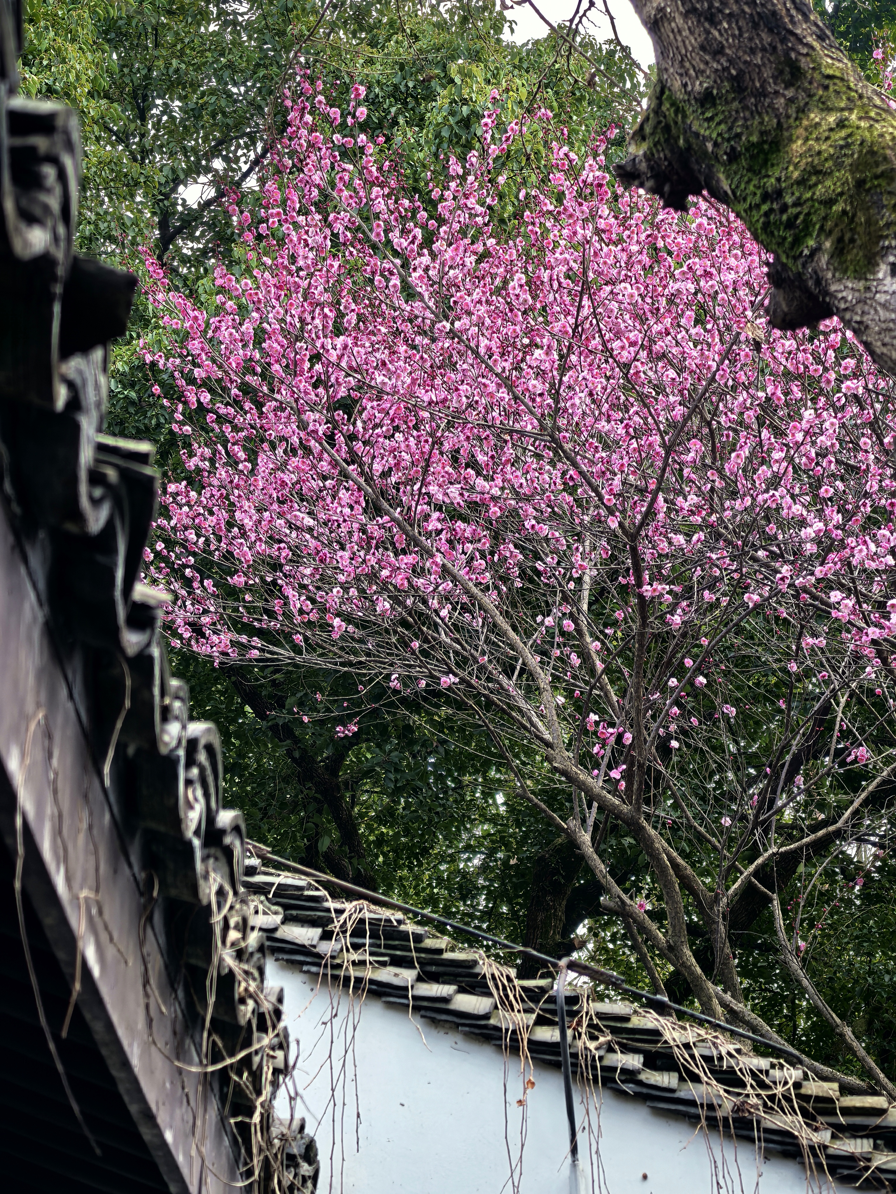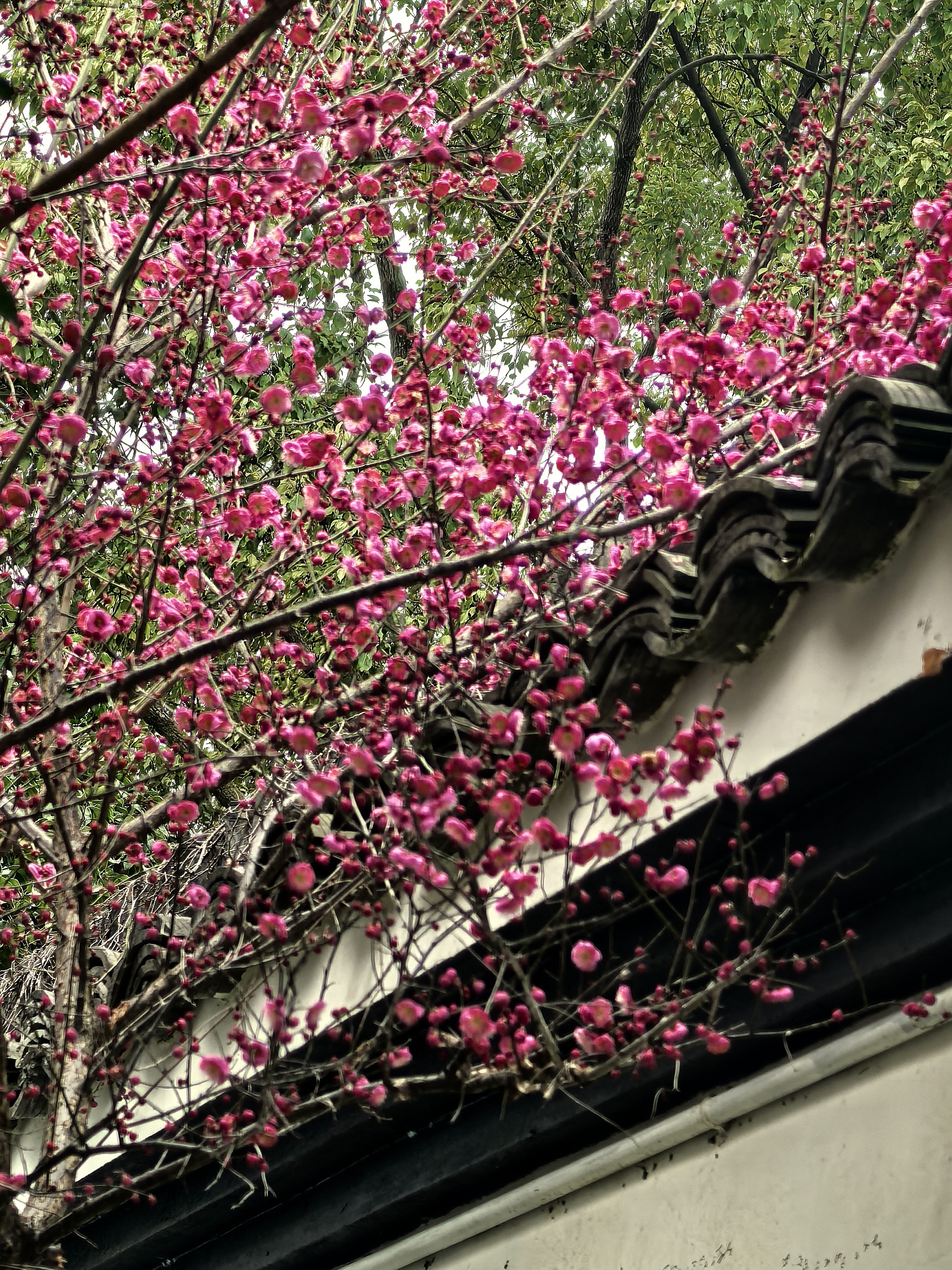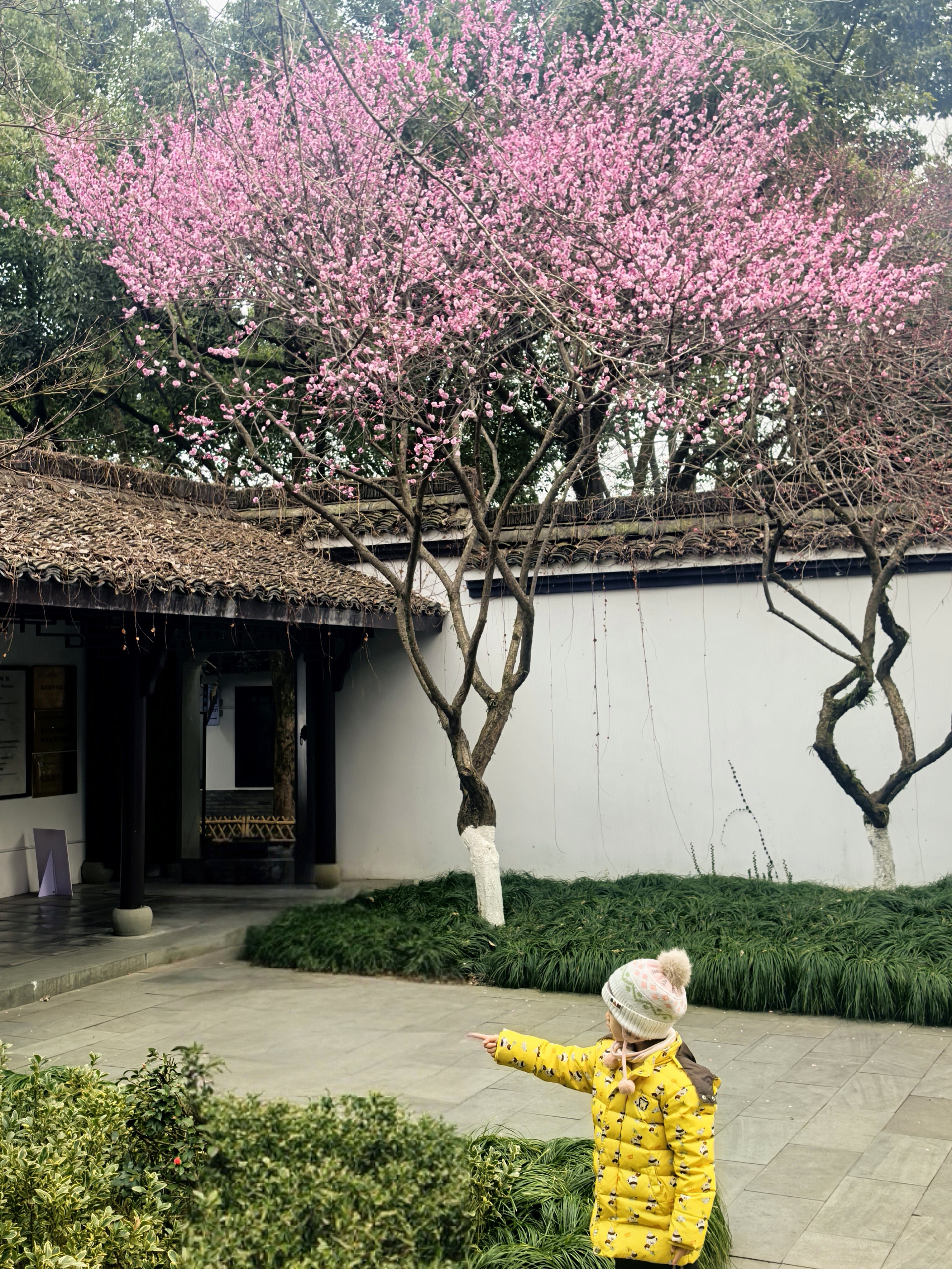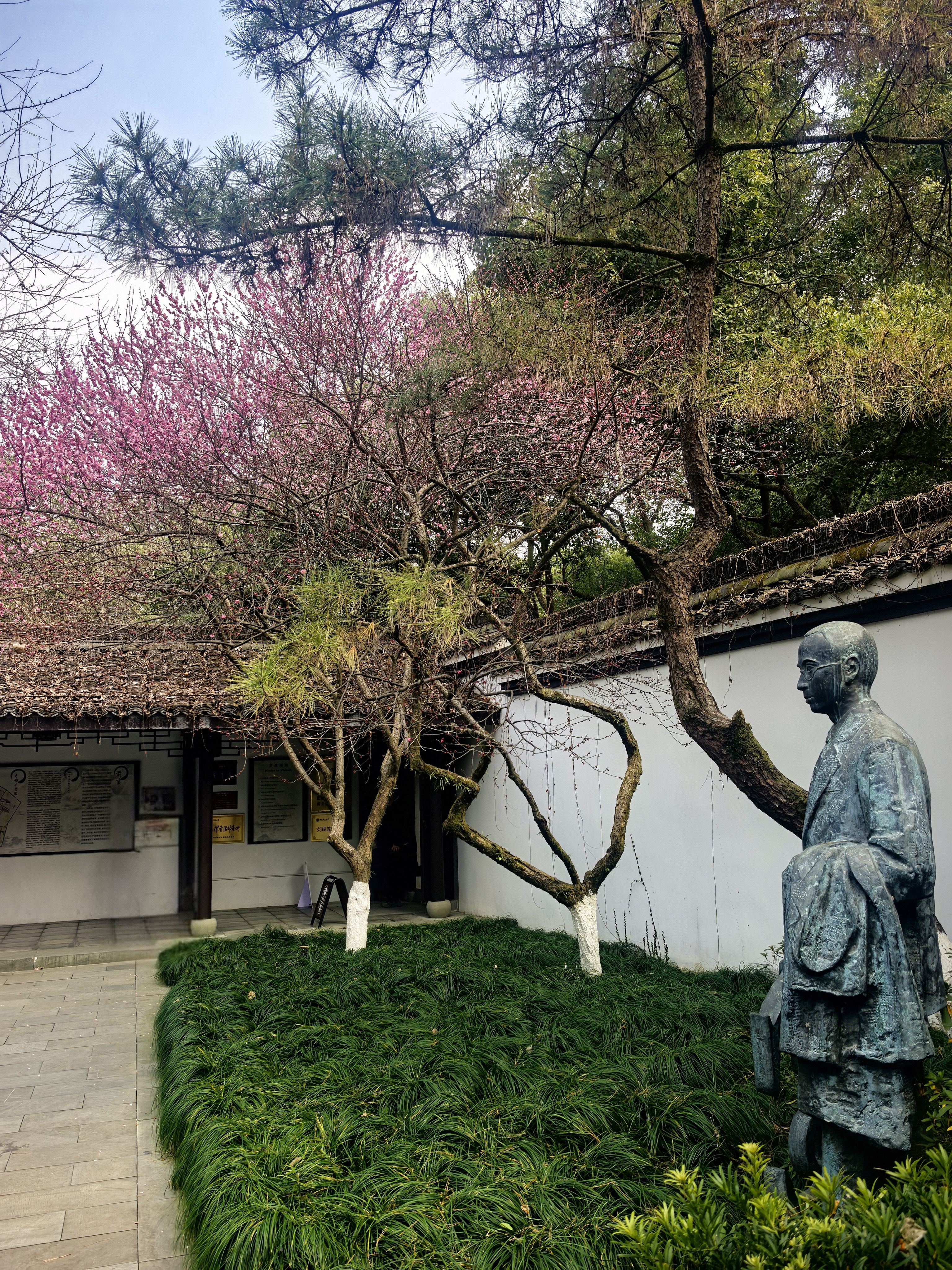 白墙黛瓦间,几株老梅斜倚爬满枯藤的墙头,粉瓣如云,暗香浮动。路人经过仰头畅望,那一种墙内开花墙外香的画面感呼之欲出。 都锦生故居的梅花,不似孤山那般尽人皆知,它只在这深宅小院里,静默地开着。虬曲的枝干,随便印在斑驳的白墙上,便是一幅天然的水墨画。 园中很静,唯闻三两声鸟鸣。游人寥寥,偶有一位老者拄被子女搀扶着而来,对着梅树凝望片刻,又悄然离去。这样清寂,倒与梅花的孤高之性十分吻合。 都锦生的雕刻就立于旁边,我特意拍了张他斜望梅花的照。想那先生当年,在此织锦作画,梅香相伴,该是何等的雅致。 眼下唯梅树年年报春,守着这方天地,不争不抢,自开自落。这般风骨,恰如主人风范,虽隐于市井,却自有风韵。杭城赏梅之二都锦生故居。