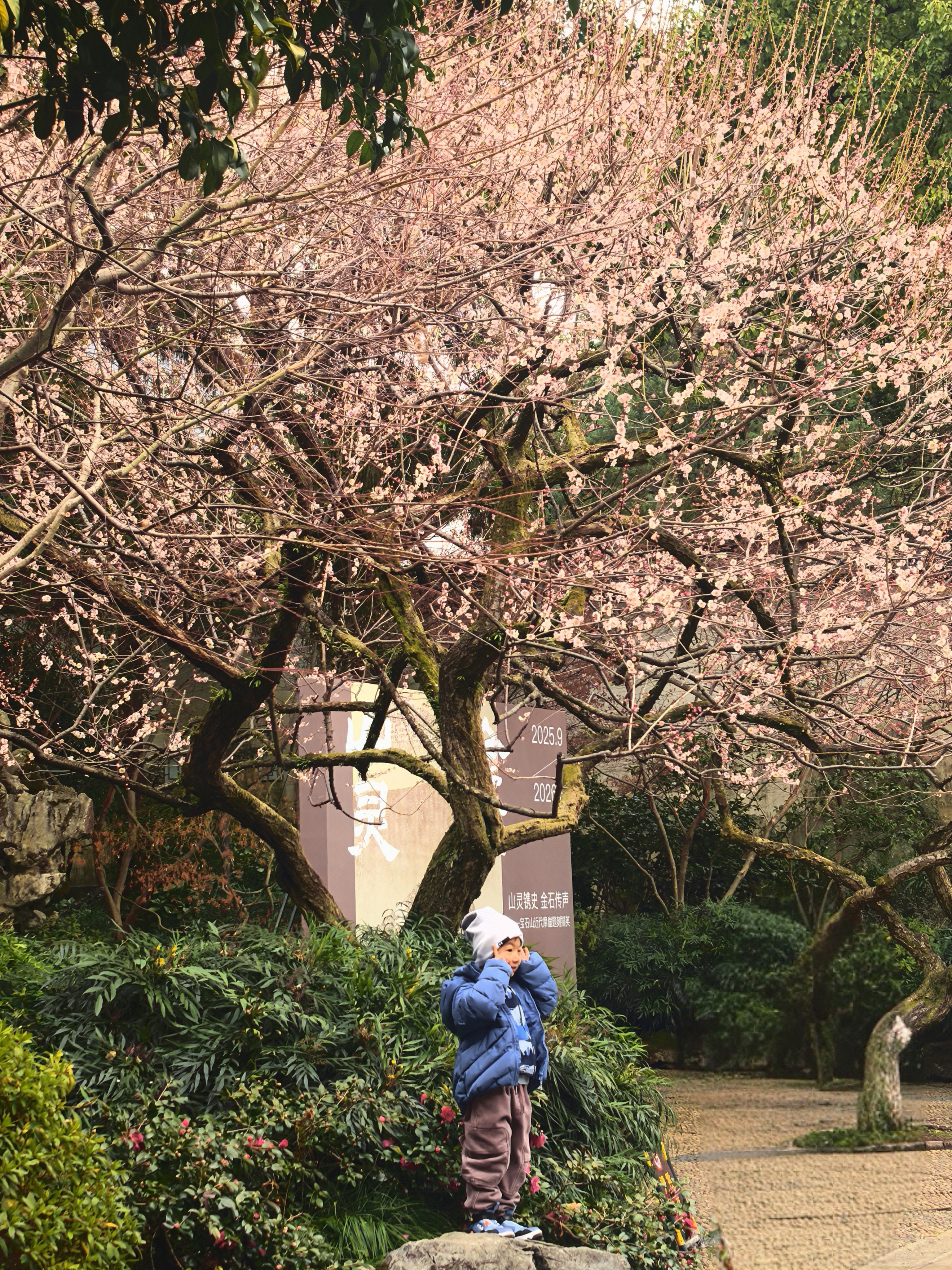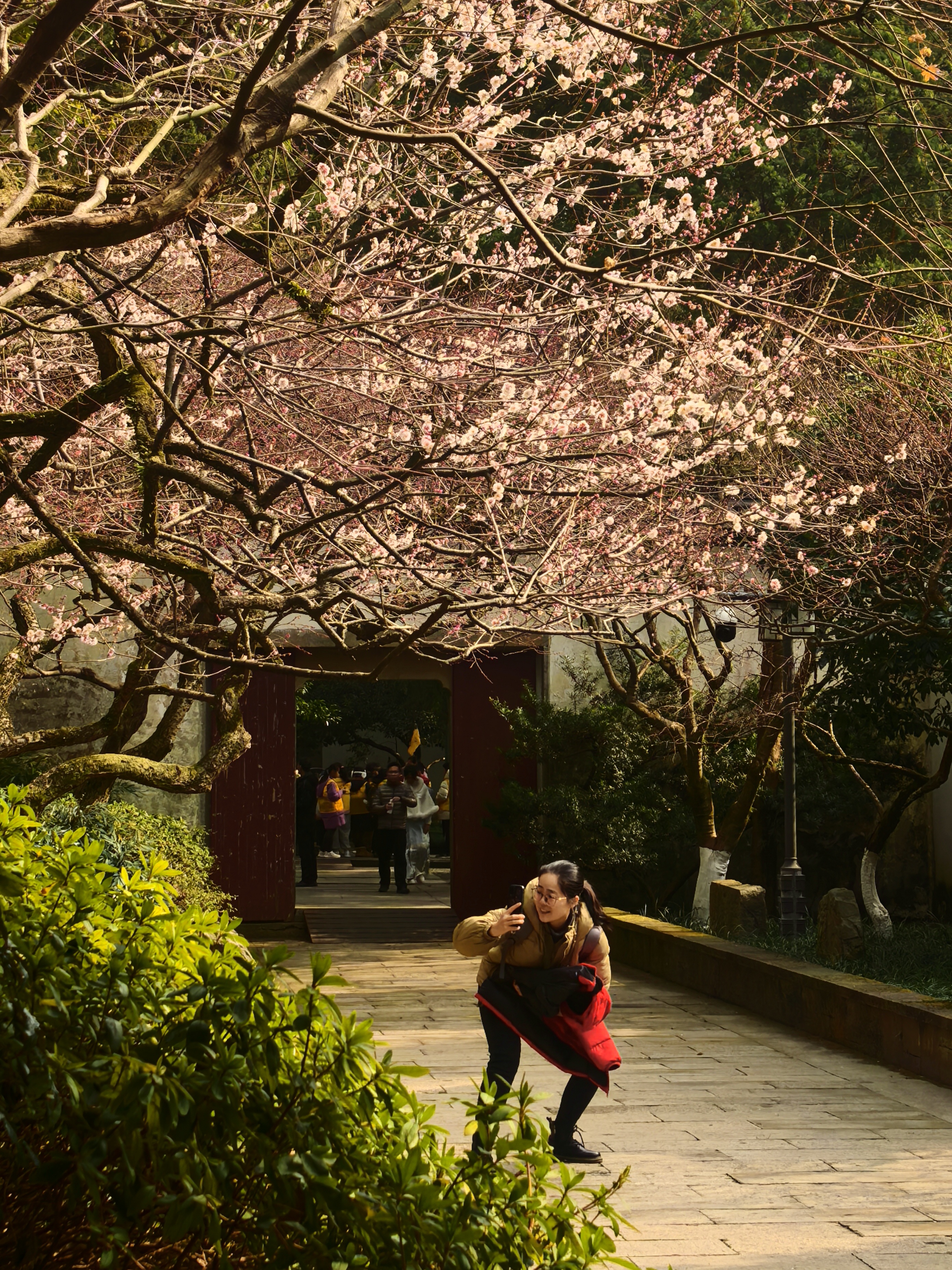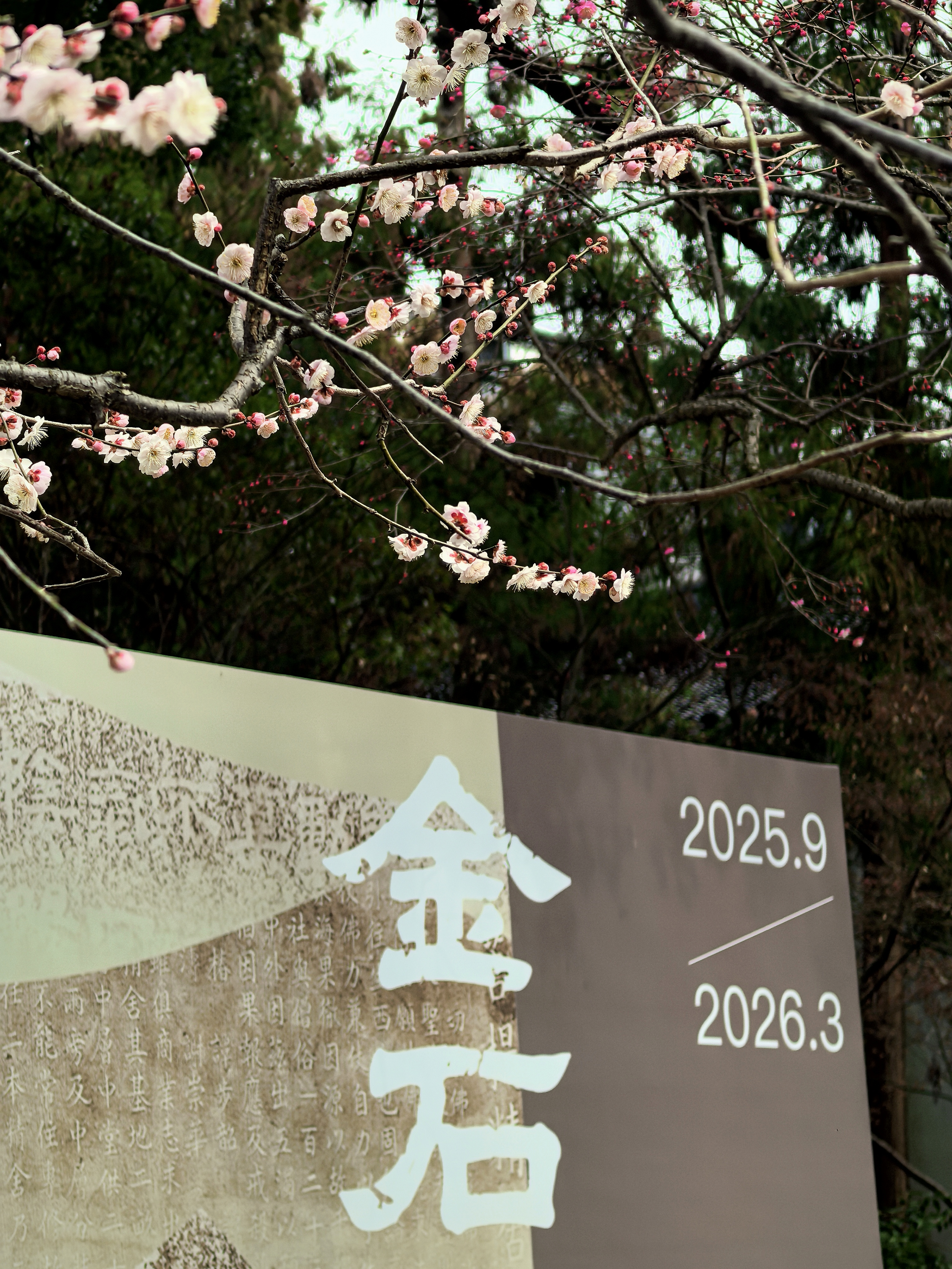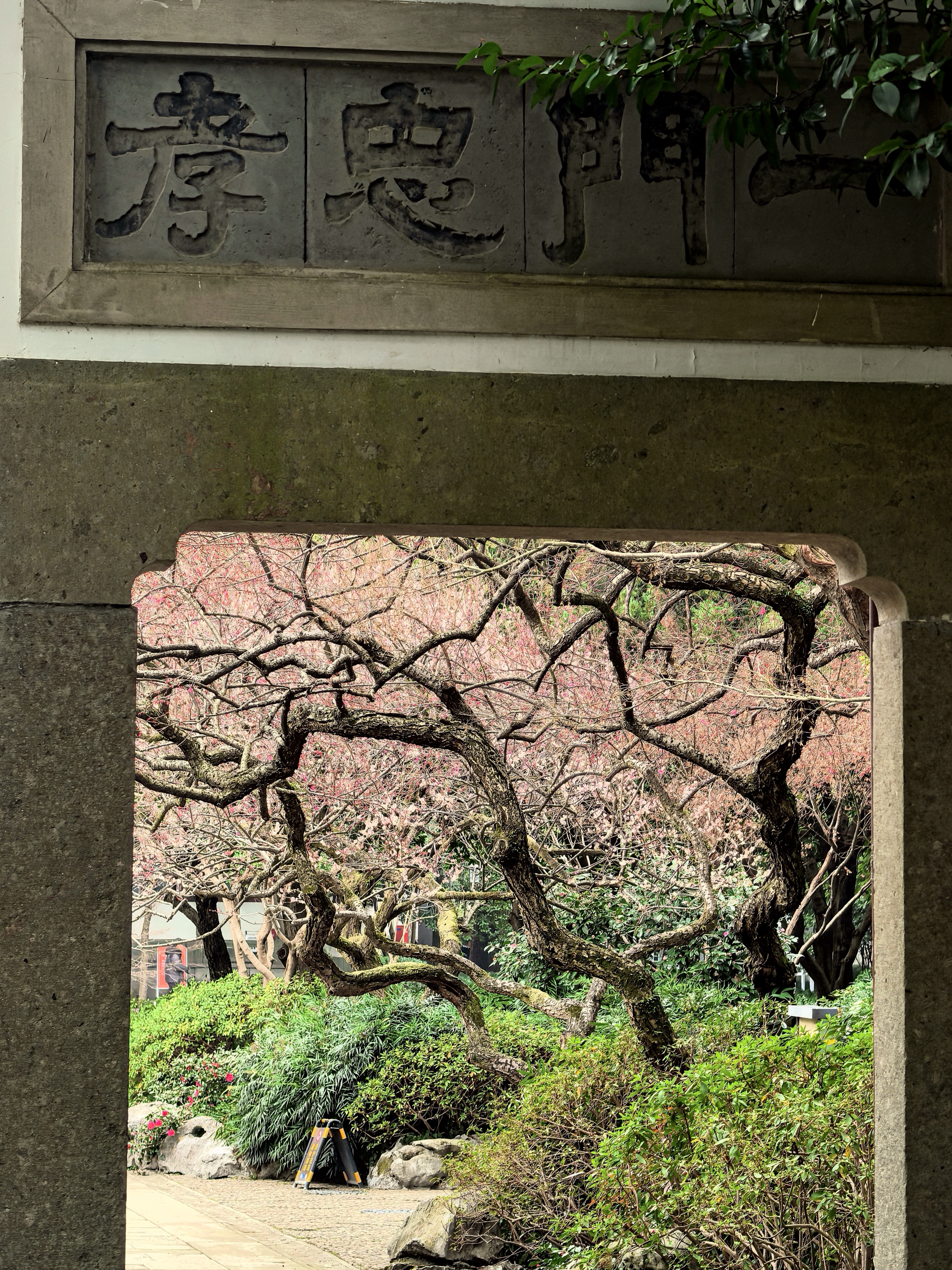 自去年赏梅岳庙,今年就惦记着这里的梅景。穿过“一门忠孝”的石门,就可以见到几株老梅倚着高大的古樟而立,枝干如铁,花却极柔,粉白相间,疏疏落落缀在苍劲的枝头,自有一番肃穆气象。 游人三三两两,多是来拜谒岳王墓的,很少几个驻足赏梅的,只在树下站立片刻,便匆匆离去。大概是岳王忠烈之气太盛,压过了赏梅的闲情。 梅树下观察了很久,看花瓣随风飘落,却没有“零落成泥碾作尘”的艾怨。这梅花开在忠烈祠前,便不似别处的轻佻,倒像是为英雄守节的女子,清冷中带着一股刚烈,倒也应了“梅伴忠魂”之意。杭城赏梅之三岳王庙。