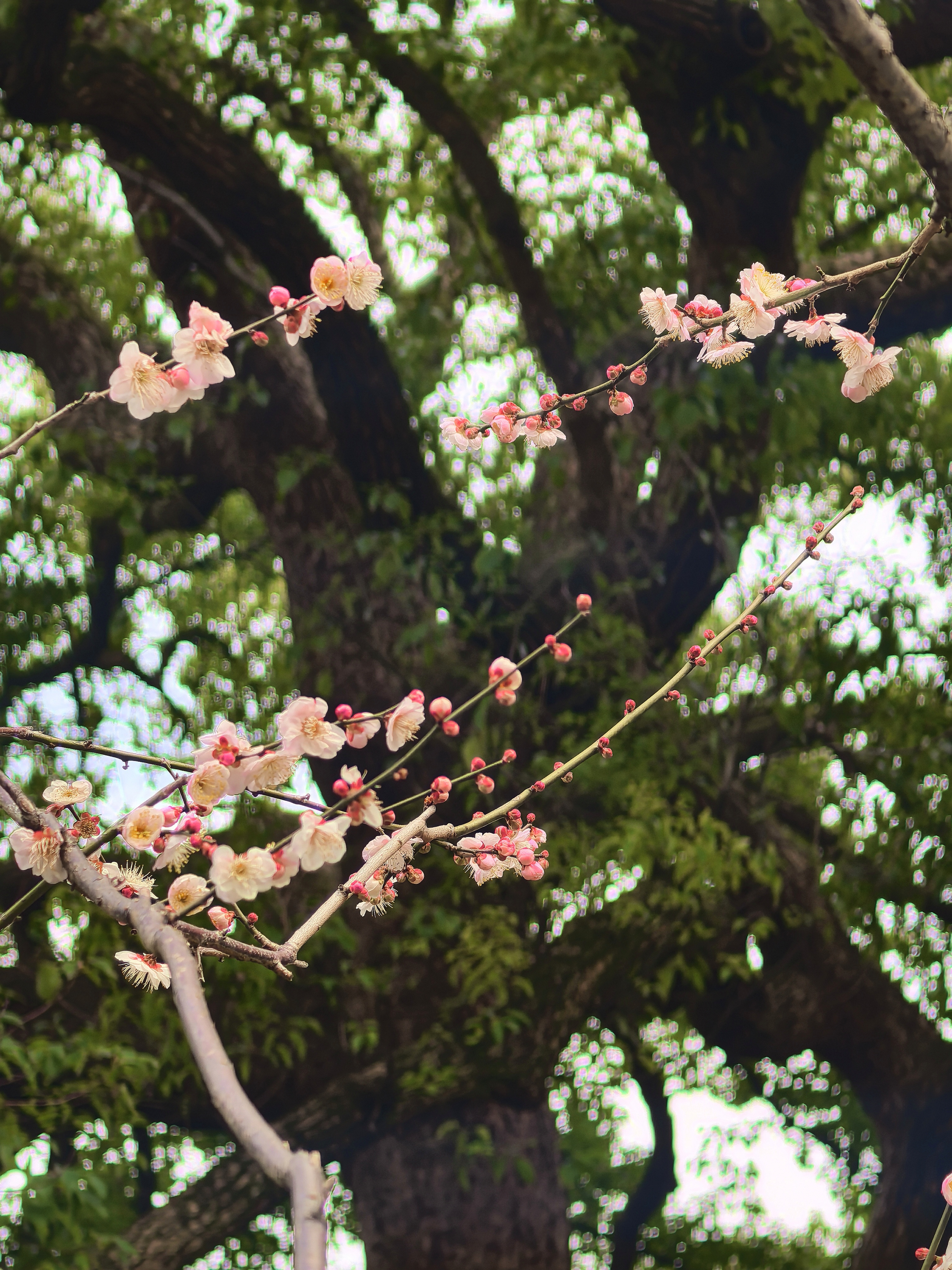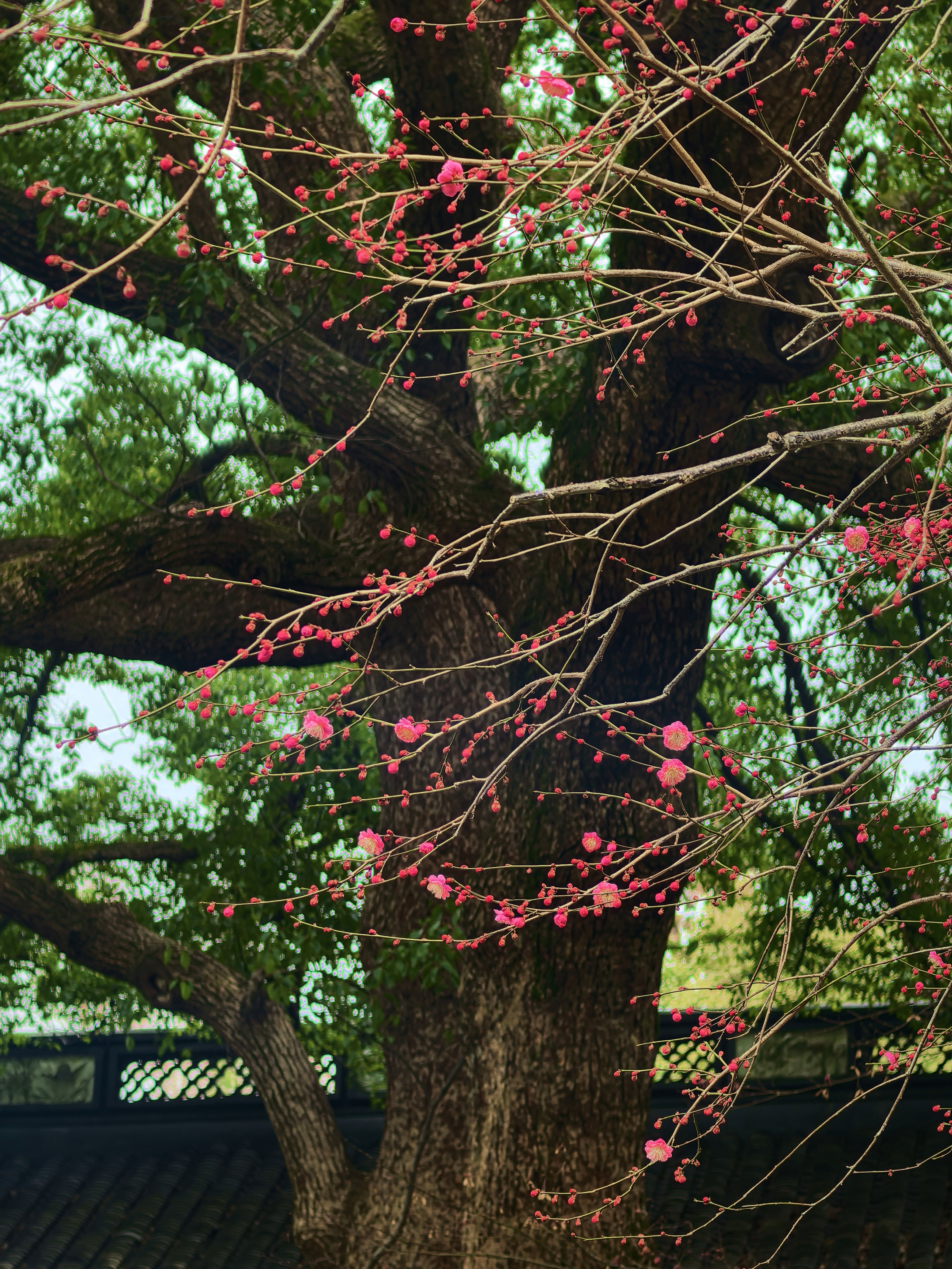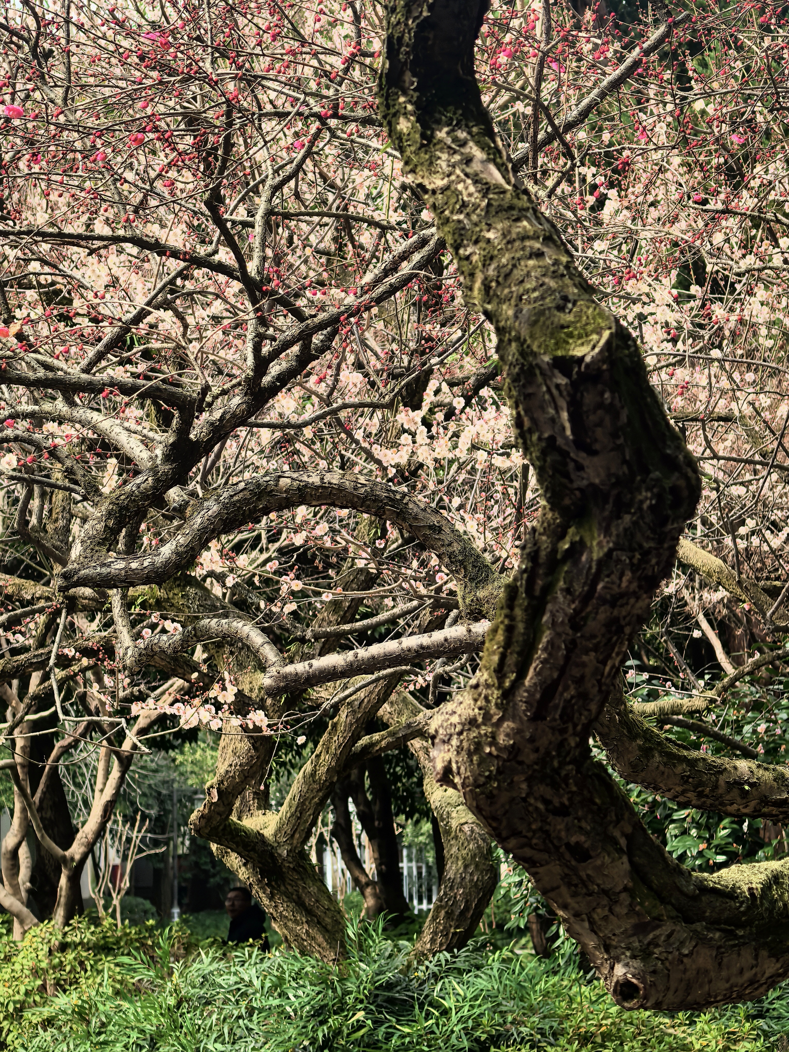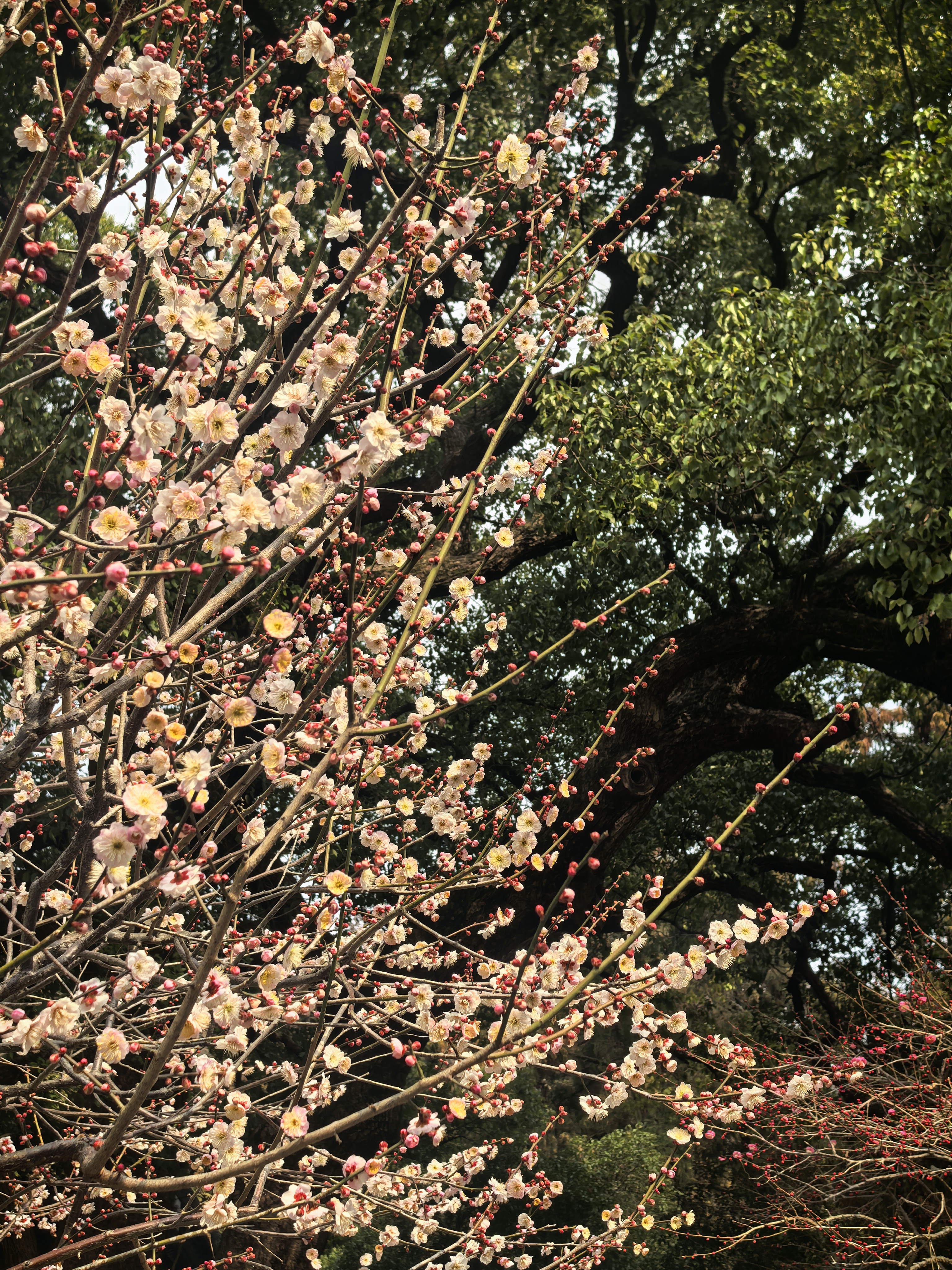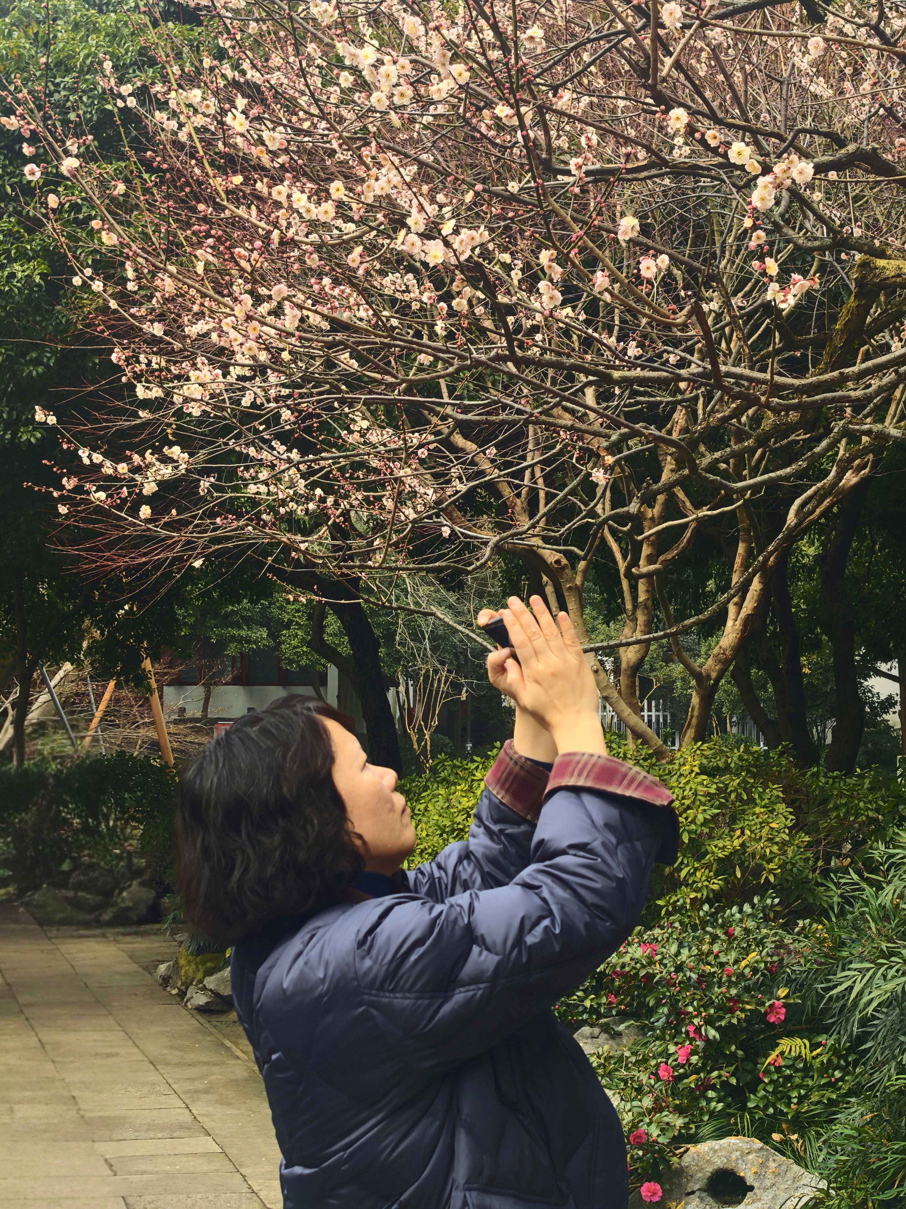 自去年赏梅岳庙,今年就惦记着这里的梅景。穿过“一门忠孝”的石门,就可以见到几株老梅倚着高大的古樟而立,枝干如铁,花却极柔,粉白相间,疏疏落落缀在苍劲的枝头,自有一番肃穆气象。 游人三三两两,多是来拜谒岳王墓的,很少几个驻足赏梅的,只在树下站立片刻,便匆匆离去。大概是岳王忠烈之气太盛,压过了赏梅的闲情。 梅树下观察了很久,看花瓣随风飘落,却没有“零落成泥碾作尘”的艾怨。这梅花开在忠烈祠前,便不似别处的轻佻,倒像是为英雄守节的女子,清冷中带着一股刚烈,倒也应了“梅伴忠魂”之意。杭城赏梅之三岳王庙。