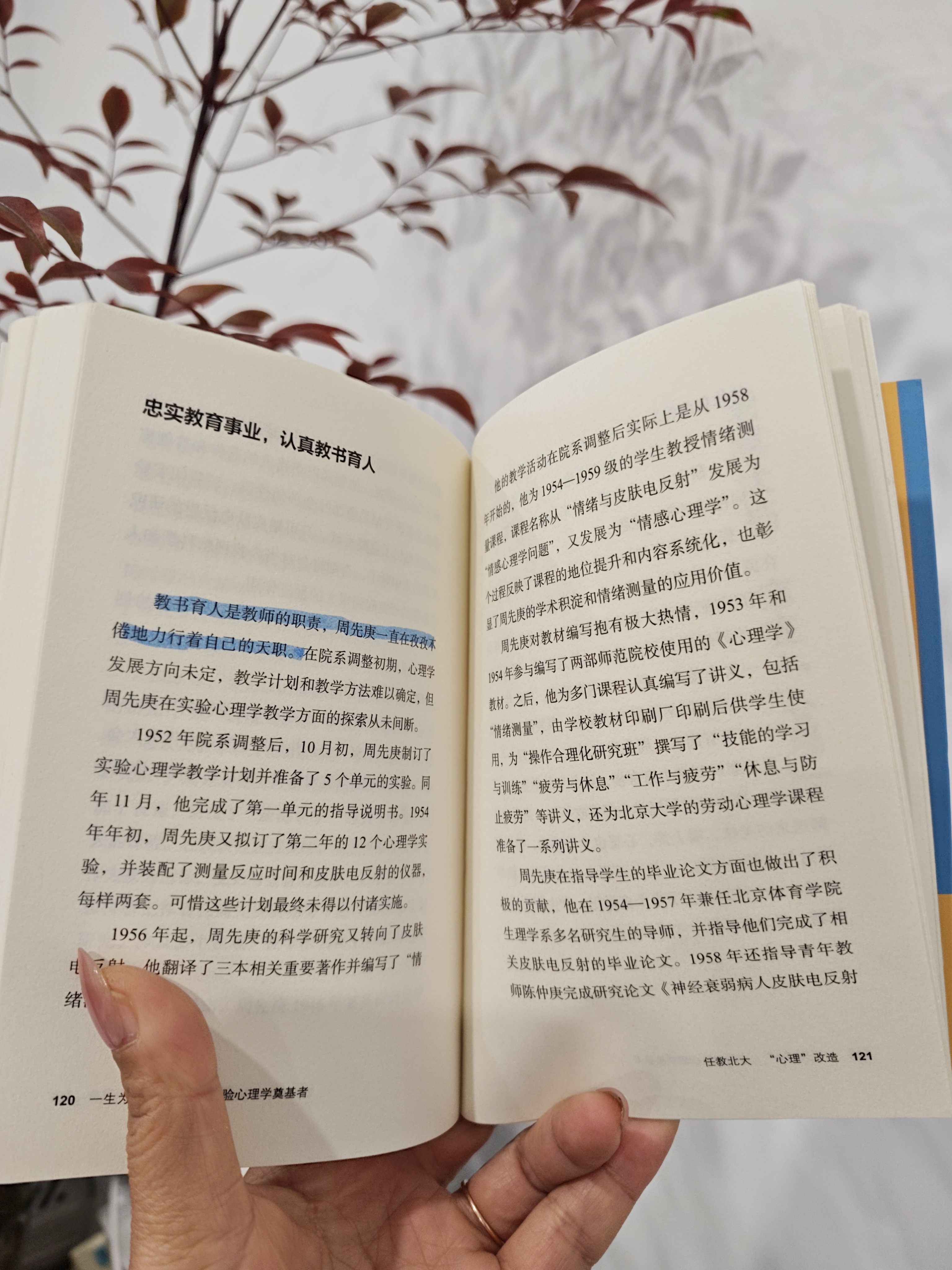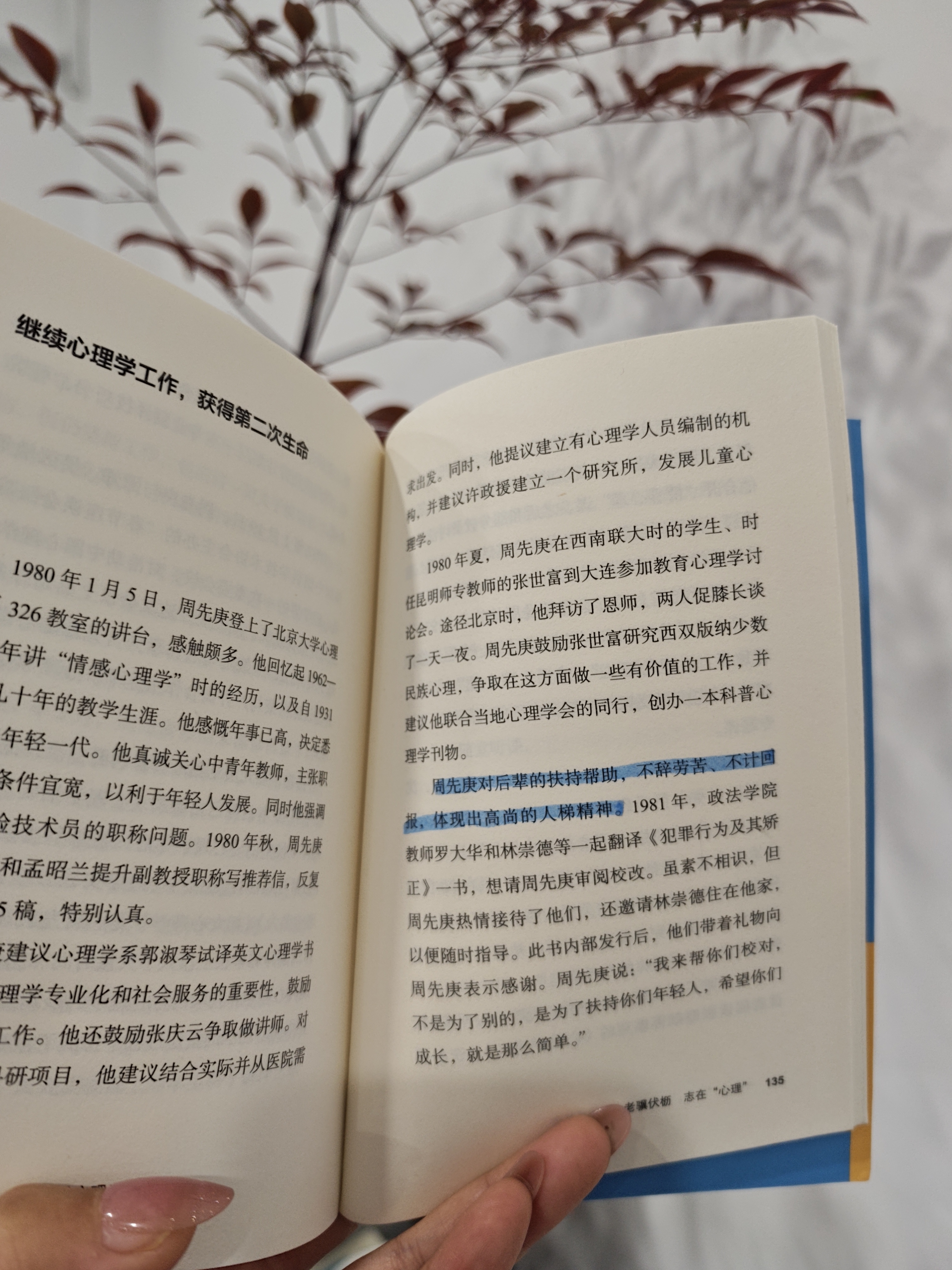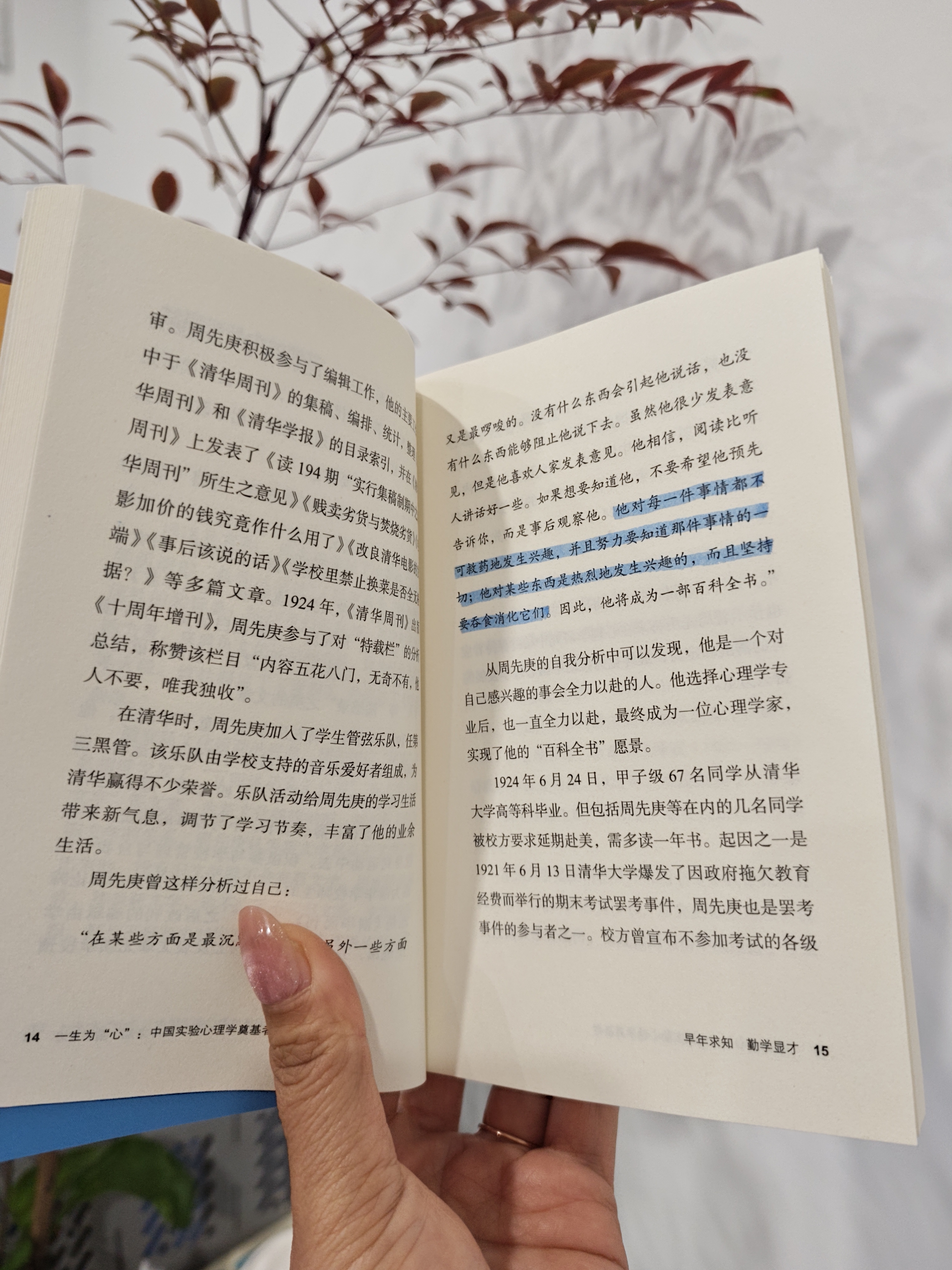 成长也是一种美好 最近一年陆陆续续读了一些心理学倾向的书籍和心灵鸡汤不同,有几本不错的书都有很强的操作性。 但是回归到心理学这一学科上来还是知之甚少,特别是关于中国的心理学发展和心理学大师这一块则完全是一片空白。 偶然的情况下读到这本小书,一本聚焦中国实验心理学奠基者,我国现代著名心理学家周先庚先生的一生的书。 书里介绍了他的求学和任教经历,以及在这个过程中开创汉字心理学研究、发明实验装置、推动中国实验及应用心理学的奠基等贡献。 从先生的经历和成就中串联起中国心理学的发展史,展现了一代心理学大师们从传统文化中汲取营养、探索中国特色的心理学初心。 作为初次了解中国心理学发展的读者来说,全书语言平时流畅,非常好读,是很适合的心理学入门读物之一。 # 让我们一起成长 # 成长的力量 # 一生为心 # 周先庚# 新书推荐#春节读好书# #21天阅读打卡计划#