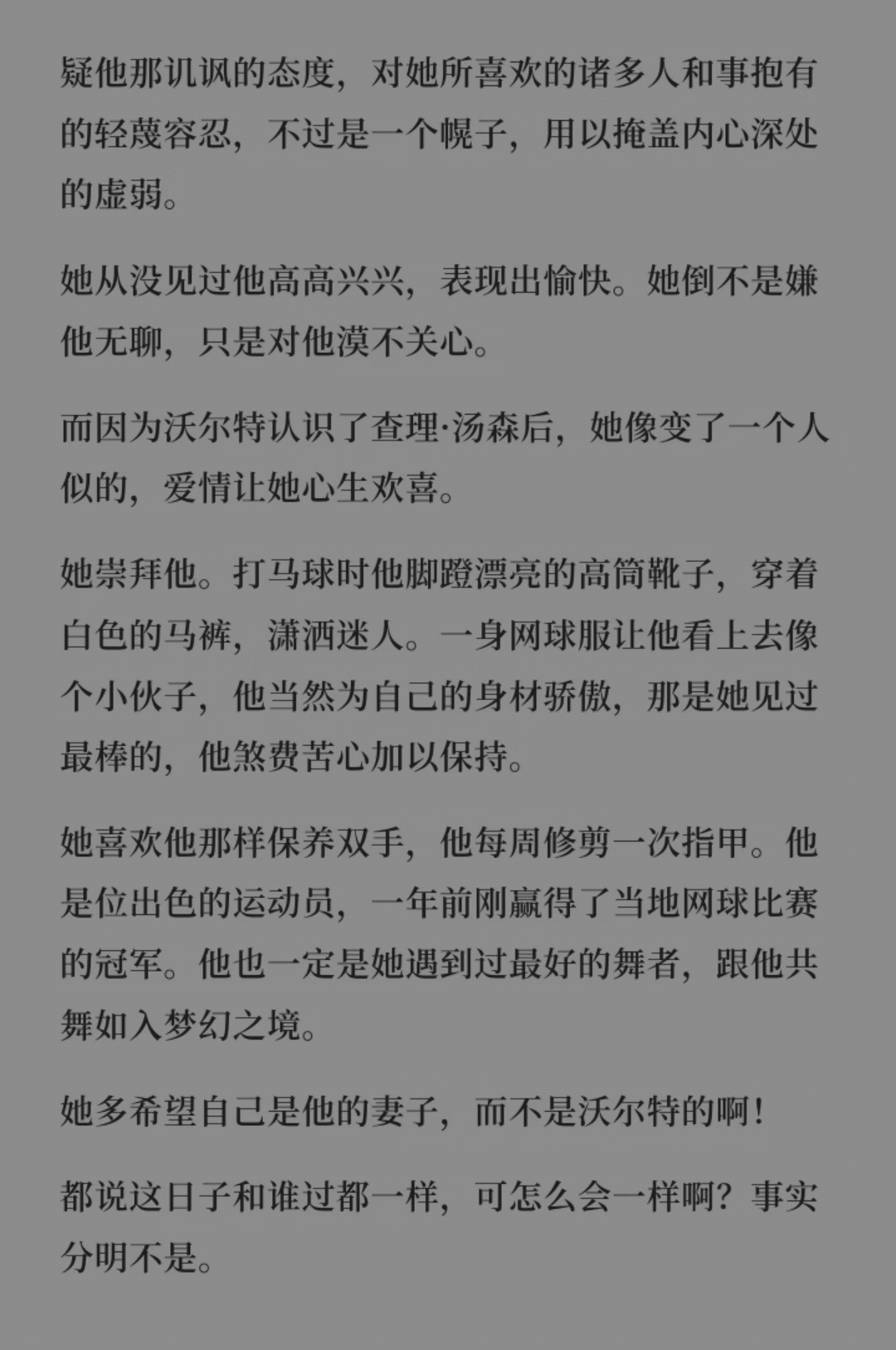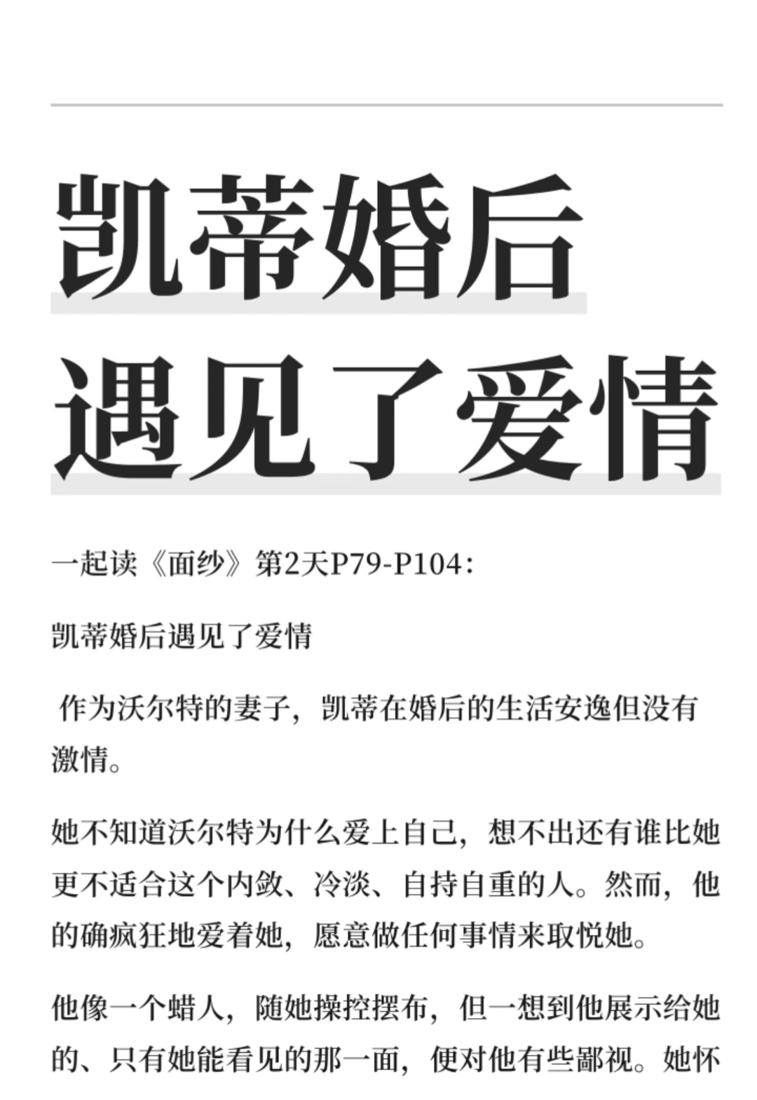文学经典 | 《面纱》(二) 一起读《面纱》第2天第79-104页: 凯蒂婚后遇见了爱情 凯蒂婚后对生活感到安逸但缺乏激情,对丈夫沃尔特的爱感到困惑,对他的冷漠和轻蔑感到鄙视。 她对查理·汤森的崇拜让她对爱情充满渴望,并渴望成为查理的伴侣,而非沃尔特的妻子。