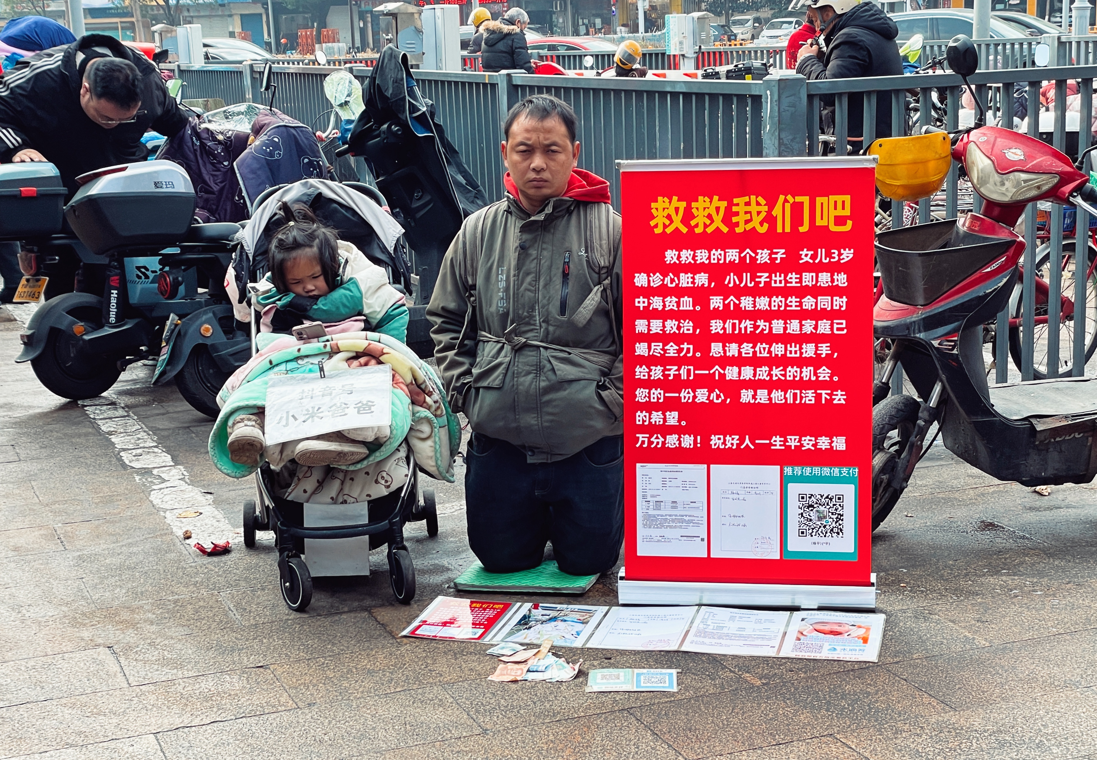 《各有难也各有盼,平凡以待就好。》在人间烟火里讨生活,晨的风裹着冷意掠过城市的街面,卖早点的铺子已经蒸腾起白雾,电动车的嗡鸣和行人的脚步声织成了市井的背景音。就在街角的护栏旁,一个男人跪在绿色的垫子上,面前的红色展板上,“救救我们吧”五个黄字像烧在灰色的寒风里。他身旁的童车里,裹得严严实实的孩子眯看小眼盯手机里的动画片,小脸上泛着一层薄红,全然不知父亲正以最卑微的姿态,向来往的陌生人叩求生机。 不远处的早点摊前,穿羽绒服的女人正踮脚接过刚炸好的油条,热油在铁锅里滋滋作响,她笑着跟老板说“浆饭來二团”,转身就把热烫豆浆塞进孩子的书包。街对面的修车师傅蹲在地上,粗糙的手指捏着扳手拧着螺丝,油污嵌进指甲缝里,他却只是偶尔抬头,用袖子抹一把冻红的鼻子。每个人都在自己的方寸里,忙着把日子往前推。 有人步履匆匆,盯着手机屏幕里的工作消息,衣角扫过地上散落的病历单;有人驻足片刻,摸出零钱轻轻放在男人脚边,又快步汇入人流。没人有太多时间停留,生活的齿轮转得太快,每个人都驮着自己的重量。展板上的二维码亮着冷光,和旁边煎饼摊的炉火形成奇异的对照,一边是生存的呼救,一边是烟火的升腾。 卖烤红薯的大爷推着小车走过,焦香的热气混着寒风漫开,他吆喝着“刚烤的,甜得很”,手里的铁钳翻动着炉子里的红薯。不远处的公交站台,戴耳机的年轻人随着音乐轻轻点头,等车的间隙刷着短视频,屏幕的光映在他冻得发红的脸上。这就是街头的寻常,有人在苦难里挣扎,有人在琐碎里安稳,有人在奔赴里期待,所有的悲欢都摊在光天化日之下,没有遮掩,也无需回避。 男人依旧跪着,脊背挺得笔直,像一株在寒风里不肯弯折的野草。婴儿车里的孩子翻了个身,发出细碎的梦呓。阳光穿过云层,在地面投下斑驳的影子,照亮了展板上“好人一生平安”的字样。生活从不会因为谁的艰难就停下脚步,却总会在某个瞬间,让你看见陌生人递来的温暖。就像此刻,有人悄悄放下的零钱,有人匆匆投来的目光,都是烟火里最动人的慰藉。我们都在这人间烟火里讨生活,各有各的风霜,也各有各的光亮。