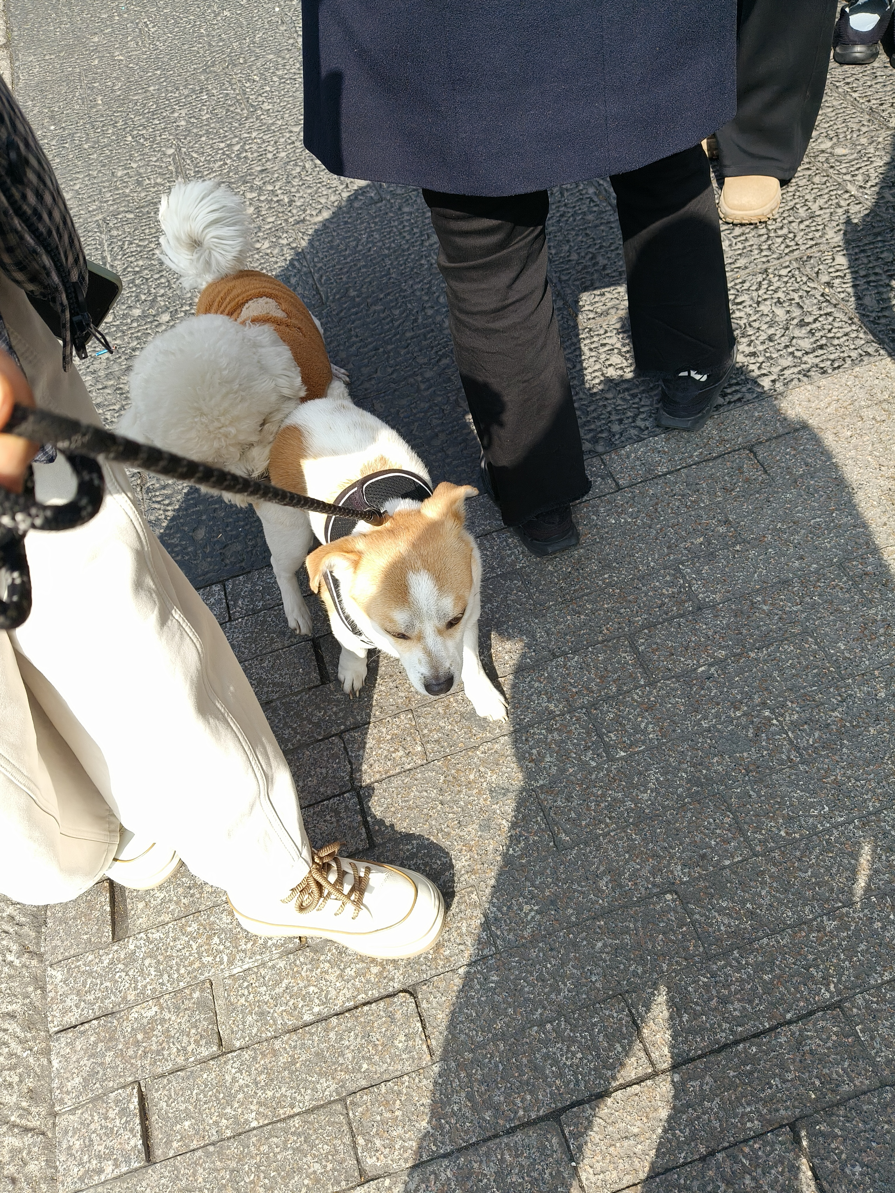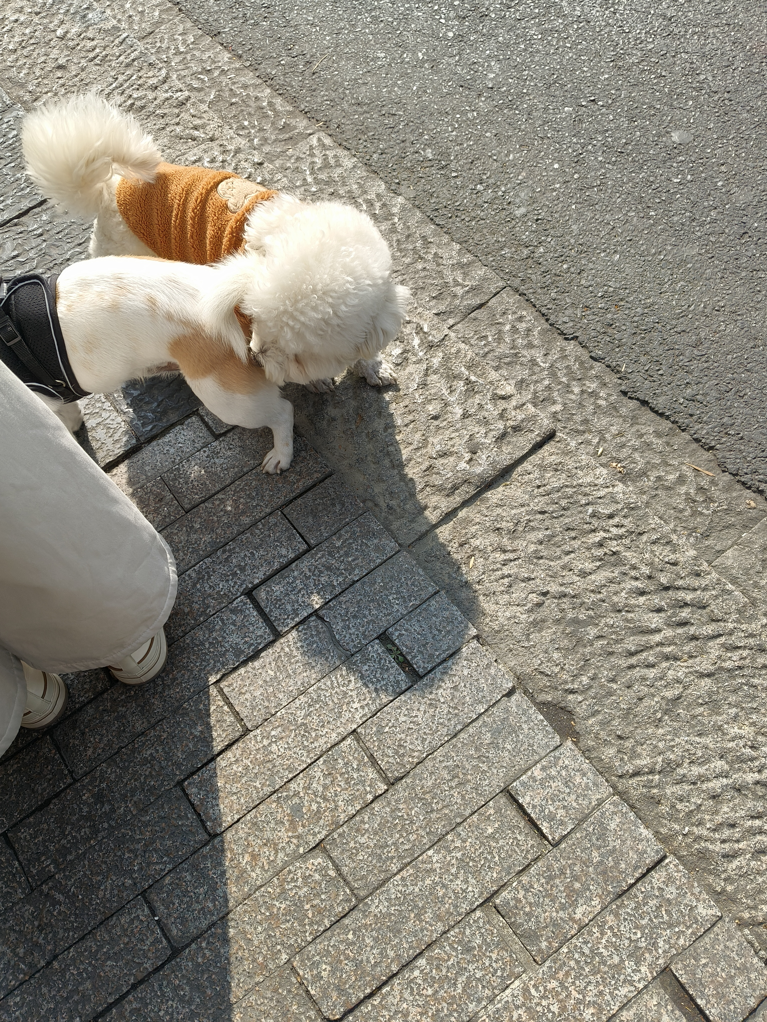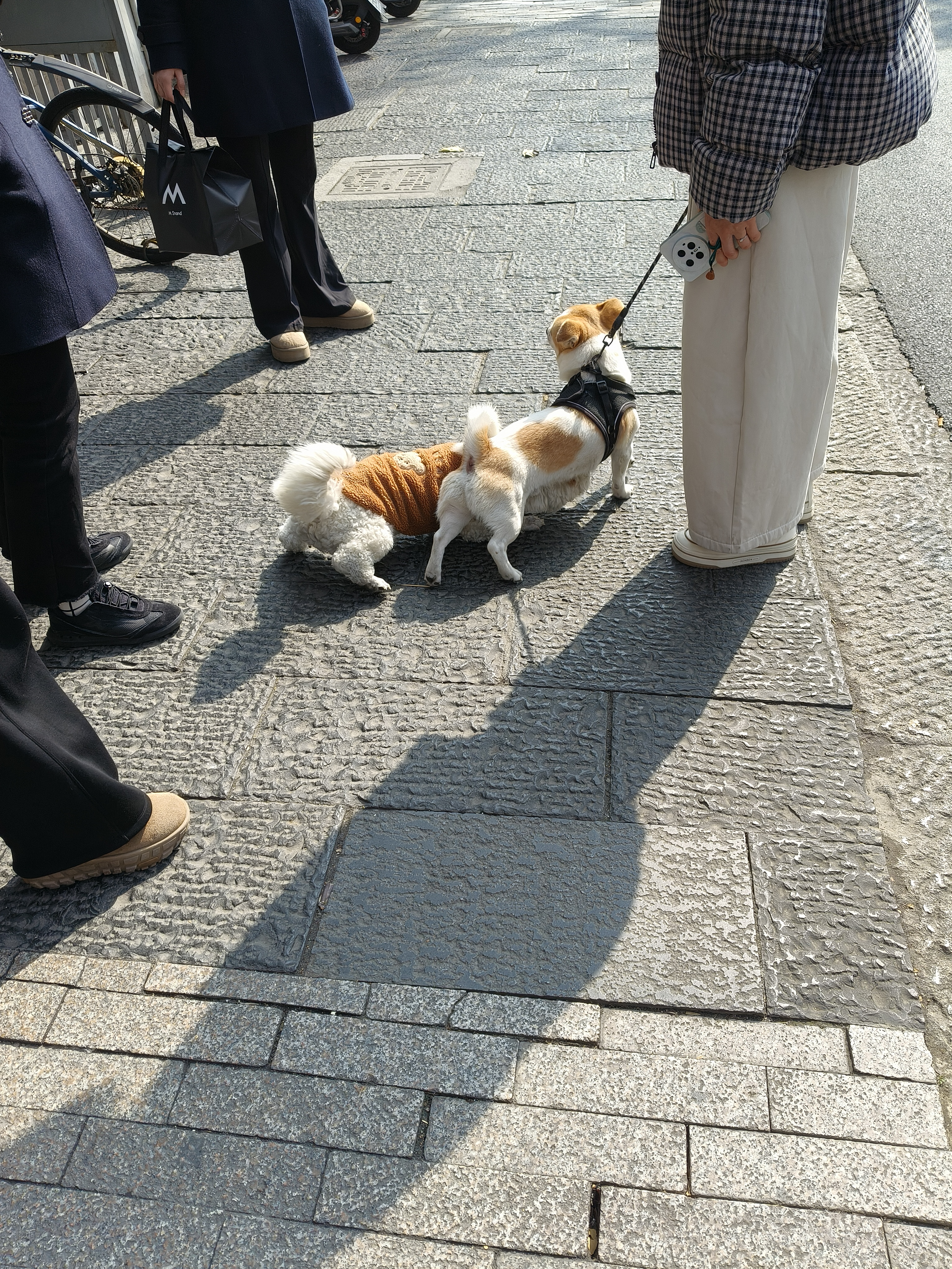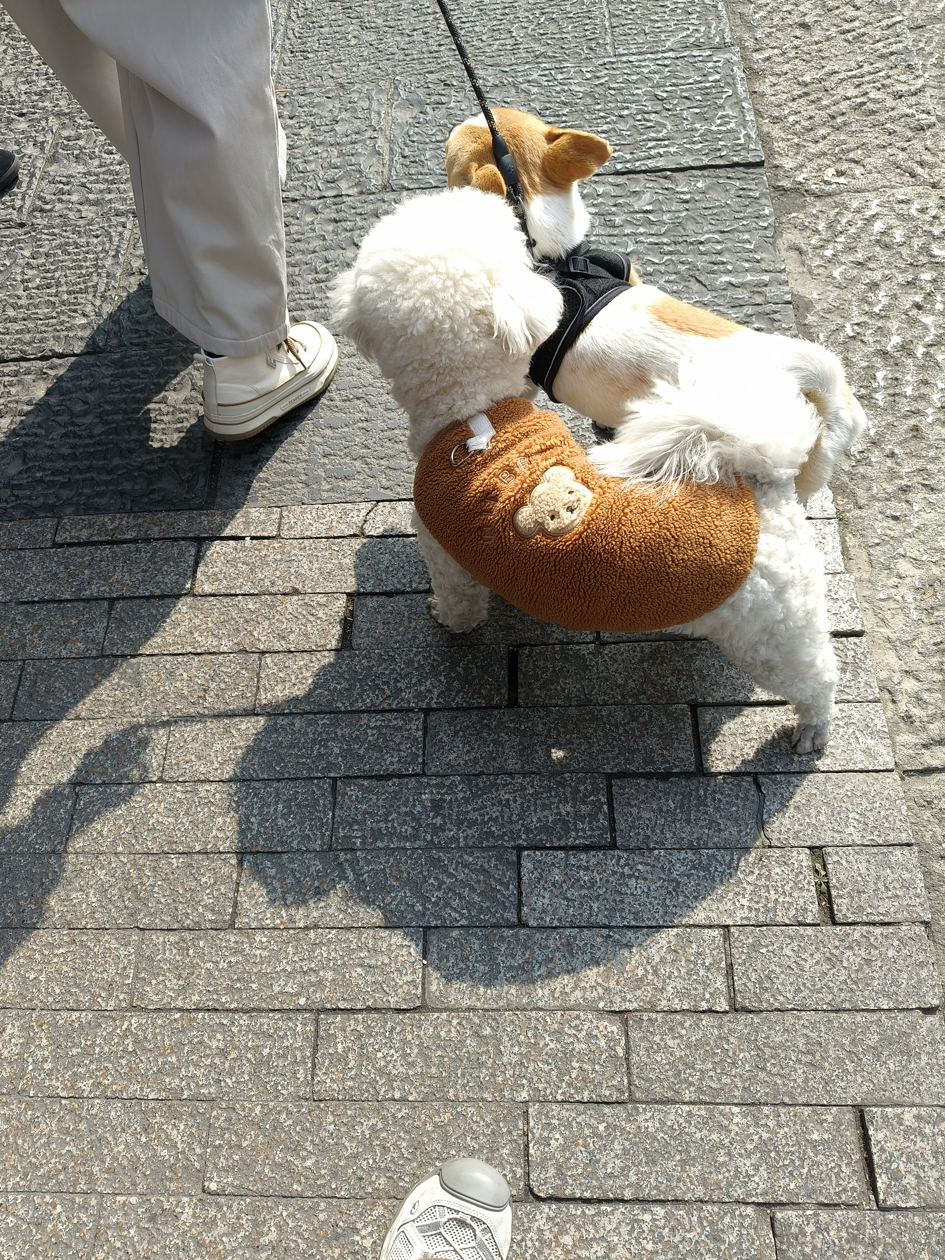 看见一个沾花惹草的狗,另外一个被它吓得不知所措。