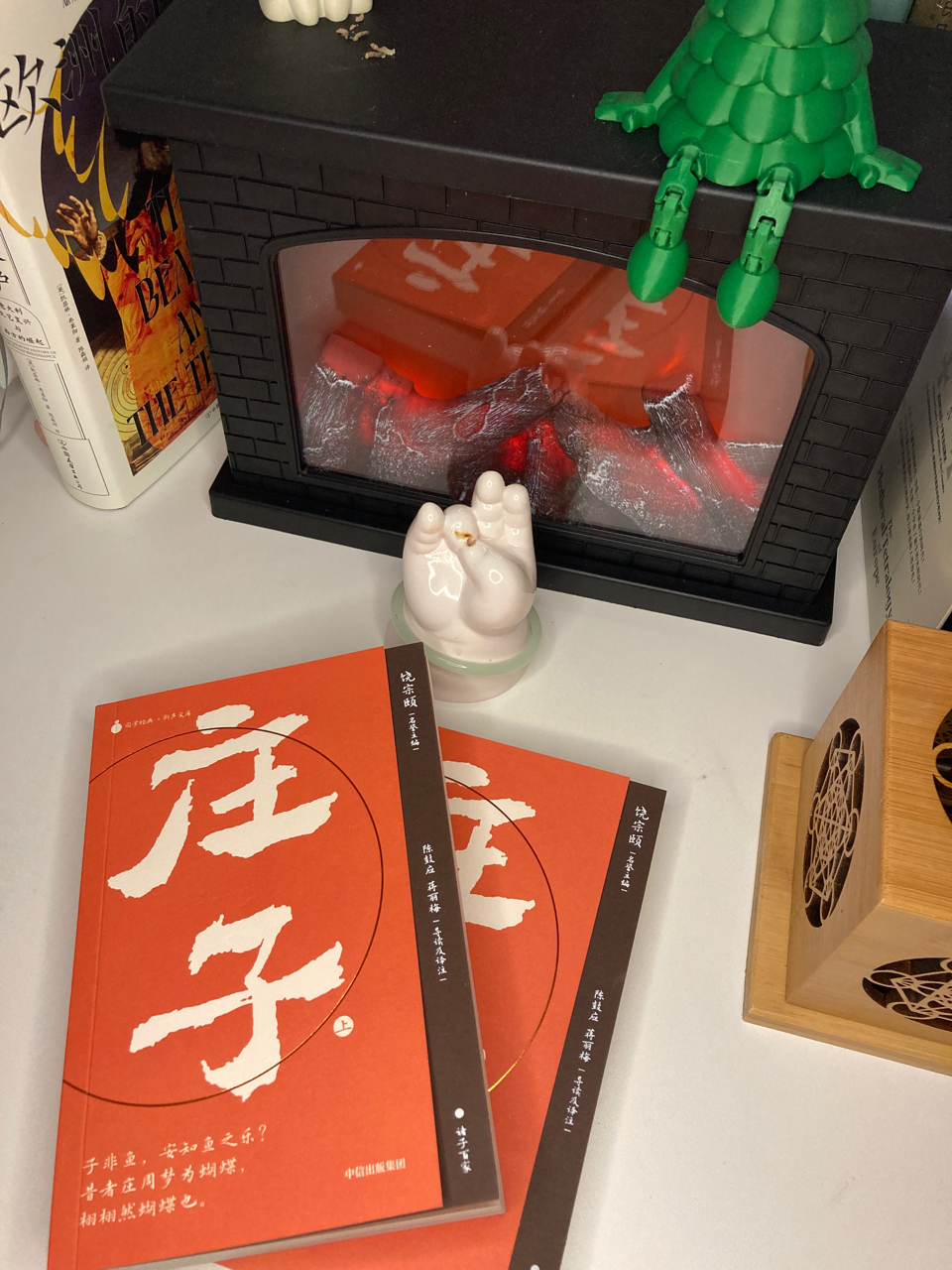 最近入手了一套口袋本《庄子》,庄子的蝴蝶梦在电壁炉暖光里翩跹;白佛手静立,绿龟憨卧,红封面如心火微燃。道家哲思与木香氤氲,在这方寸书桌间,我读着陈鼓应与蒋丽梅的手读译注——子非鱼,安知此刻的宁静,不是最深之幸?