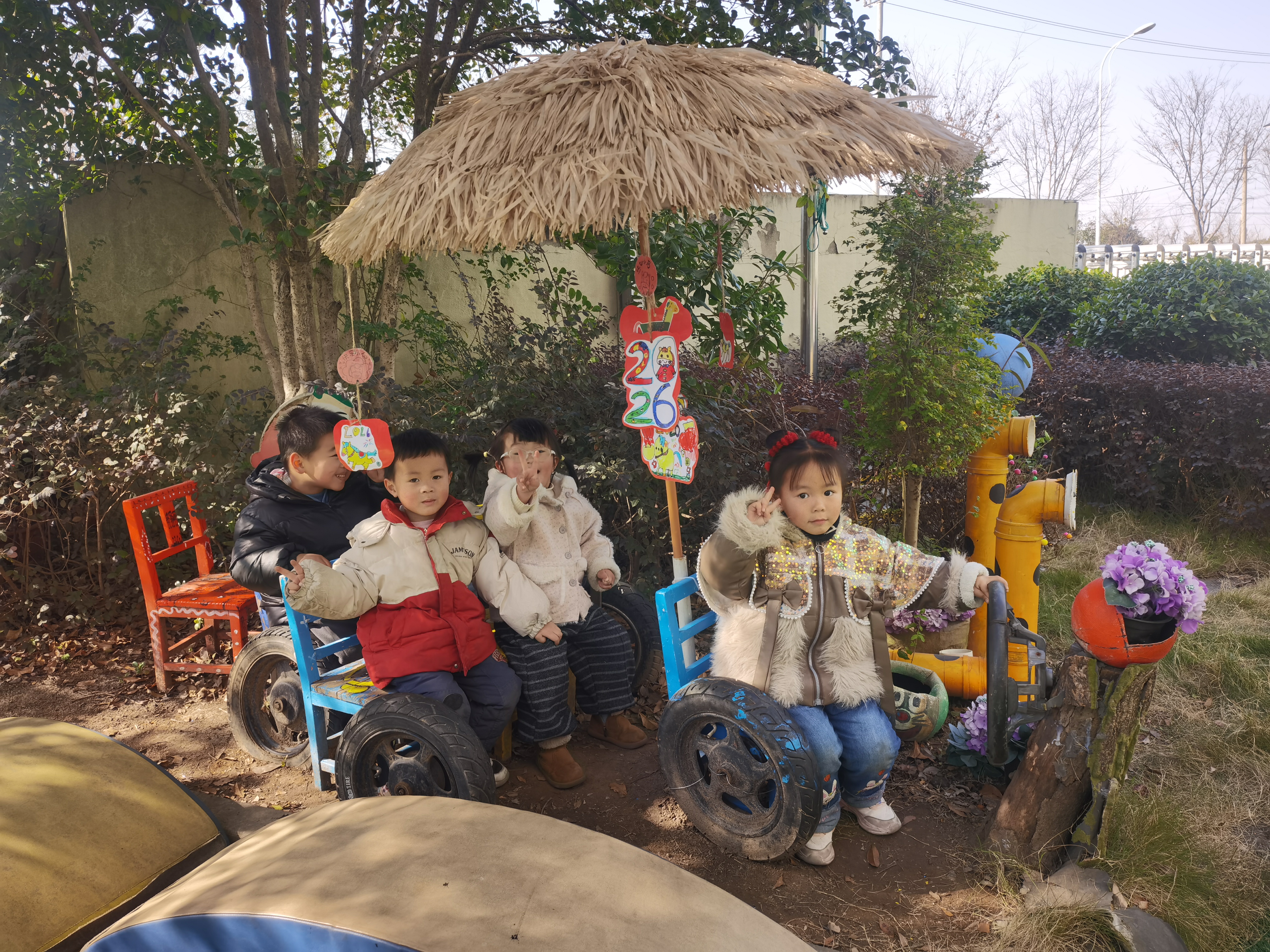 童趣小院里的欢乐时光 近日,马鞍滨海幼儿园的孩子们在充满野趣的户外小院里,开启了一场欢乐的午后时光。他们围坐在轮胎改造的创意座椅上,在草编伞下嬉笑玩耍。身边的“2026”装饰洋溢着新年气息,孩子们在自然与童趣交织的空间里,留下了满满的快乐回忆。