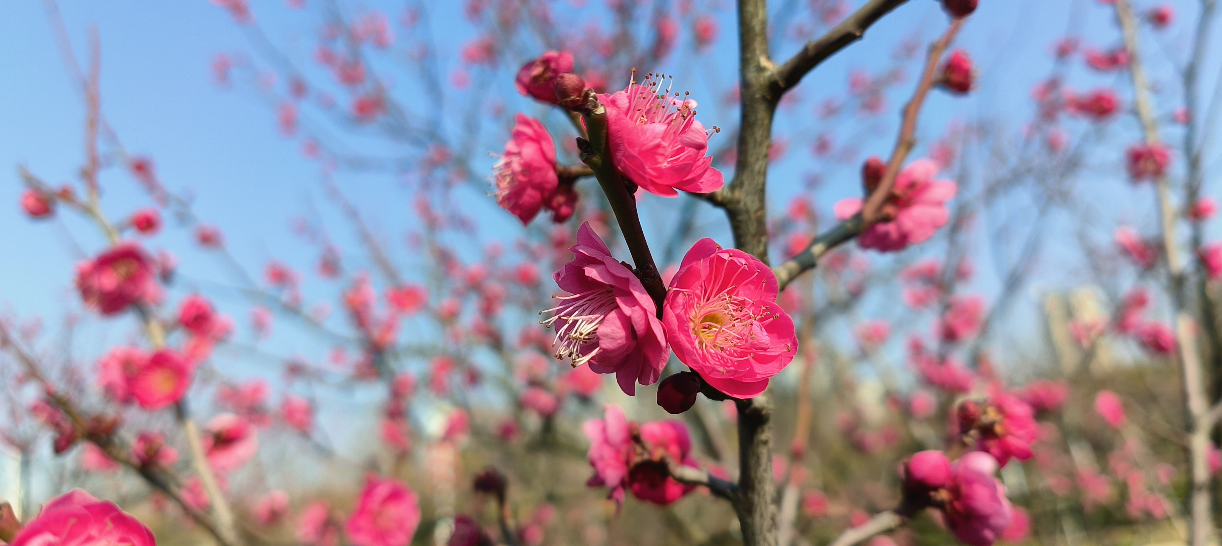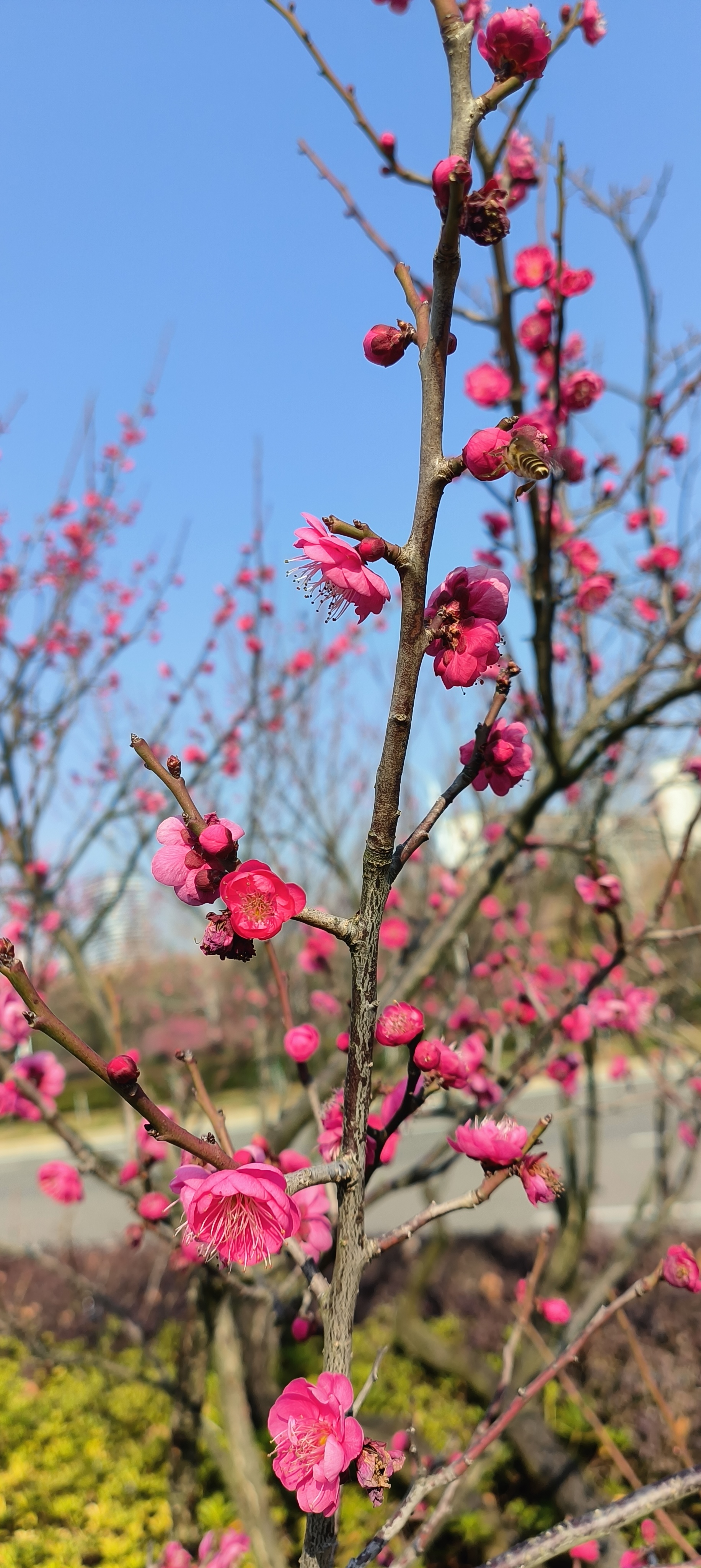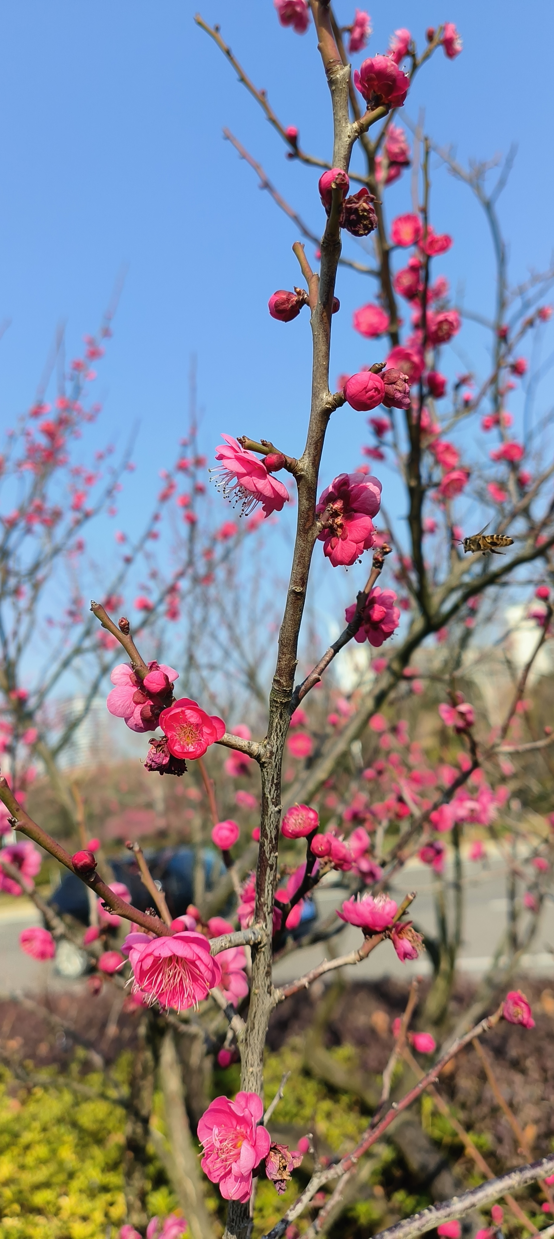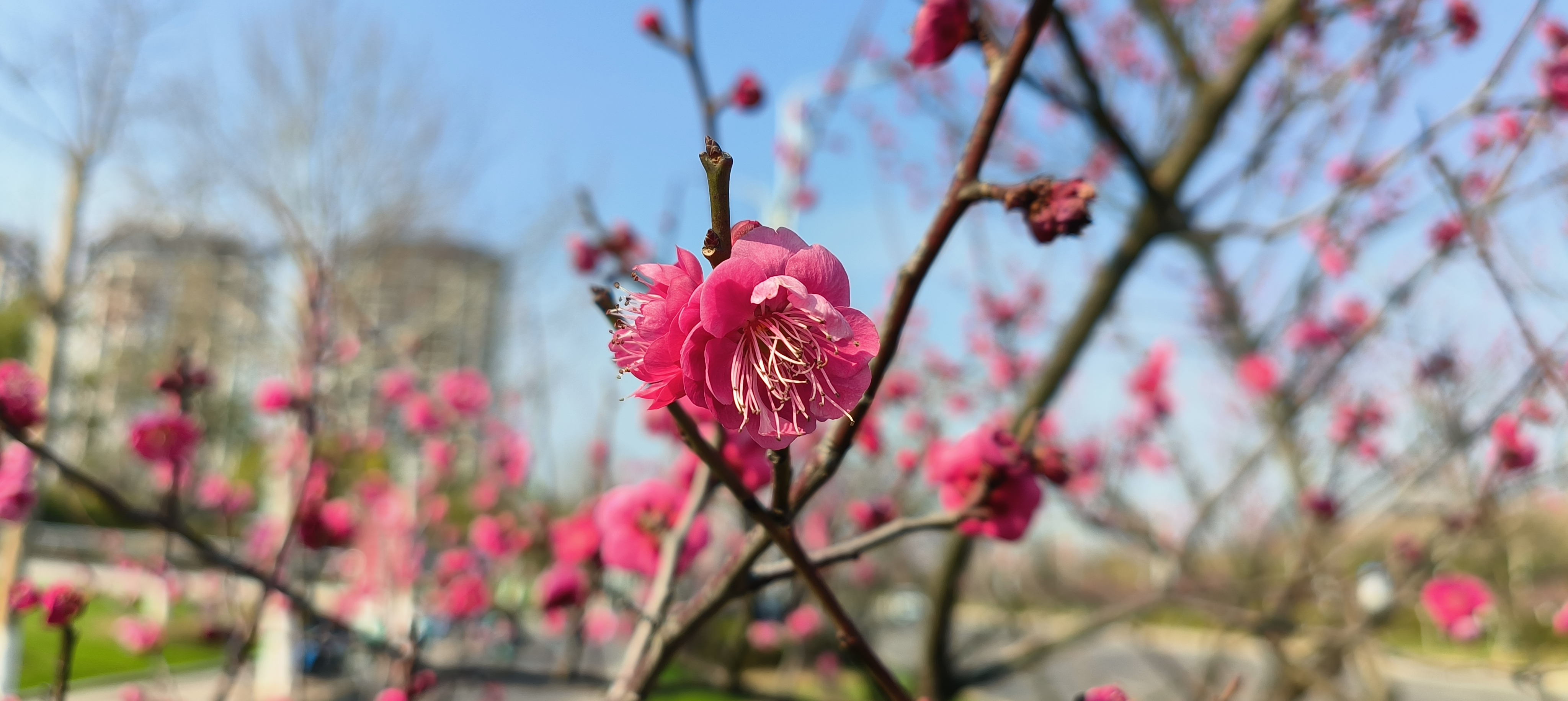 立春日至,寒尽春归。2026年2月4日,江西省抚州市三翁花园东门口,玉茗大道两旁枝头梅花傲然绽放,嫣红点点,为寒冬画上圆满句点。道路两旁梅香沁脾,生机盎然。市民踏春赏梅,共赴这场春日之约,处处皆是新春盛景,行人陶醉其中,给城市增添了一道美丽景色。
