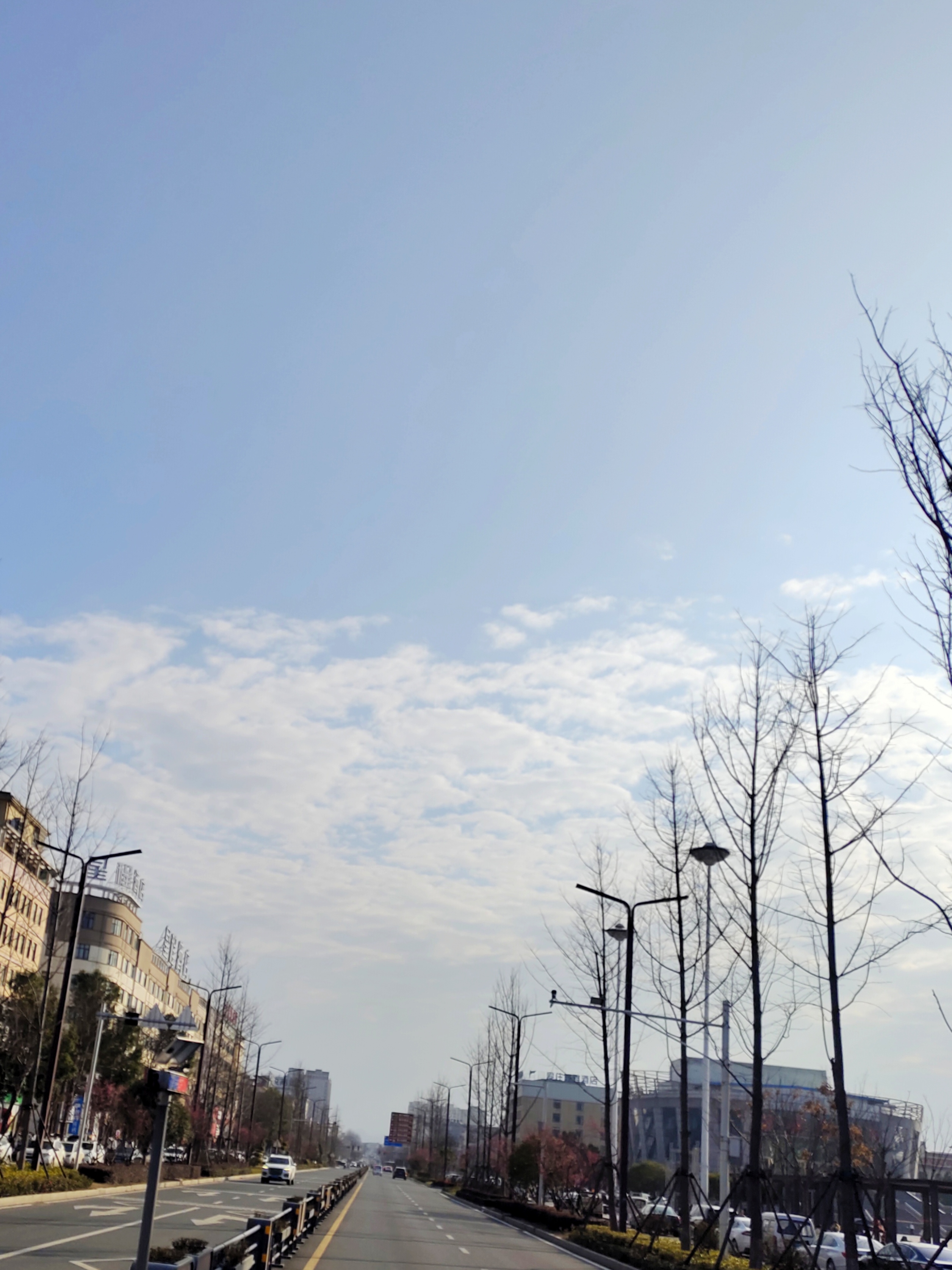 冬日街角,蓝天下光秃枝桠轻触云影,车流与楼宇在静默中呼吸——城市,正以最素净的笔触写诗。