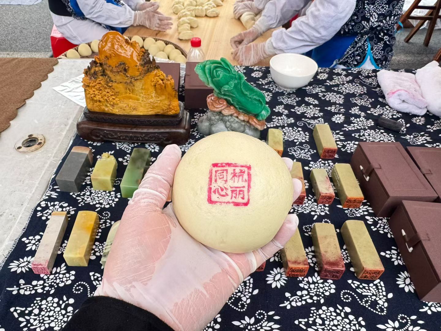浙BA球场外,印着青田石雕印章的缙云南乡馒头摊位前,市民也排起了长队。一方石印加上传统美食,跃升为炙手可热的赛事“潮流纪念品”。
