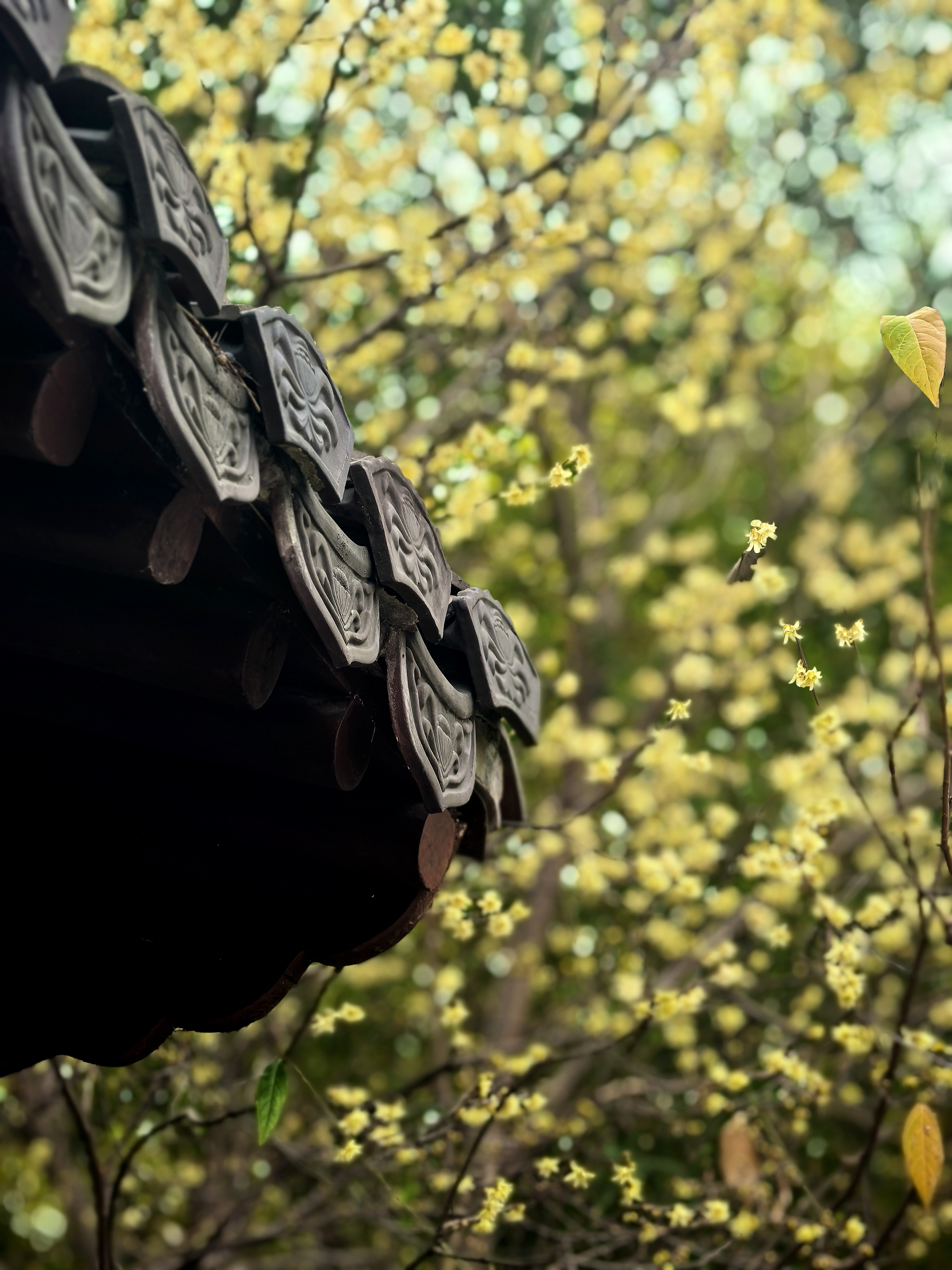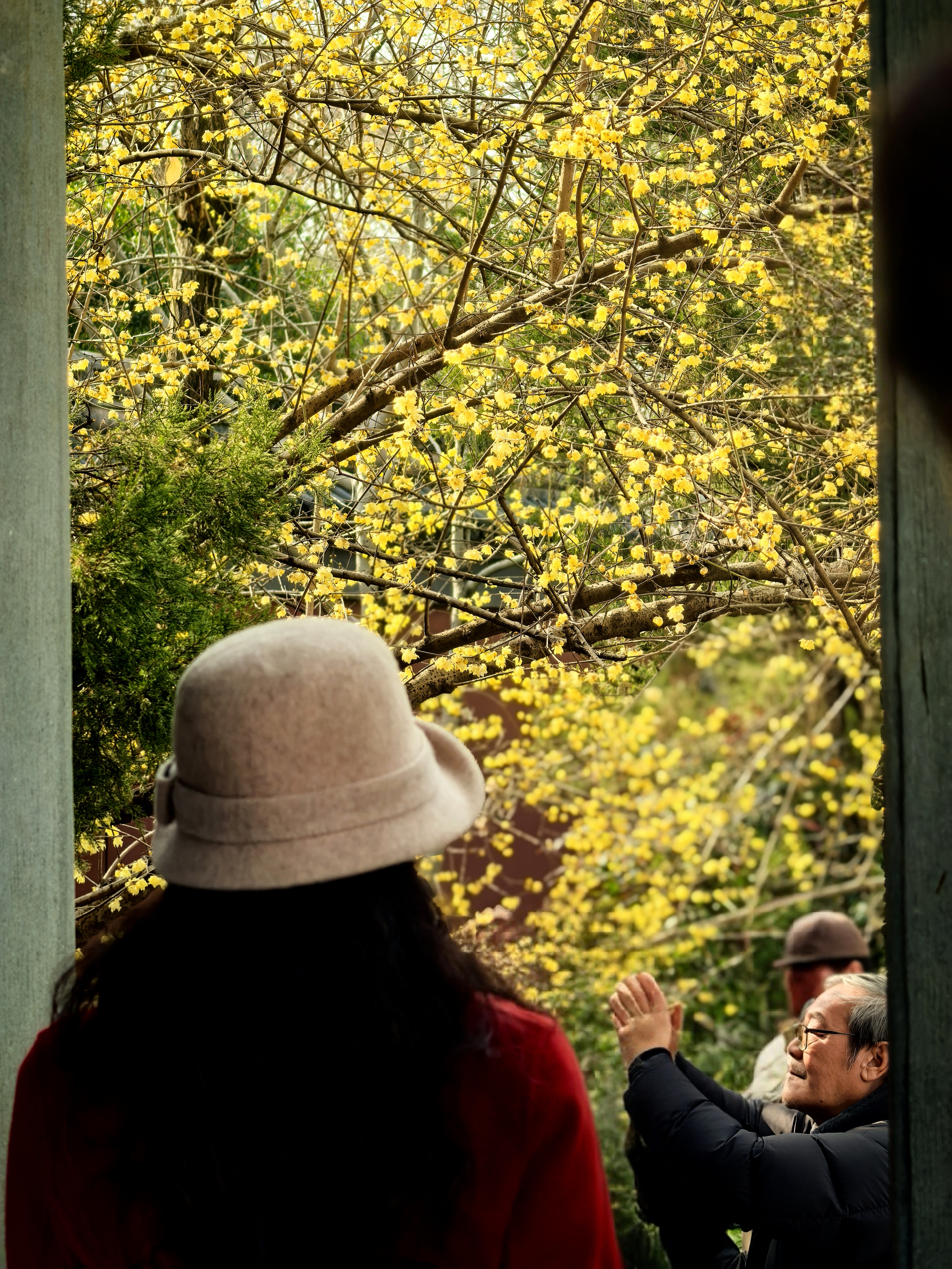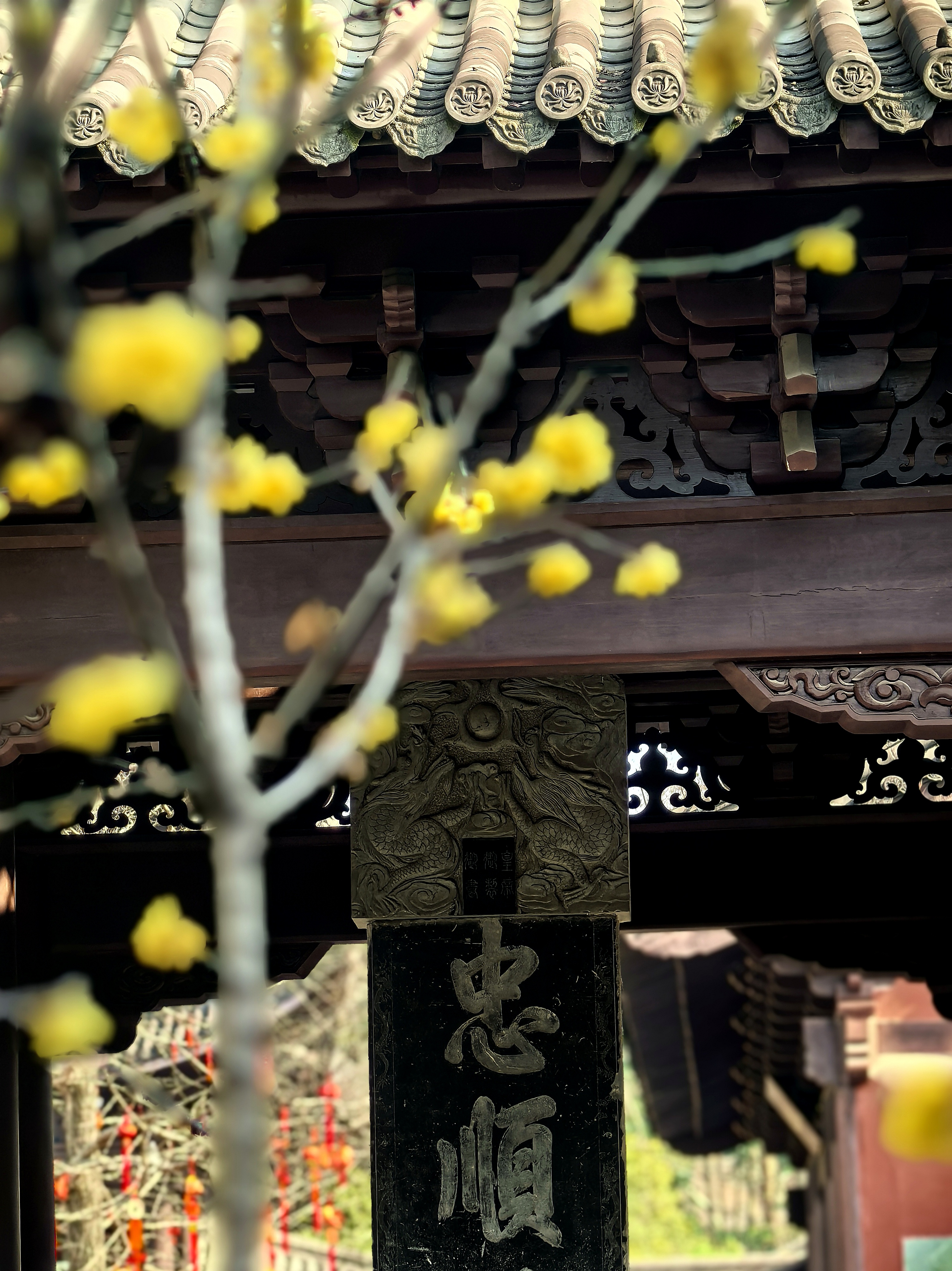 已是连续追钱王祠这株网红蜡梅好多年了。本想今年就歇歇算了吧,可是路过时脚步偏又让那缕浮动的幽香牵引了进去。 我是带着来看故友的心情来赏花的,老枝还是从红墙边斜逸而出,金黄仍是蜜蜡般缀满疏影。我努力寻找着去年不同的视角体验。树下仰面举镜的人,换了一批又一批面孔与衣衫。他们才是蜡梅树边流动不歇的鲜活风景呀! 小小一株蜡梅花,提供了全城朋友圈摄影大赛的场景,你不得不说,这株蜡梅的魅力!记得前年我曾在潮新闻上发过“孤篇压群芳”的散文(https://gxlmmz.8531.cn/endpoint/short/aLPi7s),写的就是这株蜡梅花! 转到婆留井旁,回头但见另一株蜡梅与黛瓦紧密交融;出来时碑亭西侧厢房前,更有一株看起来不咋滴的青少年蜡梅树,与东面碑亭下的刻石辉映在视线里,心里不觉大喜:梅还是那些梅,变的原是赏梅的眼缘。就像人与人,有些尺咫天涯,有些一见钟情。杭城赏梅之四钱王祠蜡梅。