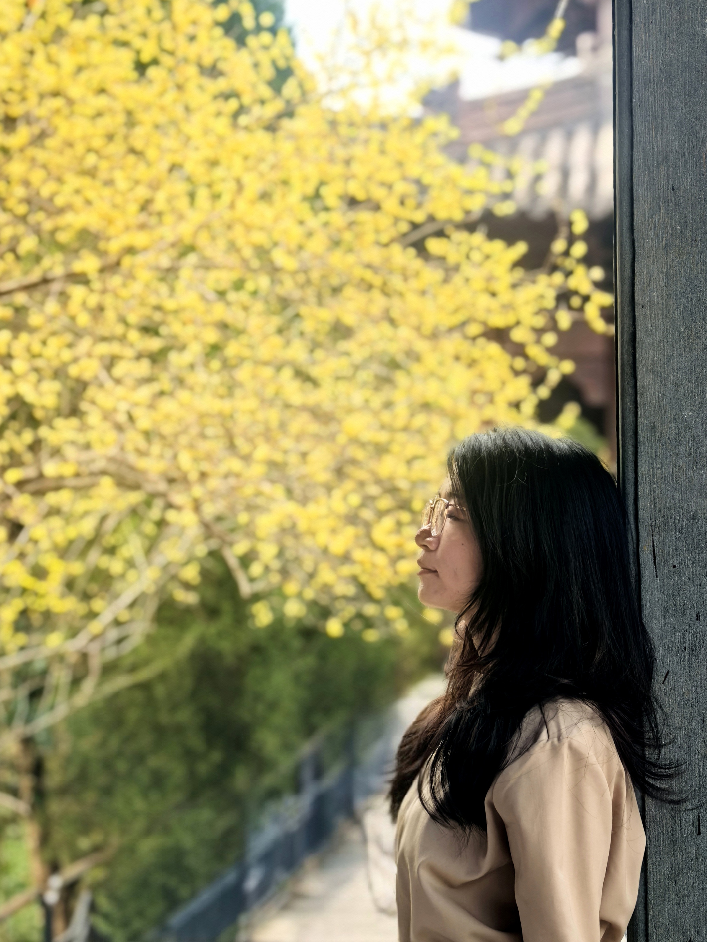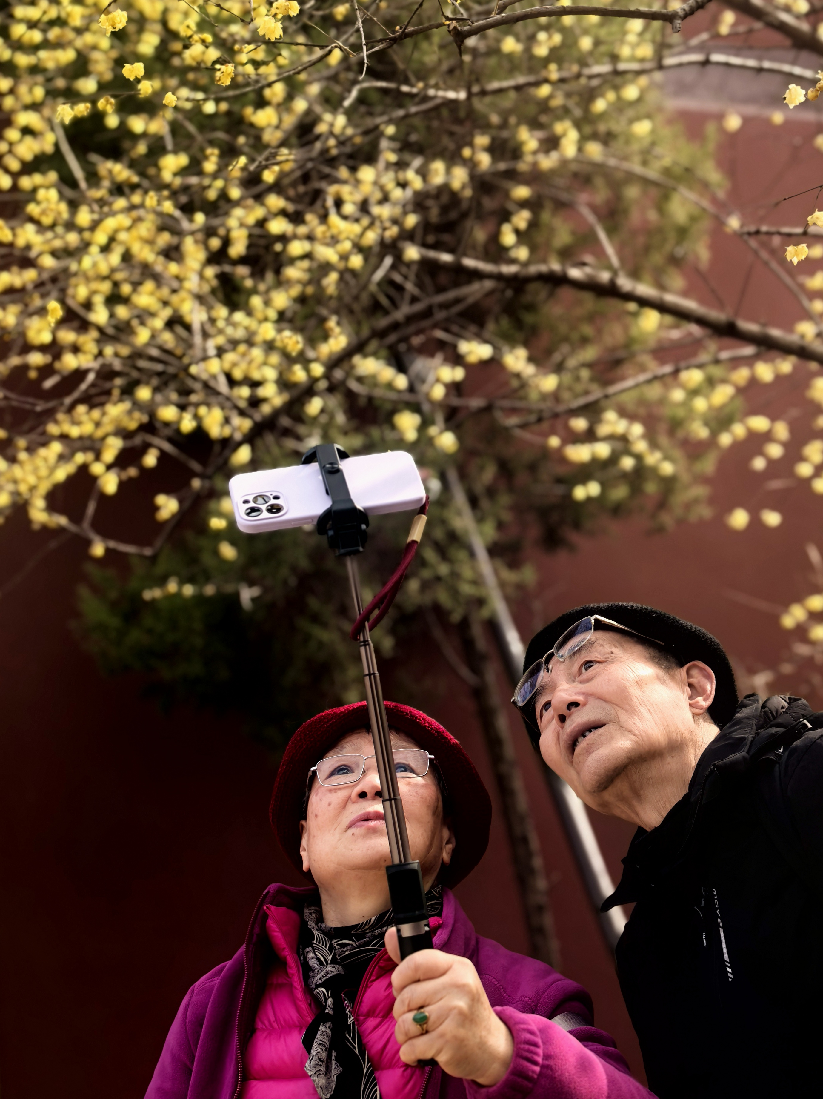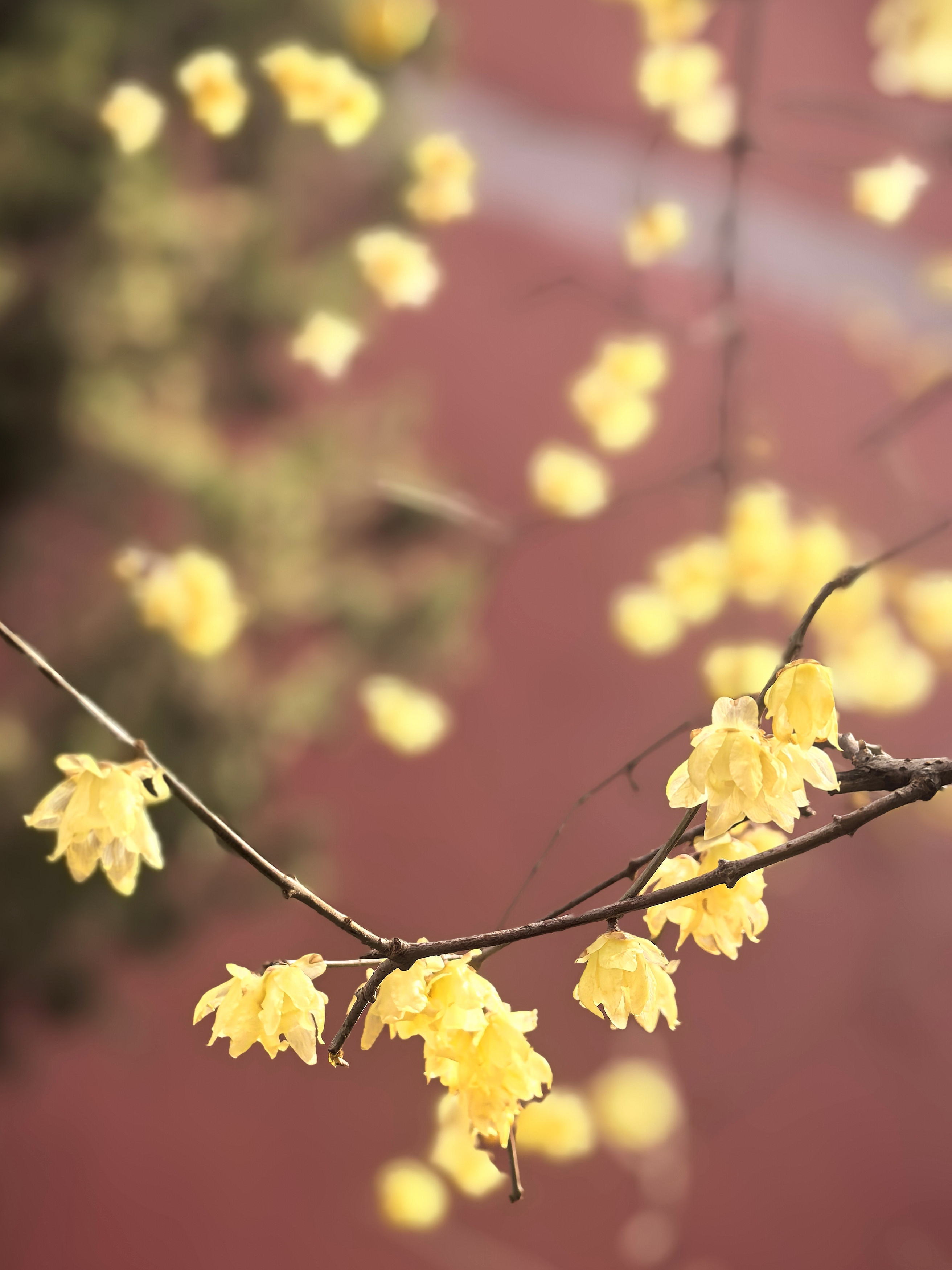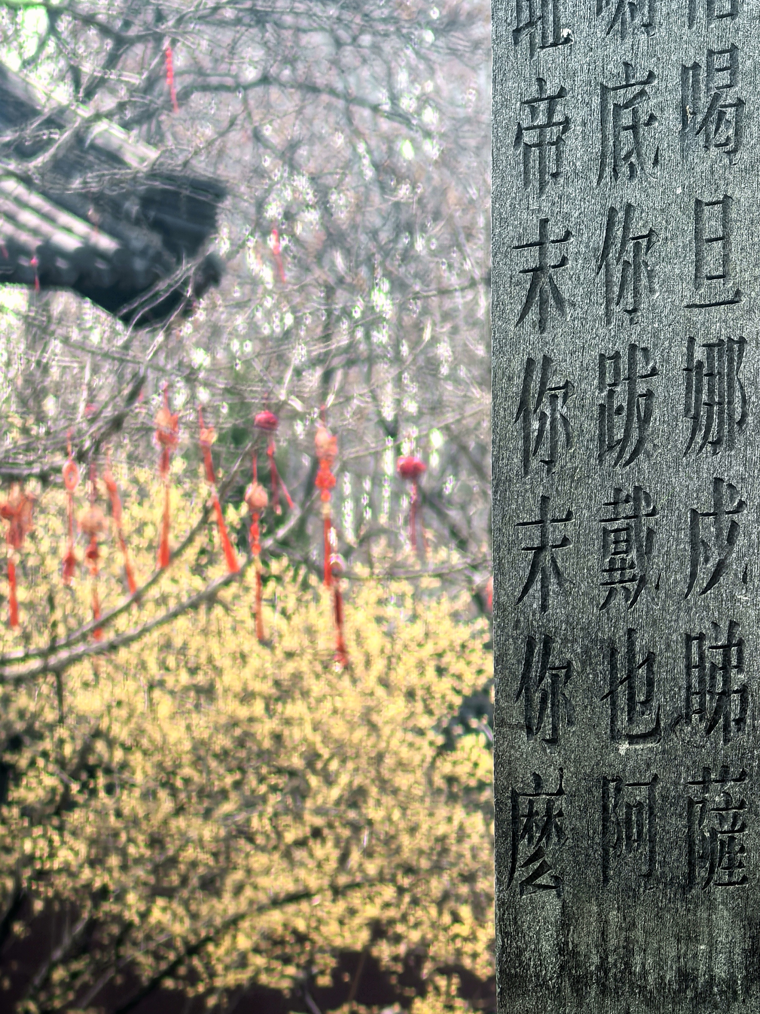 已是连续追钱王祠这株网红蜡梅好多年了。本想今年就歇歇算了吧,可是路过时脚步偏又让那缕浮动的幽香牵引了进去。 我是带着来看故友的心情来赏花的,老枝还是从红墙边斜逸而出,金黄仍是蜜蜡般缀满疏影。我努力寻找着去年不同的视角体验。树下仰面举镜的人,换了一批又一批面孔与衣衫。他们才是蜡梅树边流动不歇的鲜活风景呀! 小小一株蜡梅花,提供了全城朋友圈摄影大赛的场景,你不得不说,这株蜡梅的魅力!记得前年我曾在潮新闻上发过“孤篇压群芳”的散文(https://gxlmmz.8531.cn/endpoint/short/aLPi7s),写的就是这株蜡梅花! 转到婆留井旁,回头但见另一株蜡梅与黛瓦紧密交融;出来时碑亭西侧厢房前,更有一株看起来不咋滴的青少年蜡梅树,与东面碑亭下的刻石辉映在视线里,心里不觉大喜:梅还是那些梅,变的原是赏梅的眼缘。就像人与人,有些尺咫天涯,有些一见钟情。杭城赏梅之四钱王祠蜡梅。