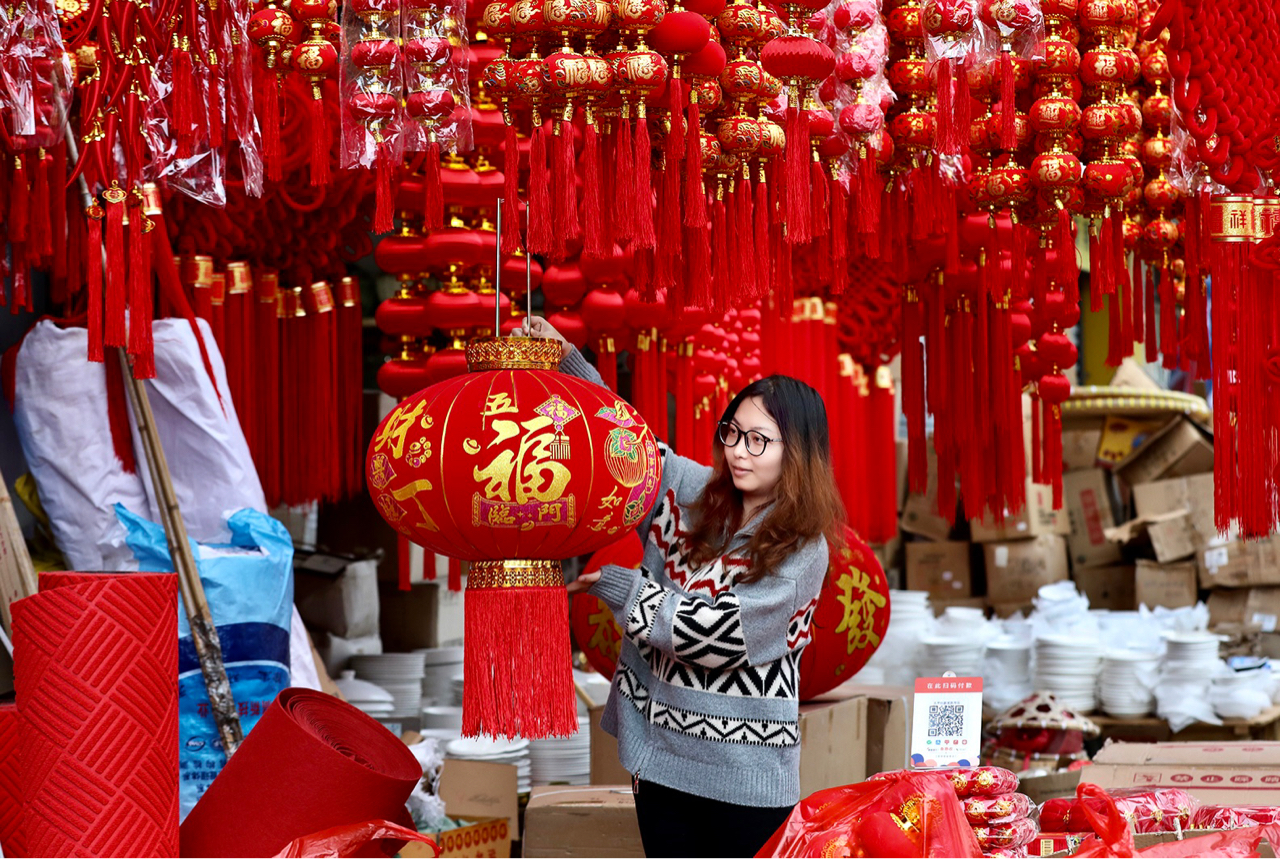 红灯笼轻摇,福字映笑颜;她指尖抚过流苏,年味在毛衣褶皱里悄然弥漫。