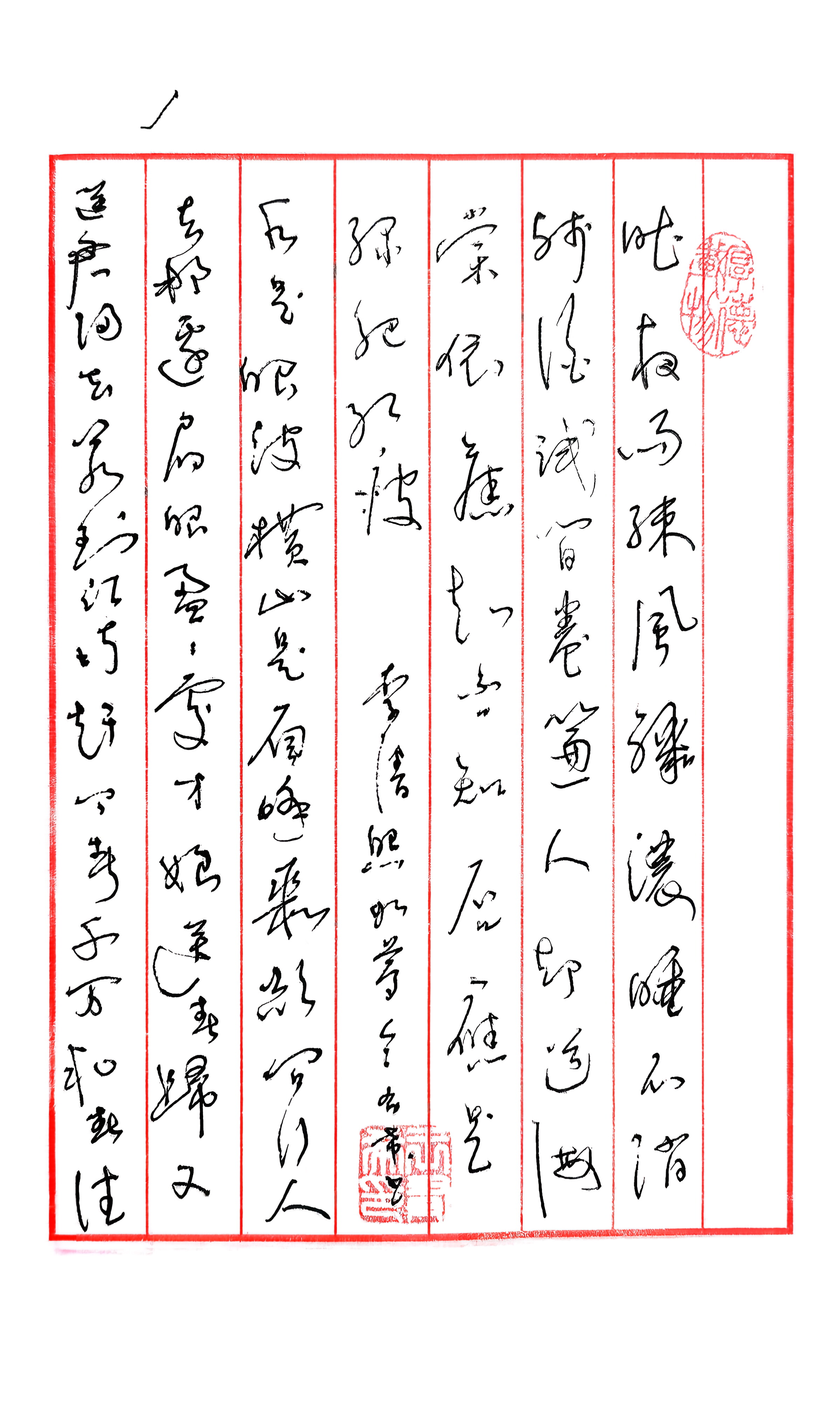 本人书法作品赏析 这是一幅以李清照《如梦令·昨夜雨疏风骤》与王观《卜算子·送鲍浩然之浙东》为内容的硬笔草书作品,整体风格婉约灵动,兼具艺术性与文学性。 ✨ 亮点分析 1. 笔法细腻灵动 行笔轻盈流畅,线条粗细变化自然,提按转折间尽显草书的飘逸感。“昨夜雨疏风骤”的连笔处理一气呵成,既保留字形辨识度,又传递出原词的婉约意境。 2. 章法错落有致 字间距与行间距疏密得当,整体布局错落而不杂乱。作品右侧起笔疏朗,中间渐趋紧凑,左侧收笔舒展,形成了张弛有度的视觉节奏。 3. 墨色层次丰富 通过行笔速度与力度的变化,墨色呈现浓淡干湿的层次。如“绿肥红瘦”四字墨色由浓转淡,与词中暮春的细腻情感相呼应。 4. 气韵连贯统一 整幅作品一气呵成,字与字、行与行之间呼应自然。从开篇到结尾,气韵始终流畅,完整传递出两首词的文学意境。