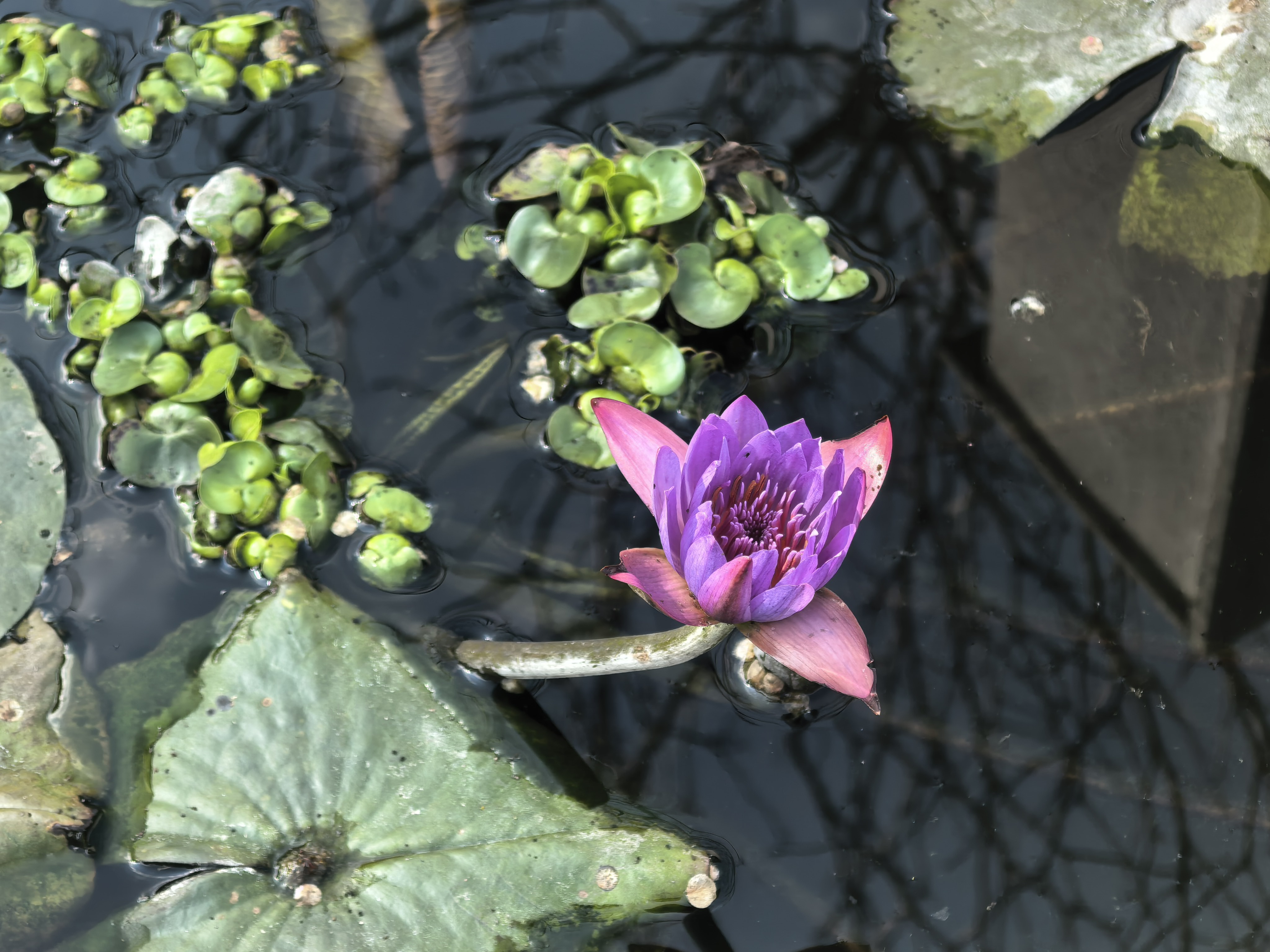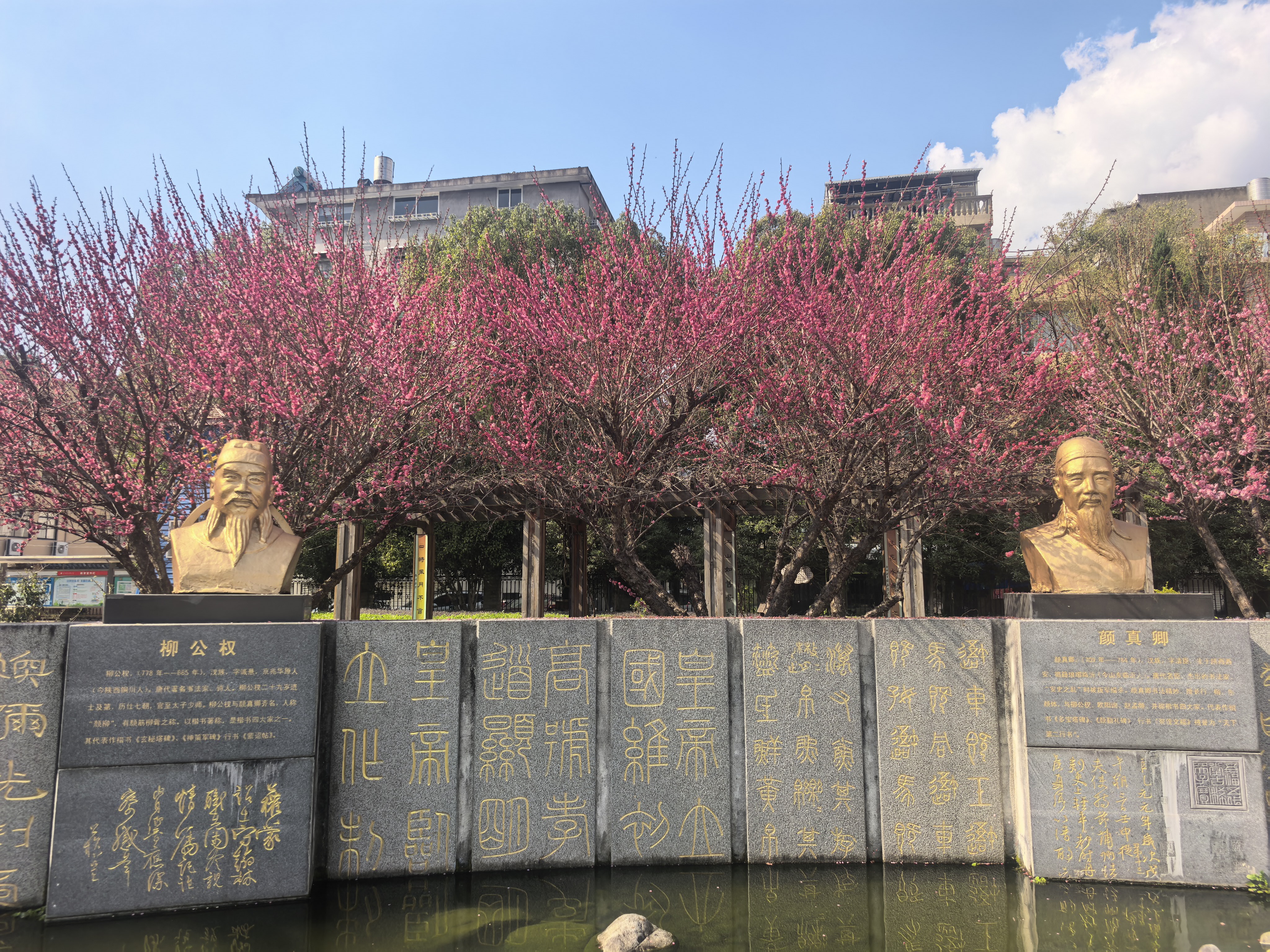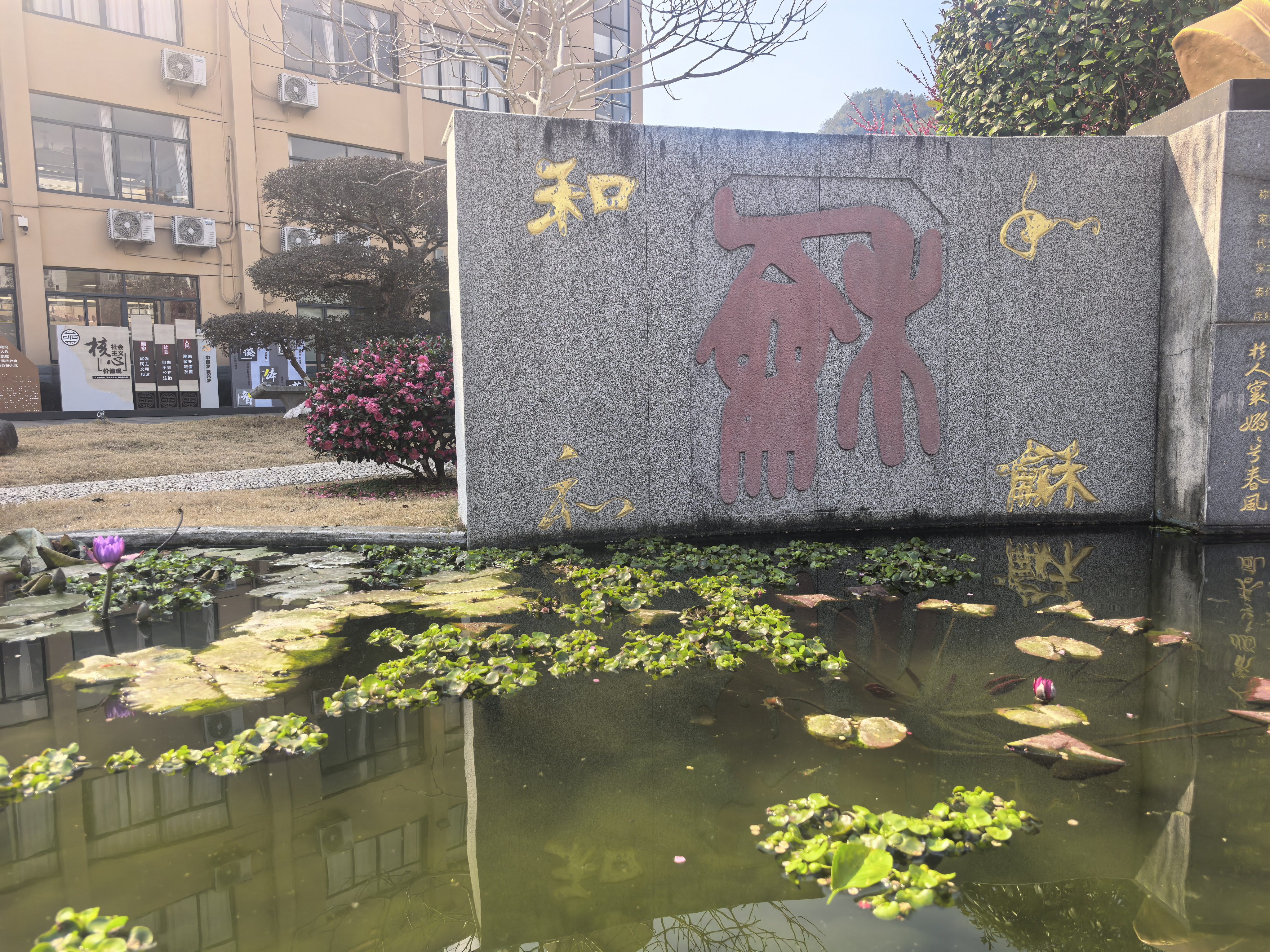 校园冬日漫步,梅花映池塘,睡莲浮紫光,石墙篆楷间,随手一拍都是江南园林风~