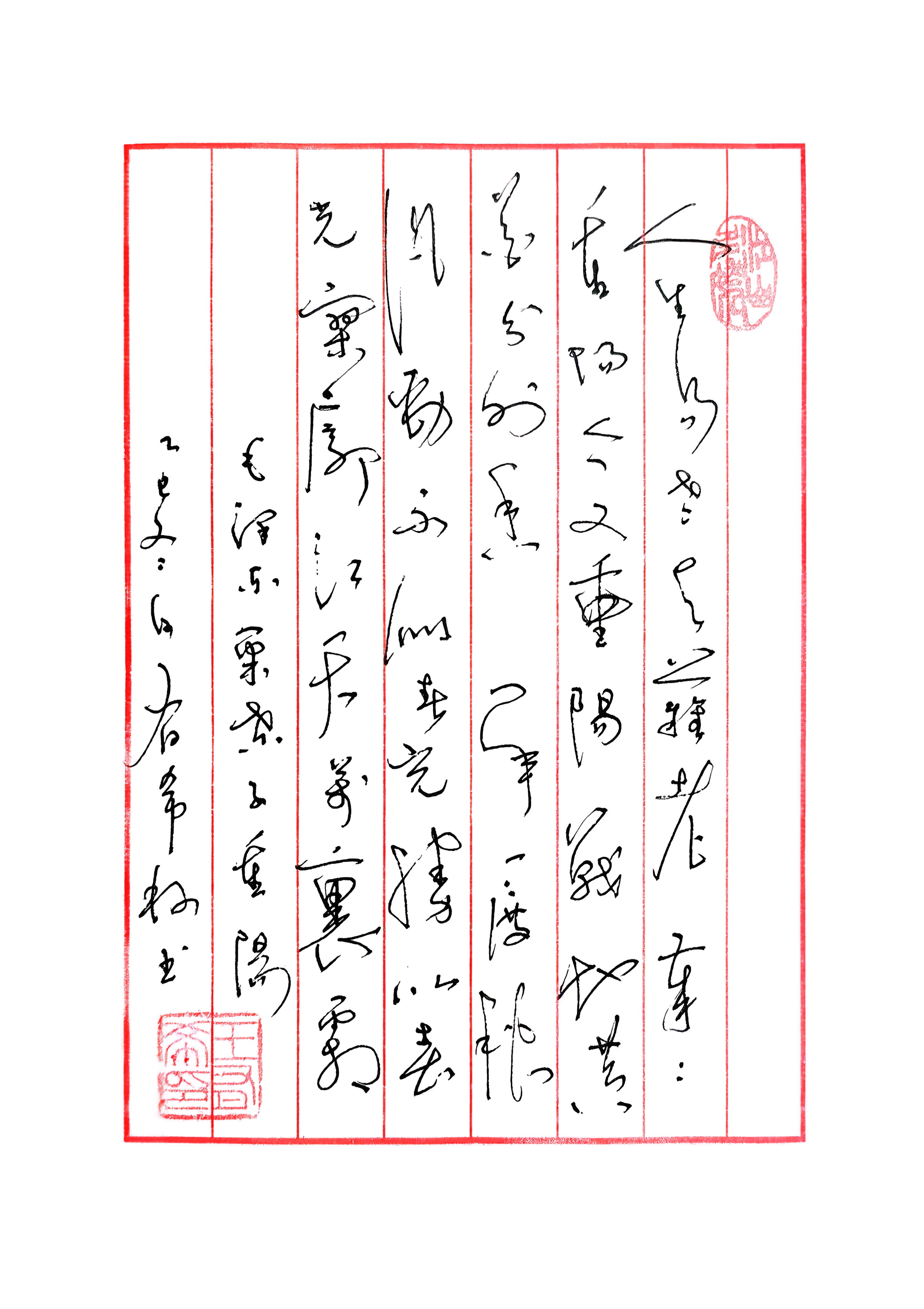 这是一幅以毛泽东《采桑子·重阳》为内容的硬笔草书作品,整体风格明快洒脱,精准呼应了原作中乐观豪迈的秋日情怀,是一件兼具艺术性与感染力的作品。 优点与亮点 1. 笔势灵动,气韵流畅 整幅作品以草书书写,笔画轻盈连绵,字与字之间牵丝映带自然流畅。从开篇“人生易老天难老”到结尾“寥廓江天万里霜”,气韵始终明快连贯,精准传递出原作中战地重阳的开阔与豪情。 2. 字形鲜活,节奏明快 作者在字形处理上灵活多变,“战地黄花分外香”的“香”字舒展飘逸,“一年一度秋风劲”的“劲”字则紧凑有力,大小、疏密的对比让作品富有节奏感。笔画的粗细变化细腻,起笔轻盈、行笔流畅,增强了视觉的灵动性。 3. 章法和谐,意境相融 作品采用红格竖写的传统格式,行与行之间疏密有致,右侧起笔处的印章与左侧落款形成平衡,整体布局和谐。书写风格与《采桑子·重阳》的乐观明快意境完美呼应,让观者在笔墨中感受到原作的积极情怀。 4. 情感细腻,意境鲜活 作者通过笔墨将词中的秋日意趣与革命乐观主义表现得淋漓尽致,“胜似春光”的豁达、“寥廓江天”的开阔,都在灵动的笔势中得到了生动展现,让书法与词作的精神内核高度统一。