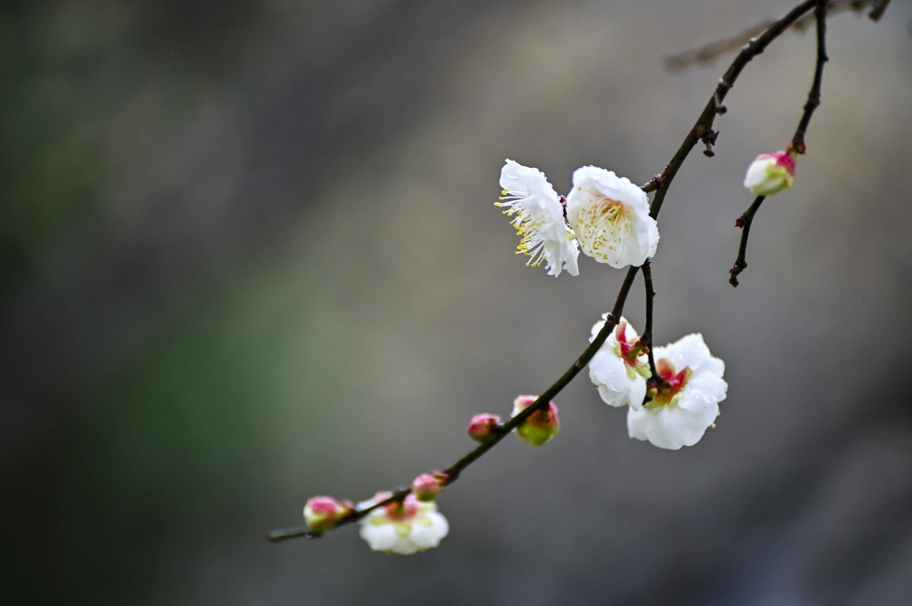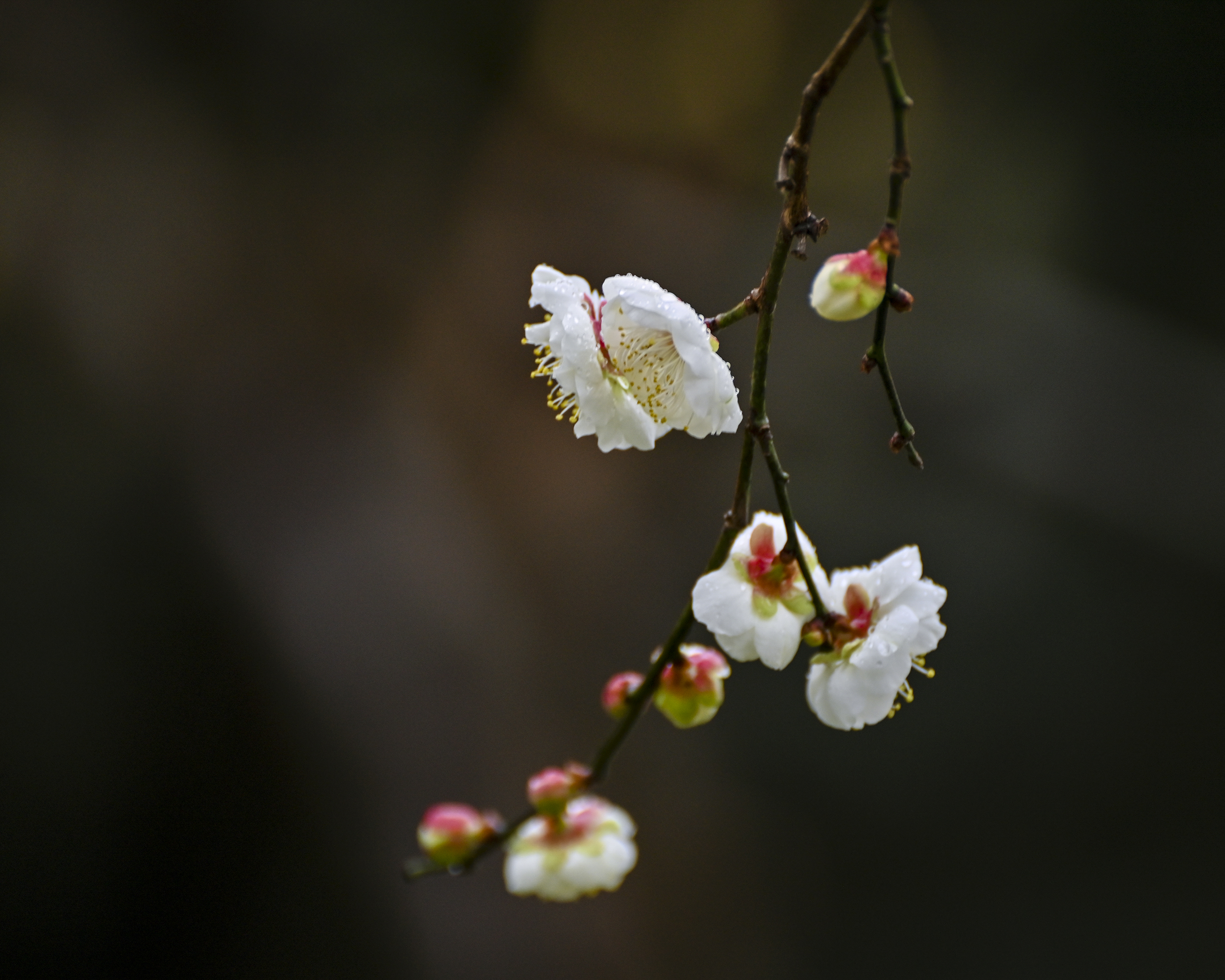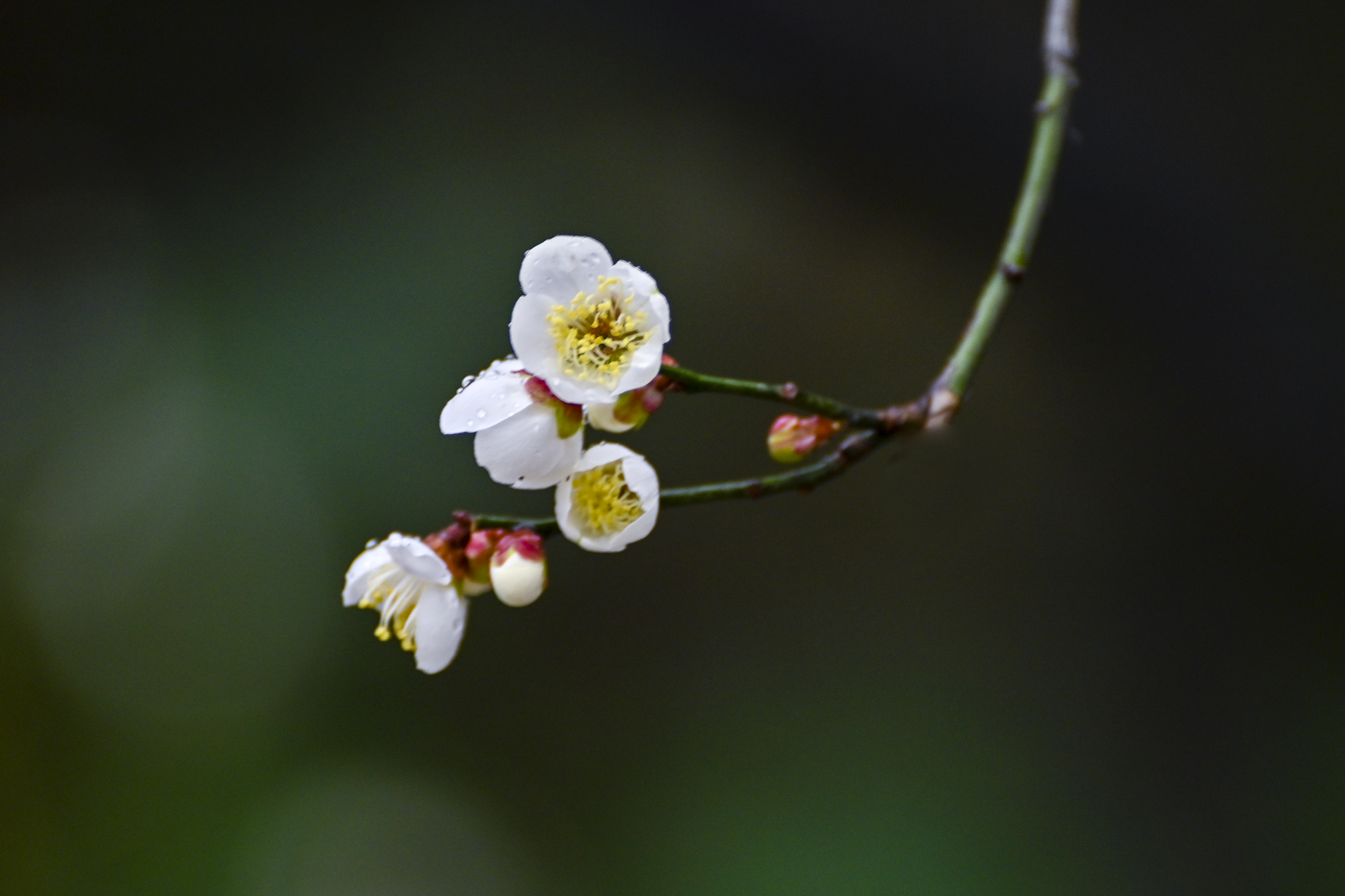 雨后梅枝凝露,白瓣轻颤,花蕊微光,在江南园林的静谧里,春意正悄然洇开。