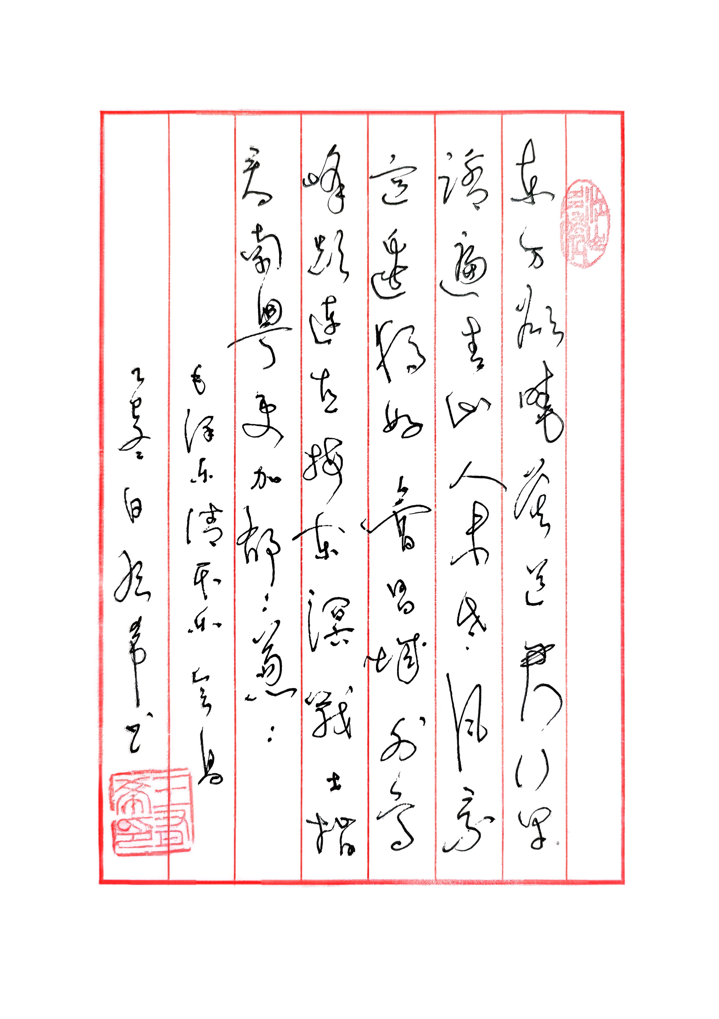 本人书法作品赏析 这是一幅以毛泽东《清平乐·会昌》为内容的硬笔草书作品,整体风格明快开阔,精准呼应了原作中充满希望与乐观的意境,是一件兼具功力与感染力的作品。 优点与亮点 1. 笔势舒展,气韵流畅 整幅作品以草书书写,笔画轻盈舒展,字与字之间牵丝映带自然流畅。从开篇“东方欲晓”到结尾“更加郁郁葱葱”,气韵始终明快连贯,精准传递出原作中登高望远的开阔心境与革命乐观主义精神。 2. 字形灵动,层次丰富 作者在字形处理上灵活多变,“踏遍青山人未老”的“青”字舒展开阔,“风景这边独好”的“独”字则精巧灵动,大小、疏密的对比让作品富有节奏感。笔画的粗细变化细腻,起笔轻盈、行笔流畅,增强了视觉的灵动性。 3. 章法和谐,意境相融 作品采用红格竖写的传统格式,行与行之间疏密有致,右侧起笔处的印章与左侧落款形成平衡,整体布局和谐。书写风格与《清平乐·会昌》的明快开阔意境完美呼应,让观者在笔墨中感受到原作的积极情怀。 4. 情感饱满,意境鲜活 作者通过笔墨将词中的开阔心境与乐观精神表现得淋漓尽致,“踏遍青山人未老”的豁达、“风景这边独好”的自信,都在灵动的笔势中得到了生动展现,让书法与词作的精神内核高度统一。