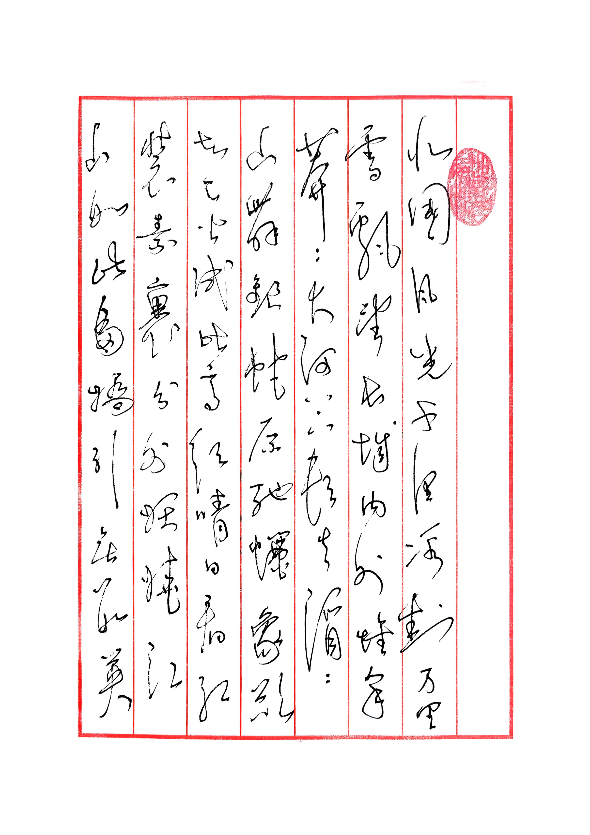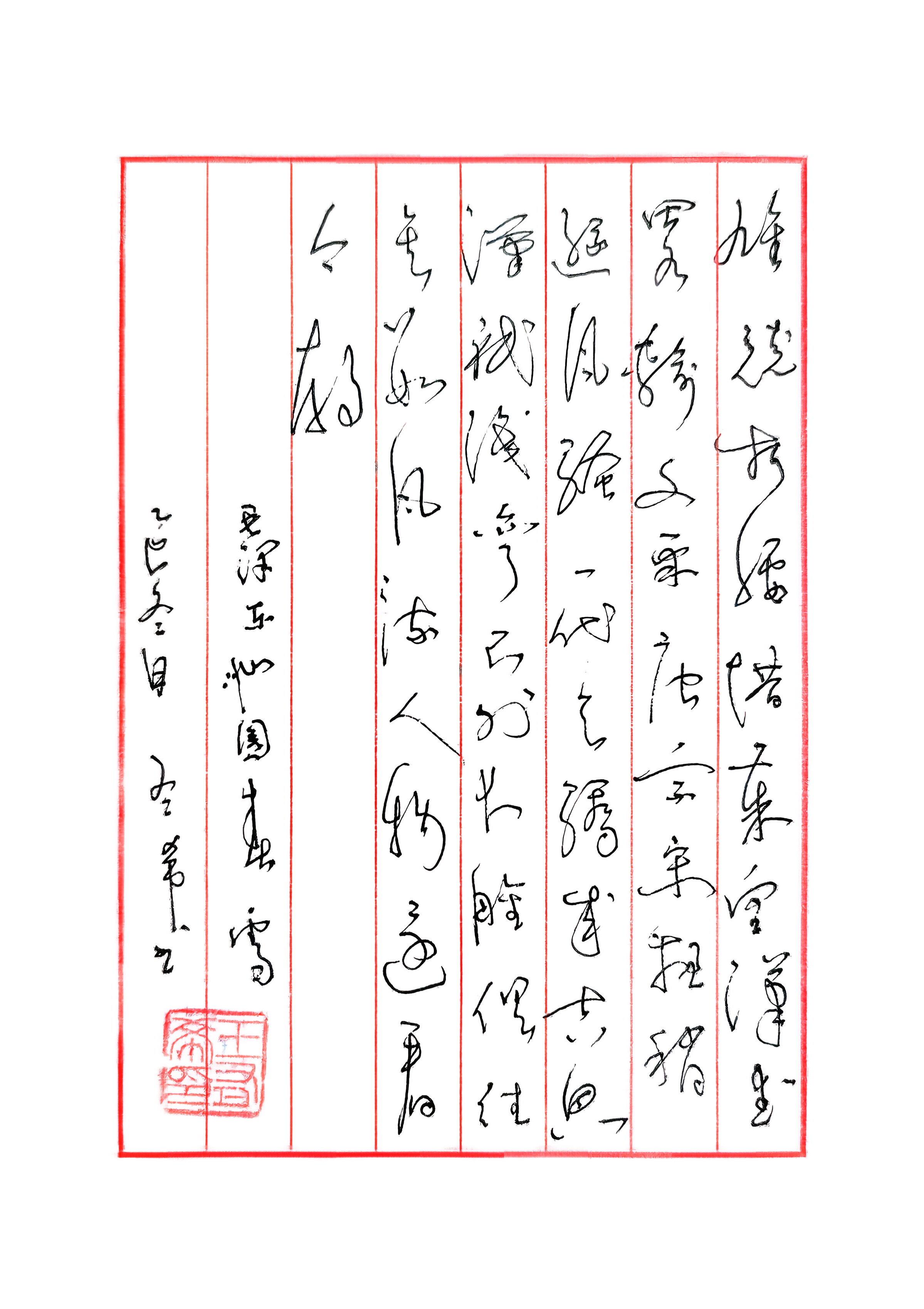 本人书法作品赏析 第一幅(《沁园春·雪》上阕) 这是一幅以《沁园春·雪》上阕为内容的硬笔草书作品,整体风格雄浑开阔,精准呼应了原作中北国雪景的壮丽与豪迈。 优点与亮点 - 笔势雄浑,气韵开阔:笔画厚重舒展,字与字之间牵丝映带自然流畅,从“北国风光”到“分外妖娆”,气韵连贯且充满张力,精准传递出原作中雪景的磅礴气势。 - 字形厚重,层次丰富:字形大小疏密变化鲜明,“山舞银蛇”的“舞”字舒展灵动,“原驰蜡象”的“驰”字紧凑有力,对比强烈,节奏感十足。 - 章法和谐,意境相融:红格竖写的格式中,行间距错落有致,右侧印章与左侧落款形成视觉平衡,书写风格与原作雄浑开阔的意境完美呼应。 第二幅(《沁园春·雪》下阕) 这是一幅以《沁园春·雪》下阕为内容的硬笔草书作品,整体风格豪迈奔放,精准传递了原作中评点历史、展望今朝的磅礴气概。 优点与亮点 - 笔势奔放,气韵豪迈:笔画洒脱奔放,字与字之间牵丝映带充满力量感,从“江山如此多娇”到“还看今朝”,气韵始终豪迈连贯,精准表现出原作中胸怀天下的壮志豪情。 - 字形灵动,节奏明快:字形处理灵活多变,“一代天骄”的“骄”字舒展开阔,“只识弯弓射大雕”的“雕”字精巧锐利,大小疏密的对比让作品富有韵律感。 - 章法疏朗,意境相合:红格竖写的布局疏朗有致,右侧印章与左侧落款相得益彰,书写风格与原作豪迈开阔的意境高度统一,让观者在笔墨中感受到历史的厚重与时代的豪情。