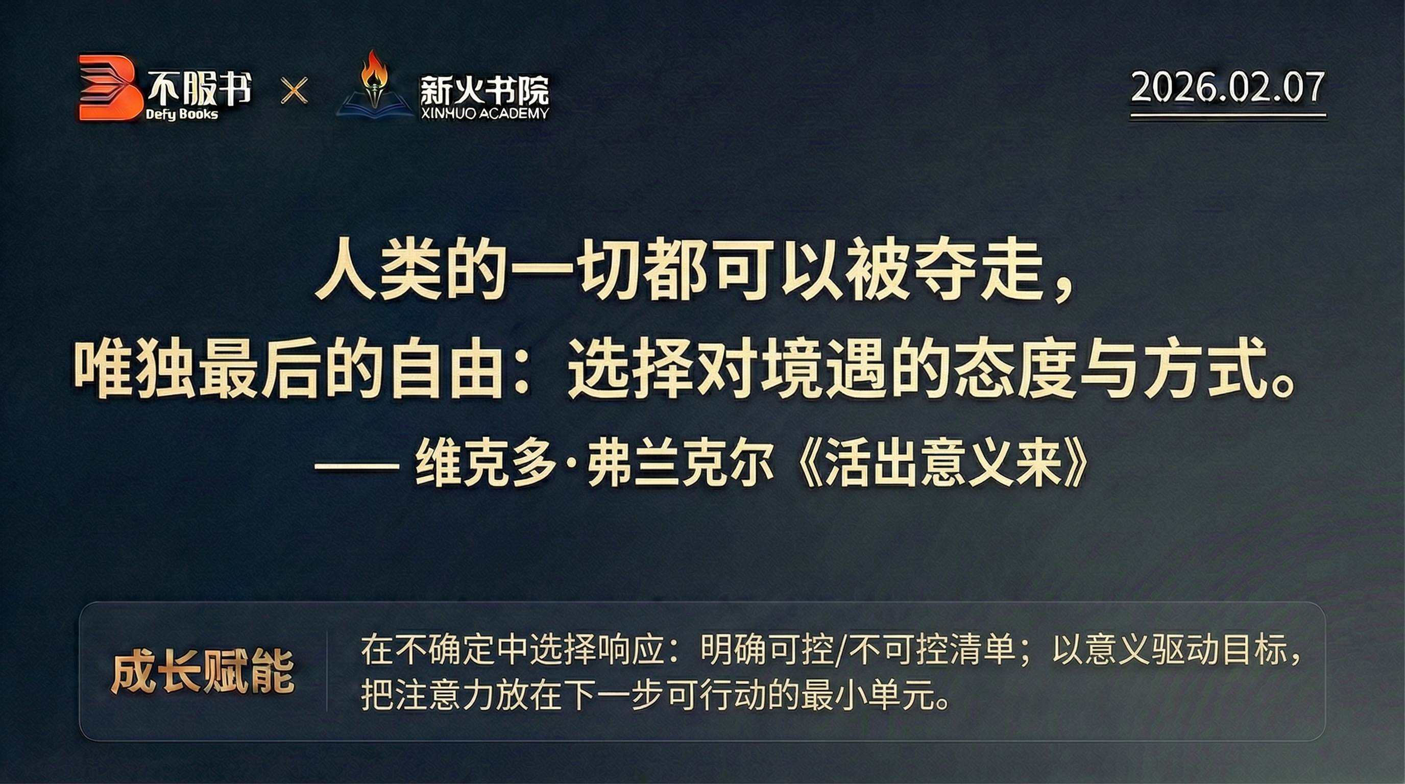 【每日分享】 各位书友早安!周末愉快。今天是2月7日,周六。 今日为您分享维克多·弗兰克尔《活出意义来》中震撼心灵的终极自由:“人类的一切都可以被夺走,唯独最后的自由:选择对境遇的态度与方式。” 我们在生活中常感到无力,仿佛被环境、KPI或他人的评价推着走。但弗兰克尔用他在集中营的亲身经历告诉我们:由于外部环境我们无法控制,但“如何回应”的选择权永远在你手中。 《活出意义来》为我们指出了一条穿越迷茫的路径: • 区分清单:明确哪些是“不可控的”(接纳它),哪些是“可控的”(死磕它)。 • 意义驱动:不要问“生活能给我什么”,而要问“我能为眼前的生活赋予什么意义”。 当我们把注意力聚焦在“下一步具体可行的最小单元”时,焦虑就会转化为行动的力量。 愿大家这个周末,无论身处何种境遇,都能行使那份最后的自由,活出属于自己的意义。 【互动话题】 “如果你觉得最近有些失控,试着列出一件今天你绝对能掌控的小事(比如整理书桌、读10页书),做完它,找回你的控制权。”