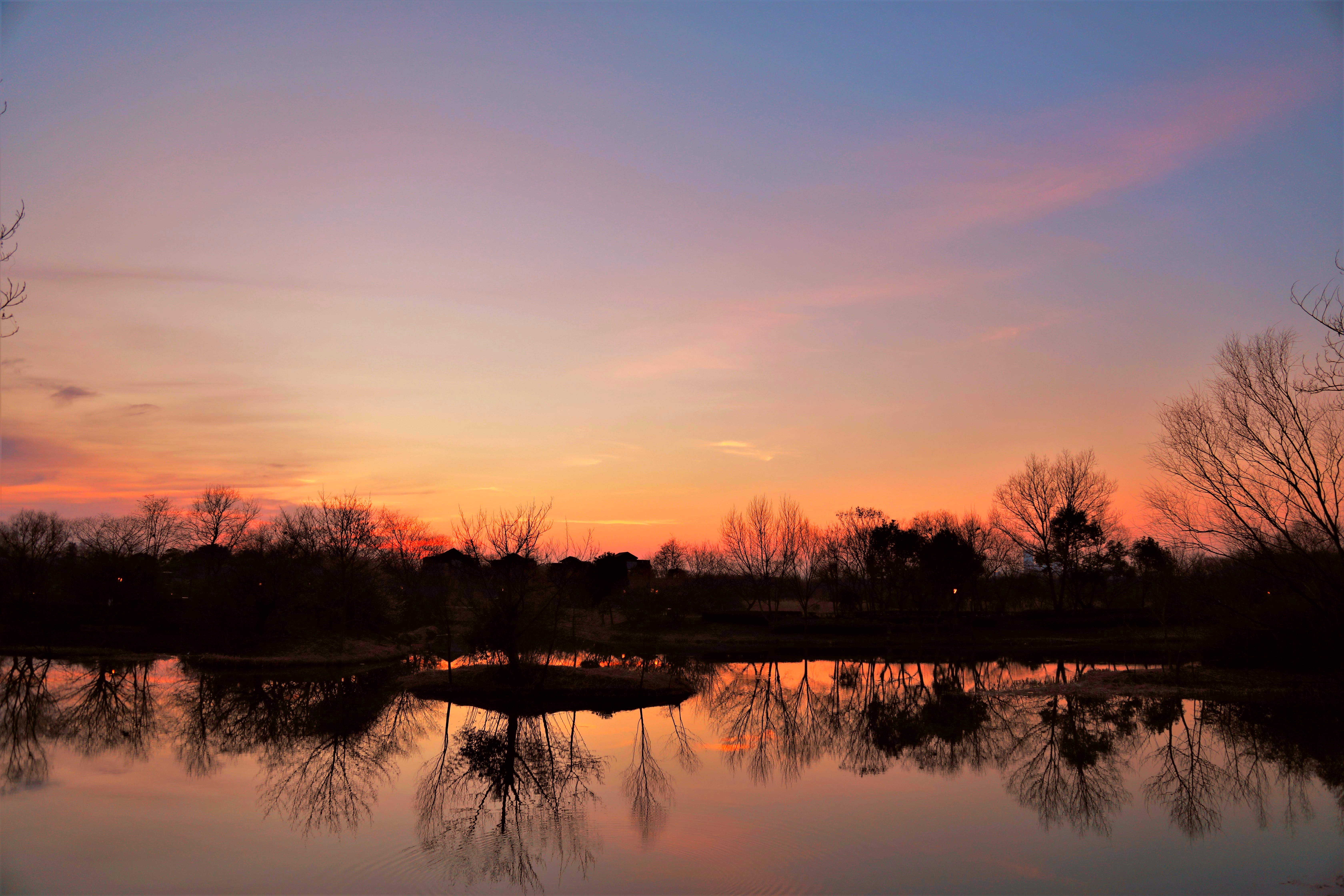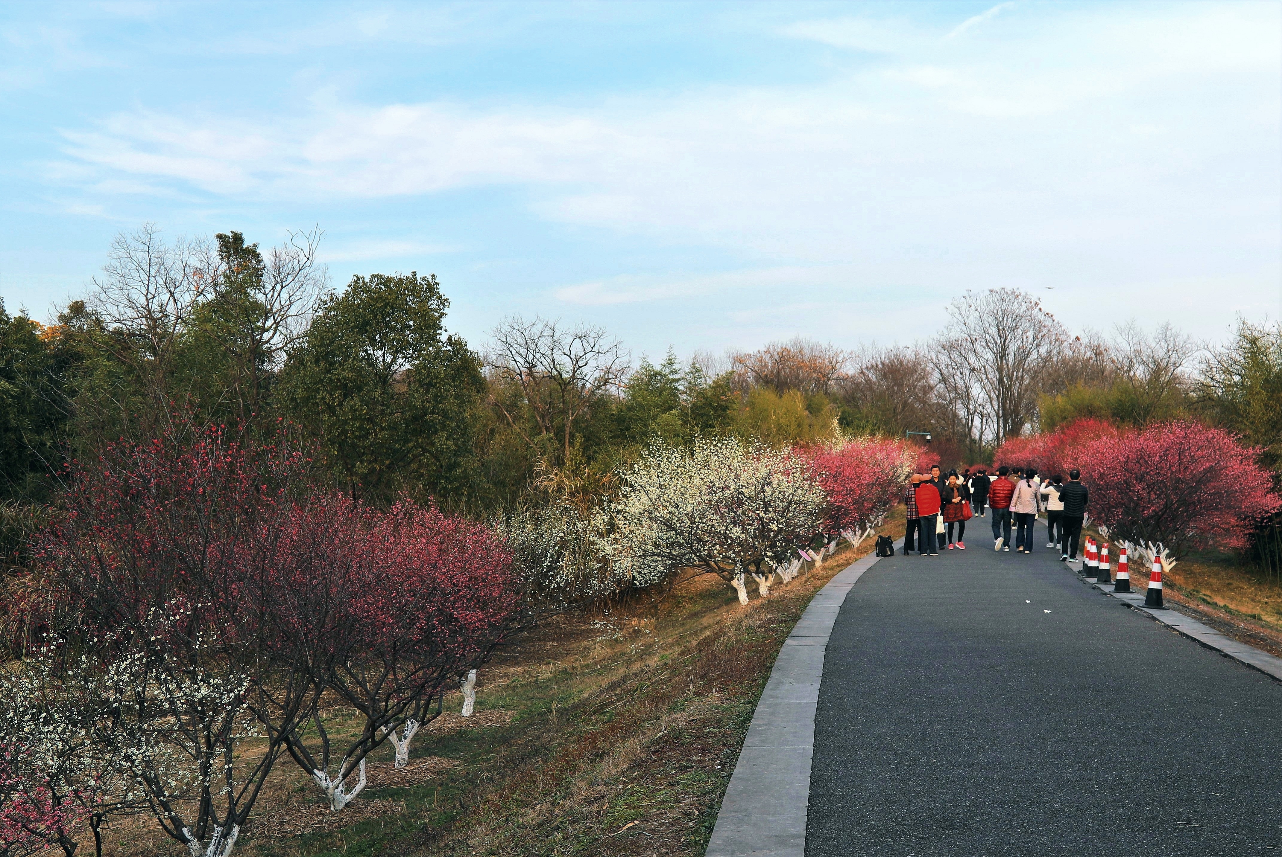西溪湿地,橙红天幕低垂,枯枝剪影静立水边。粉白梅花沿小径次第绽放,倒映于如镜的湖面。游人缓步,风过处,涟漪轻漾,揉碎一池霞光。此刻,时光也放慢了脚步。