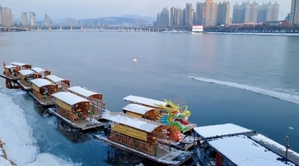 雪落长汀,寒江如镜。 木舟覆雪,静泊在冰蓝之间,龙首画舫凝霜不语,仿佛在聆听冰封的江水讲述冬的密语。远处高楼与长桥在薄雾中若隐若现,与眼前的素净雪色相映成趣。 凛冽的风里,是独属于北国江城的清寂与辽阔,冷而不寒,静却生暖。