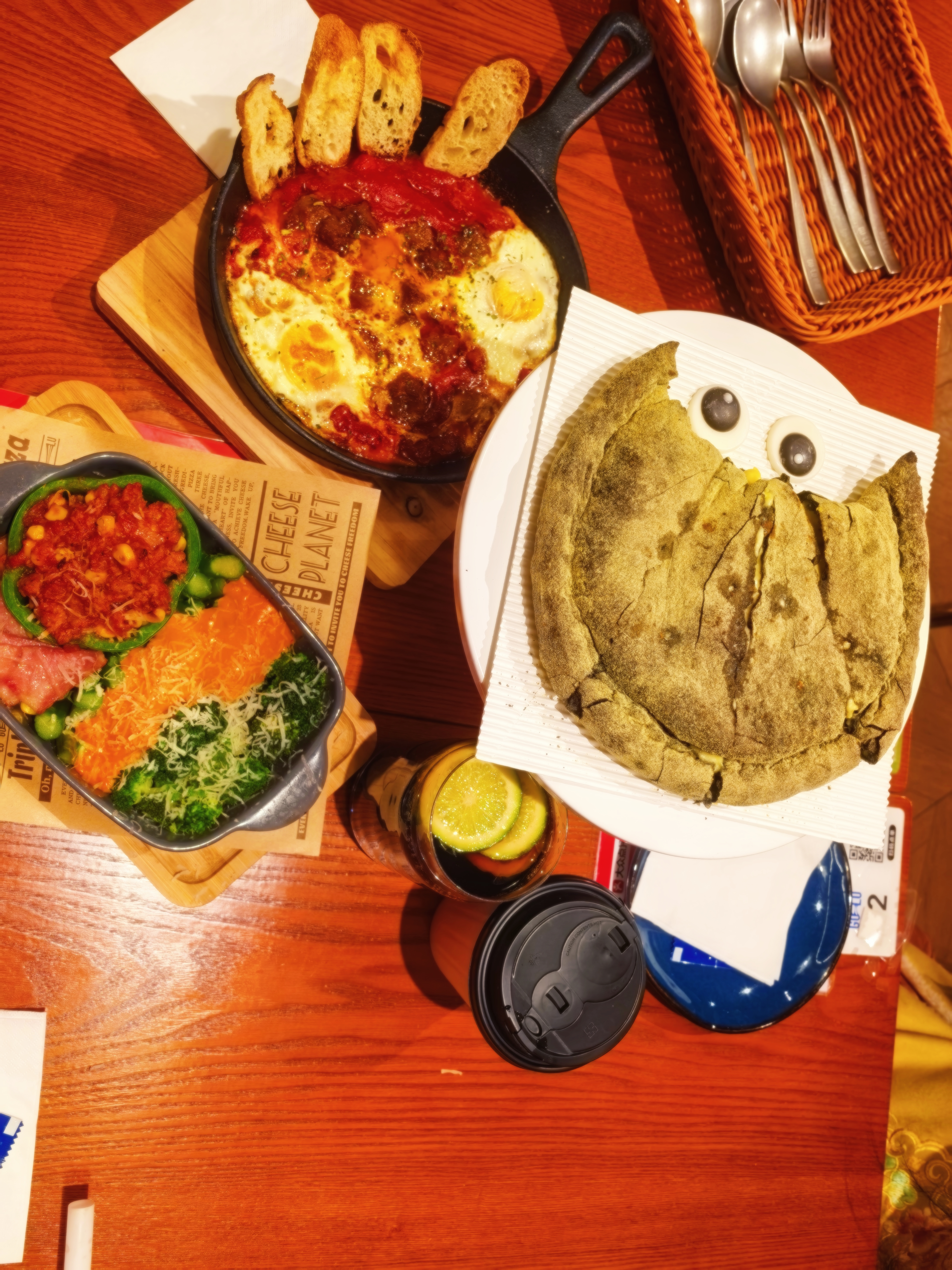 幸福充电站⚡️被可爱和芝士填满的雨夜✨ 冻手冻脚的冬夜,雨声滴滴答答 这种时候 最需要躲进一个暖呼呼的洞穴里 和能接住所有废话的朋友 吃让眼睛先笑的可爱食物 🍴咕鹿流心披萨(静安华山路店) 藏在华山路的温暖地下一层 推开门就像跌进童话书📖 云朵灯在头顶飘 手绘星星朝你眨眼睛 陷进懒人沙发的瞬间 今天所有的疲惫都被没收啦🎈 🖤「黑金榴莲披萨」直接击中我的心巴! 墨鱼汁饼底像夜空 躺着一轮芝士月亮🌙 轻轻拎起一角——拉丝像银河一样垂下来! 榴莲果肉多到溢出 和奶香芝士缠绕在舌尖 热乎乎咬下去 雨天emo都被甜甜融化了😭 🥘慢炖牛肉北非蛋|彩椒焗肉蔬菜碗 暖融融的治愈系咸口组合 戳开溏心蛋的瞬间好解压~ 🍋柠檬可乐咕嘟冒泡|捧杯热乌龙茶看窗外雨痕 “食物会把温度 借给每一个需要温暖的灵魂” 💡小彩蛋:门口装置艺术超好拍! 我们裹着毛衣在雨夜街灯下笑成一团 原来最好的充电方式 是和喜欢的人 一起吃好多顿可爱的饭🌼 ✨今日感悟: 生活有时湿漉漉的 但总有地方为你亮着暖光灯 把烦心事卷进拉丝的芝士里 咬一口 明天又会是崭新的一天呀